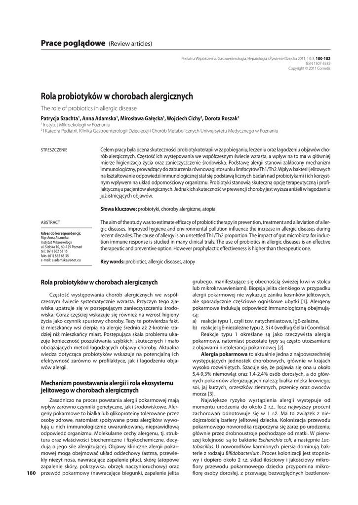 Prace poglądowe (Review articles) Pediatria Współczesna. Gastroenterologia, Hepatologia i Żywienie Dziecka 2011, 13, 3, 180-182 ISSN 1507-5532 Copyright © 2011 Cornetis Rola probiotyków w chorobach alergicznych The role of probiotics in allergic disease Patrycja Szachta1, Anna Adamska1, Mirosława Gałęcka1, Wojciech Cichy2, Dorota Roszak2 1 Instytut Mikroekologii w Poznaniu I Katedra Pediatrii, Klinika Gastroenterologii Dziecięcej i Chorób Metabolicznych Uniwersytetu Medycznego w Poznaniu 2 STRESZCZENIE Celem pracy była ocena skuteczności probiotykoterapii w zapobieganiu, leczeniu oraz łagodzeniu objawów chorób alergicznych. Częstość ich występowania we współczesnym świecie wzrasta, a wpływ na to ma w główniej mierze higienizacja życia oraz zanieczyszczenie środowiska. Podstawę alergii stanowi zakłócony mechanizm immunologiczny, prowadzący do zaburzenia równowagi stosunku limfocytów Th1/Th2. Wpływ bakterii jelitowych na kształtowanie odpowiedzi immunologicznej stał się podstawą licznych badań nad probiotykami i ich korzystnym wpływem na układ odpornościowy organizmu. Probiotyki stanowią skuteczną opcję terapeutyczną i profilaktyczną u pacjentów alergicznych. Jednak ich skuteczność w prewencji choroby jest wyższa aniżeli w łagodzeniu już istniejących objawów. Słowa kluczowe: probiotyki, choroby alergiczne, atopia ABSTRACT Adres do korespondencji: Mgr Anna Adamska Instytut Mikroekologii ul. Sielska 10, 60-129 Poznań tel.: (61) 862 63 15 faks: (61) 862 63 35 e-mail: [email protected] The aim of the study was to estimate efficacy of probiotic therapy in prevention, treatment and alleviation of allergic diseases. Improved hygiene and environmental pollution influence the increase in allergic diseases during recent decades. The cause of allergy is an unsettled Th1/Th2 proportion. The impact of gut microbiota for induction immune response is studied in many clinical trials. The use of probiotics in allergic diseases is an effective therapeutic and preventive option. However prophylactic effectiveness is higher than therapeutic one. Key words: probiotics, allergic diseases, atopy Rola probiotyków w chorobach alergicznych Częstość występowania chorób alergicznych we współczesnym świecie systematycznie wzrasta. Przyczyn tego zjawiska upatruje się w postępującym zanieczyszczeniu środowiska. Coraz częściej wskazuje się również na wzrost higieny życia jako czynnik spustowy choroby. Tezy te potwierdza fakt, iż mieszkańcy wsi cierpią na alergię średnio aż 2-krotnie rzadziej niż mieszkańcy miast. Postępująca skala problemu ukazuje konieczność poszukiwania szybkich, skutecznych i mało obciążających metod łagodzących objawy choroby. Aktualna wiedza dotycząca probiotyków wskazuje na potencjalną ich efektywność zarówno w profilaktyce, jak i łagodzeniu objawów alergii. Mechanizm powstawania alergii i rola ekosystemu jelitowego w chorobach alergicznych Zasadniczo na proces powstania alergii pokarmowej mają wpływ zarówno czynniki genetyczne, jak i środowiskowe. Alergeny pokarmowe to białka lub glikoproteiny tolerowane przez osoby zdrowe, natomiast spożywane przez alergików wywołują u nich immunologicznie uwarunkowaną, nieprawidłową odpowiedź organizmu. Molekularne cechy alergenu, tj. struktura oraz właściwości biochemiczne i fizykochemiczne, decydują o jego sile alergizującej. Objawy kliniczne alergii pokarmowej mogą obejmować układ oddechowy (astma, przewlekły nieżyt nosa, nawracające zapalenie płuc), skórę (atopowe zapalenie skóry, pokrzywka, obrzęk naczynioruchowy) oraz 180 przewód pokarmowy (nawracające biegunki, zapalenie jelita grubego, manifestujące się obecnością świeżej krwi w stolcu lub mikrokrwawieniami). Biopsja jelita cienkiego w przypadku alergii pokarmowej nie wykazuje zaniku kosmków jelitowych, ale sporadycznie częściowe ogniskowe ubytki [1]. Alergeny pokarmowe indukują odpowiedź immunologiczną obejmującą: a) reakcje typu 1, czyli tzw. natychmiastowe, IgE-zależne, b) reakcje IgE-niezależne typu 2, 3 i 4 (według Gella i Coombsa). Reakcje typu 1 określane są jako rzeczywista alergia pokarmowa, natomiast pozostałe typy są często utożsamiane z objawami nietolerancji pokarmowej [2]. Alergia pokarmowa to aktualnie jedna z najpowszechniej występujących jednostek chorobowych, głównie w krajach wysoko rozwiniętych. Szacuje się, że pojawia się ona u około 5,4-9,3% niemowląt oraz 1,4-2,4% osób dorosłych, a do głównych pokarmów alergizujących należą: białka mleka krowiego, soi, jaj kurzych, orzeszków ziemnych, pszenicy oraz owoców morza [3]. Największe ryzyko wystąpienia alergii występuje od momentu urodzenia do około 2 r.ż., lecz najwyższy procent zachorowań odnotowuje się w 1 r.ż. Ma to związek z niedojrzałością bariery jelitowej dziecka. Kolonizacja przewodu pokarmowego noworodka rozpoczyna się zaraz po urodzeniu, głównie przez drobnoustroje pochodzące od matki. W pierwszej kolejności są to bakterie Escherichia coli, a następnie Lactobacillus. U noworodków karmionych piersią dominują bakterie z rodzaju Bifidobacterium. Proces kolonizacji jest stopniowy i dopiero około 2 r.ż. skład ilościowy i jakościowy mikroflory przewodu pokarmowego dziecka przypomina mikroflorę osoby dorosłej, z przewagą bezwzględnych beztlenow- Pediatr. Współcz. Gastroenterol. Hepatol. Żywienie Dziecka 2011, 13, 3, 180-182 ców Bacteroides. Ponadto niepatogenne formy bakterii, które jako pierwsze kolonizują przewód pokarmowy dziecka, stają się jednymi z pierwszych antygenów stymulujących rozwój oraz dojrzewanie układu immunologicznego [4]. Prawidłowy ekosystem jelitowy stanowi przeciwwagę dla aktywności limfocytów Th2, a w konsekwencji sprzyja powstawaniu tolerancji pokarmowej. Podstawą alergii jest zakłócony mechanizm immunologiczny, prowadzący do zaburzenia równowagi stosunku limfocytów Th1/Th2 na korzy