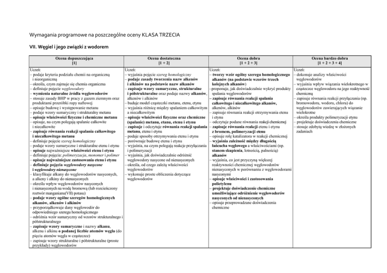 Wymagania programowe na poszczególne oceny KLASA TRZECIA VII. Węgiel i jego związki z wodorem Ocena dopuszczająca [1] Uczeń: – podaje kryteria podziału chemii na organiczną i nieorganiczną – określa, czym zajmuje się chemia organiczna – definiuje pojęcie węglowodory – wymienia naturalne źródła węglowodorów – stosuje zasady BHP w pracy z gazem ziemnym oraz produktami przeróbki ropy naftowej – opisuje budowę i występowanie metanu – podaje wzory sumaryczny i strukturalny metanu – opisuje właściwości fizyczne i chemiczne metanu – opisuje, na czym polegają spalanie całkowite i niecałkowite – zapisuje równania reakcji spalania całkowitego i niecałkowitego metanu – definiuje pojęcie szereg homologiczny – podaje wzory sumaryczne i strukturalne etenu i etynu – opisuje najważniejsze właściwości etenu i etynu – definiuje pojęcia: polimeryzacja, monomer i polimer – opisuje najważniejsze zastosowania etenu i etynu – definiuje pojęcia węglowodory nasycone i węglowodory nienasycone – klasyfikuje alkany do węglowodorów nasyconych, a alkeny i alkiny do nienasyconych – określa wpływ węglowodorów nasyconych i nienasyconych na wodę bromową (lub rozcieńczony roztwór manganianu(VII) potasu) – podaje wzory ogólne szeregów homologicznych alkanów, alkenów i alkinów – przyporządkowuje dany węglowodór do odpowiedniego szeregu homologicznego – odróżnia wzór sumaryczny od wzorów strukturalnego i półstrukturalnego – zapisuje wzory sumaryczne i nazwy alkanu, alkenu i alkinu o podanej liczbie atomów węgla (do pięciu atomów węgla w cząsteczce) – zapisuje wzory strukturalne i półstrukturalne (proste przykłady) węglowodorów Ocena dostateczna [1 + 2] Uczeń: – wyjaśnia pojęcie szereg homologiczny – podaje zasady tworzenia nazw alkenów i alkinów na podstawie nazw alkanów – zapisuje wzory sumaryczne, strukturalne i półstrukturalne oraz podaje nazwy alkanów, alkenów i alkinów – buduje model cząsteczki metanu, etenu, etynu – wyjaśnia różnicę między spalaniem całkowitym a niecałkowitym – opisuje właściwości fizyczne oraz chemiczne (spalanie) metanu, etanu, etenu i etynu – zapisuje i odczytuje równania reakcji spalania metanu, etenu i etynu – podaje sposoby otrzymywania etenu i etynu – porównuje budowę etenu i etynu – wyjaśnia, na czym polegają reakcje przyłączania i polimeryzacji – wyjaśnia, jak doświadczalnie odróżnić węglowodory nasycone od nienasyconych – określa, od czego zależą właściwości węglowodorów – wykonuje proste obliczenia dotyczące węglowodorów Ocena dobra [1 + 2 + 3] Uczeń: – tworzy wzór ogólny szeregu homologicznego alkanów (na podstawie wzorów trzech kolejnych alkanów) –proponuje, jak doświadczalnie wykryć produkty spalania węglowodorów – zapisuje równania reakcji spalania całkowitego i niecałkowitego alkanów, alkenów, alkinów – zapisuje równania reakcji otrzymywania etenu i etynu – odczytuje podane równania reakcji chemicznej – zapisuje równania reakcji etenu i etynu z bromem, polimeryzacji etenu – opisuje rolę katalizatora w reakcji chemicznej – wyjaśnia zależność między długością łańcucha węglowego a właściwościami (np. stanem skupienia, lotnością, palnością) alkanów – wyjaśnia, co jest przyczyną większej reaktywności chemicznej węglowodorów nienasyconych w porównaniu z węglowodorami nasyconymi – opisuje właściwości i zastosowania polietylenu – projektuje doświadczenie chemiczne umożliwiające odróżnienie węglowodorów nasyconych od nienasyconych – opisuje przeprowadzane doświadczenia chemiczne Ocena bardzo dobra [1 + 2 + 3 + 4] Uczeń: – dokonuje analizy właściwości węglowodorów – wyjaśnia wpływ wiązania wielokrotnego w cząsteczce węglowodoru na jego reaktywność chemiczną – zapisuje równania reakcji przyłączania (np. bromowodoru, wodoru, chloru) do węglowodorów zawierających wiązanie wielokrotne – określa produkty polimeryzacji etynu – projektuje doświadczenia chemiczne – stosuje zdobytą wiedzę w złożonych zadaniach Wybrane wiadomości i umiejętności wykraczające poza treści wymagań podstawy programowej; ich nabycie przez ucznia może być podstawą do wystawienia oceny celującej. Uczeń: – potrafi wykryć obecność węgla i wodoru w związkach organicznych – wyjaśnia pojęcie piroliza metanu – wyjaśnia pojęcie destylacja frakcjonowana ropy naftowej – wymienia produkty destylacji frakcjonowanej ropy naftowej – określa właściwości i zastosowania produktów destylacji frakcjonowanej ropy naftowej – omawia jakie skutki dla środowiska przyrodniczego, ma wydobywanie i wykorzystywanie ropy naftowej – wyjaśnia pojęcia: izomeria, izomery – wyjaśnia pojęcie kraking – zapisuje równanie reakcji podstawienia (substytucji) – charakteryzuje tworzywa sztuczne – podaje właściwości i zastosowania wybranych tworzyw sztucznych – wymienia przykładowe oznaczenia opakowań wykonanych z polietylenu VIII. Pochodne węglowodorów Ocena dopuszczająca [1] Uczeń: – dowodzi, że alkohole, kwasy karboksylowe, estry, aminy, aminokwasy są pochodnymi węglowodorów – opisuje budowę pochodnych węglowodorów (grupa węglowodorowa + grupa funkcyjna) – wymienia pierwiastki chemiczne wchodzące w skład pochodnych węglowodorów – klasyfikuje daną substancję organiczną do odpowiedniej grupy związków chemicznych – określa, co to jest grupa funkcyjna – zaznacza grupy funkcyjne w alkoholach, kwasach karboksylowych, estrach, aminach i aminokwasach i podaje ich nazwy – zapisuje wzory ogólne alkoholi, kwasów karboksylowych i estrów – zapisuje wzory sumaryczne i strukturalne prostych alkoholi monohydroksylowych i kwasów karboksylowych (do 2 atomów węgla w cząsteczce) oraz tworzy ich nazwy – zaznacza we wzorze kwasu karboksylowego resztę kwasową – określa, co to