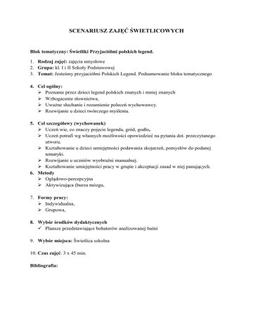SCENARIUSZ ZAJĘĆ ŚWIETLICOWYCH Blok tematyczny: Świetliki Przyjaciółmi polskich legend. 1. Rodzaj zajęć: zajęcia umysłowe 2. Grupa: kl. I i II Szkoły Podstawowej 3. Temat: Jesteśmy przyjaciółmi Polskich Legend. Podsumowanie bloku tematycznego 4. Cel ogólny: Poznanie przez dzieci legend polskich znanych i mniej znanych Wzbogacenie słownictwa, Uważne słuchanie i rozumienie poleceń wychowawcy. Rozwijanie u dzieci twórczego myślenia. 5. Cel szczegółowy (wychowanek) Uczeń wie, co znaczy pojęcie legenda, gród, godło, Uczeń potrafi wg własnych możliwości opowiedzieć na pytania dot. przeczytanego utworu. Kształtowanie u dzieci umiejętności podawania skojarzeń, pomysłów do podanej tematyki. Rozwijanie u uczniów wyobraźni manualnej. Kształtowanie umiejętności pracy w grupie i akceptacji zasad w niej panujących. 6. Metody Oglądowo-percepcyjna Aktywizująca (burza mózgu, 7. Formy pracy: Indywidualna, Grupowa, 8. Wybór środków dydaktycznych Plansze przedstawiające bohaterów analizowanej baśni 9. Wybór miejsca: Świetlica szkolna 10. Czas zajęć: 3 x 45 min. Bibliografia: Temat: Jesteśmy przyjaciółmi Polskich Legend. Podsumowanie bloku tematycznego Realizacja tematu: 1. Wychowawca zaprasza dzieci do zajęć. Na początku spotkania zabawa orientacyjnoporządkowa pt: ,, Mruczeka” Uczestnicy siedzą skrzyżnie lub leżą przodem tworząc koło lub półkole, w środku którego siedzi „Mruczek”. Mruczek przywołuje do siebie na migi kogoś z obwodu koła. Wezwany podnosi się jak najciszej z zajmowanego miejsca i stara się bezszelestnie dostać do „Mruczka”. Ten zaś, jak i pozostali uczestnicy, pilnie śledzi ruchy wezwanego. Jeżeli wezwanemu uda się dostać do Mruczka bez wywołania żadnego szmeru, wówczas ten ustępuje z zajmowanego miejsca. W przeciwnym wypadku Mruczek odsyła wezwanego na miejsce i wzywa kogoś innego. 2. Nauczyciel wprowadza dzieci do tematu. Przedstawia uczniom temat dzisiejszego spotkania oraz zachęca do aktywnego udziału w zajęciach. 3. Wychowawca prosi jedno dziecko na ochotnika, by znalazło w świetlicy tajemniczy kufer, w którym schowany jest zaczarowany list. Następnie kufer znajduje swoje miejsce w środku koła. Nauczyciel czyta list, w którym tajemnicza postać zaprasza dzieci do wspólnej pracy, po której każdy z nich zostanie mianowany znawcą legend polskich. Zadanie A Na złączonych stolikach rozłożony jest szary papier, na którym dzieci wykonują mapę myśli dot. Legend Polskich. Zadanie B Ukryta wiadomość Rozwiąże tajemnicze zagadki schowane na terenie szkoły np. w sekretariacie, u Pań wychowawczyń, u o. Piotra i o. dyr. Rozwiązane zagadki dostarczamy wychowawcy świetlicy. Zadanie C Krzyżówka Zadanie D Liderzy grup losują tytuły Legend Polskich i próbują wspólnie pokazać w formie pantonimy tytuł innym dzieciom. Zadanie E Wykonujemy stronę tytułową do wybranej legendy. Z pośród podanych poniżej tytułów wybieramy jedną pracę techniką dowolną. 4. Nauczyciel zaprasza dzieci do zabawy integrującej pt: Zamki i księżniczki. Dzieci dobierają się trójkami. Dwie osoby trzymają się za ręce (są zamkiem), trzecia osoba stoi w środku (to księżniczka). Jedna osoba, która rozpoczyna zabawę stoi sama i ma do wyboru trzy komendy: ZAMKI (wtedy zamki poruszają się i szukają innej księżniczki) KSIĘŻNICZKI (wtedy księżniczka opuszcza zamek i szuka innego) TRZĘSIENIE ZIEMI (wszyscy tworzą nowe zamki i księżniczki - łączą się ponownie w nowe trójki) 5. Nauczyciel podsumowuje zajęcia. Wręcza wszystkim uczestnikom oznaczenia Znawcy Legend polskich. Wspólnie wykonują gazetkę dot. omówionego bloku tematycznego. 6. Porządkowanie świetlicy. Opracowały: mgr Barbara Brzozowska- wychowawca świetlicy- pedagog mgr Ewelina Chrzan- wychowawca kl. I Zad. A zał. 1 Zad. C Rozwiąż krzyżówkę (zał. 2) 1. Miasto koziołków. 2. Mieszkał pod wzgórzem wawelskim. 3. Miasto z kopalnią soli. 4. Wiano królowej Kingi. 5. W tym mieście mieszkał smok. 6. Żona Bolesława wstydliwego. 7. Wskazał Lechowi miejsce na gród. 8. Szukał skarbu złotej kaczki. 9. Gonili go po puszczy trzej bracia. 10. Zaprowadził koziołki na wieżę. 11. Jasnowłosy założyciel Gniezna. 12. W herbie Warszawy. 13. Polska królowa, która „Niemca nie chciała”. 14. Imię niemieckiego księcia, który chciał poślubić Wandę. HASŁO BRZMI:…………………………….. Zadanie B (Zał. 3) SPRAWNOŚC ZNAWCA LEGEND POLSKICH Piękną była postacią (człowiek ryba) wyłaniała się z Wisły i uroczo śpiewała. Wypływała z rzeki tylko w pełni księżyca. Tajemnicza postać jest ukryta w herbie Warszawy? Odp. _ _ _ _ _ _ _ _ _ _ Data ………………. _______ Podpis osoby (dorosłej) ………………………… W podziemiach pałacu, w jeziorku pływa to _ _ _ _ _ _ _ _ _ _ _ (mała, złote piórka miała i koronę lśniącą). Kiedyś była piękną księżniczką, teraz skarbów stolicy broni. Data ………………. Podpis osoby (dorosłej) ………………………… 1. Trzech braci ( _ _ _ _, _ _ __ _, _ _ _ ) wędrowali, by swoje grody założyć. 2. Od czego nazwany został pierwszy gród (miejsce gdzie znajdował się orzeł na literę G- _ _ _ _ _ _ _). 3. Jaki ptak znajduje się w godle Polski? _ _ _ _ _ Data ………………. Podpis osoby (dorosłej) ………………………… Tajemniczy smok-bestia mieszkający w podziemiach Warszawy. _ _ _ _ _ _ _ _ _ spojrzał w lustra i padł pokonany. Data ………………. Podpis osoby (dorosłej) ………………………… Piękna księżniczka, córka króla Kraka, która broniła swojego grodu i ludu, nie chciała wyjść za mąż za księcia Rydygiera, ze smutku rzuciła się do Wisły. Data ………………. Podpis osoby (dorosłej) ………………………… Po krakowskim Rynku brodacz w czapce goni, na małym koniku to właśnie _ _ _ _ _ _ _ _ Data ………………. Podpis os