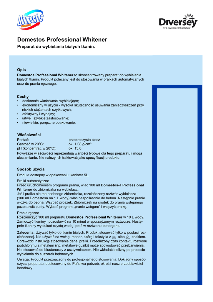 Domestos Professional Whitener Preparat do wybielania białych tkanin. Opis Domestos Professional Whitener to skoncentrowany preparat do wybielania białych tkanin. Produkt polecany jest do stosowania w pralkach automatycznych oraz do prania ręcznego. Cechy • • • • • doskonałe właściwości wybielające; ekonomiczny w użyciu - wysoka skuteczność usuwania zanieczyszczeń przy niskich stężeniach użytkowych; efektywny i wydajny; łatwe i szybkie zastosowanie; niewielkie, poręczne opakowanie; Właściwości Postać: przezroczysta ciecz Gęstość w 20ºC: ok. 1,08 g/cm³ pH (koncentrat, w 20ºC): ok. 13,0 Powyższe właściwości reprezentują wartości typowe dla tego preparatu i mogą ulec zmianie. Nie należy ich traktować jako specyfikacji produktu. Sposób użycia Produkt dostępny w opakowaniu: kanister 5L. Pralki automatyczne Przed uruchomieniem programu prania, wlać 100 ml Domestos-a Professional Whitener do zbiorniczka na wybielacz. Jeśli pralka nie ma osobnego zbiorniczka, rozcieńczony roztwór wybielacza (100 ml Domestosa na 1 L wody) wlać bezpośrednio do bębna. Następnie pranie włożyć do bębna. Wsypać proszek. Zbiorniczek na środek do prania wstępnego pozostawić pusty. Wybrać program „pranie wstępne” i włączyć pralkę. Pranie ręczne Rozcieńczyć 100 ml preparatu Domestos Professional Whitener w 10 L wody. Zamoczyć tkaniny i pozostawić na 10 minut w sporządzonym roztworze. Następnie tkaniny wypłukać czystą wodą i prać w roztworze detergentu. Zalecenia: Używać tylko do tkanin białych. Produkt stosować tylko w postaci rozcieńczonej. Nie używać na wełnę, moher, skórę i tekstylia z albo znakiem. Sprawdzić instrukcję stosowania danej pralki. Przedłużony czas kontaktu roztworu podchlorynu z metalem (np. metalowe guziki) może spowodować przebarwienia. Nie stosować do biustonoszy z usztywniaczem. Nie wkładać bielizny po procesie wybielania do suszarek bębnowych. Uwaga: Produkt przeznaczony do profesjonalnego stosowania. Dokładny sposób użycia preparatu, dostosowany do Państwa potrzeb, określi nasz przedstawiciel handlowy. Domestos Professional Whitener Postępowanie z odpadami Zapobiegać przedostawaniu się nierozcieńczonego produktu do ścieków, wód powierzchniowych i wód gruntowych. Preparat zużyć w całości. Niewielkie ilości niewykorzystanego produktu rozcieńczyć wodą do stężenia najwyżej 1%, odprowadzać do kanalizacji. Większe ilości stężonego preparatu przekazywać do utylizacji specjalistycznej firmie. Warunki przechowywania Magazynować w pozycji pionowej, wyłącznie w oryginalnych, szczelnych i właściwie oznakowanych opakowaniach, w suchych i odpowiednio wentylowanych pomieszczeniach. Nie przechowywać poniżej 6°C i w wysokich temperaturach. Przechowywać z dala od źródeł ciepła, nie wystawiać na bezpośrednie działanie promieni słonecznych. Nie magazynować wspólnie z kwasami. Okres trwałości 12 miesięcy od daty produkcji (termin przydatności na opakowaniu). Środki ostrożności Po użyciu spłukać i wysuszyć ręce. W przypadku długotrwałego kontaktu z preparatem może być konieczna ochrona skóry. Dodatkowe informacje odnośnie środków ostrożności wymaganych przy pracy z preparatem Domestos Professional Whitener, ubocznych skutków stosowania, zasad udzielania pierwszej pomocy, bezpiecznego postępowania z odpadami produktu i opakowaniem znajdują się w karcie charakterystyki. Diversey Polska Sp. z o.o. ul. Fabryczna 5 00-446 Warszawa Tel.: 22 328 10 00 Fax: 22 328 10 01 [email protected] www.diversey.com © Copyright 2010 Diversey 2