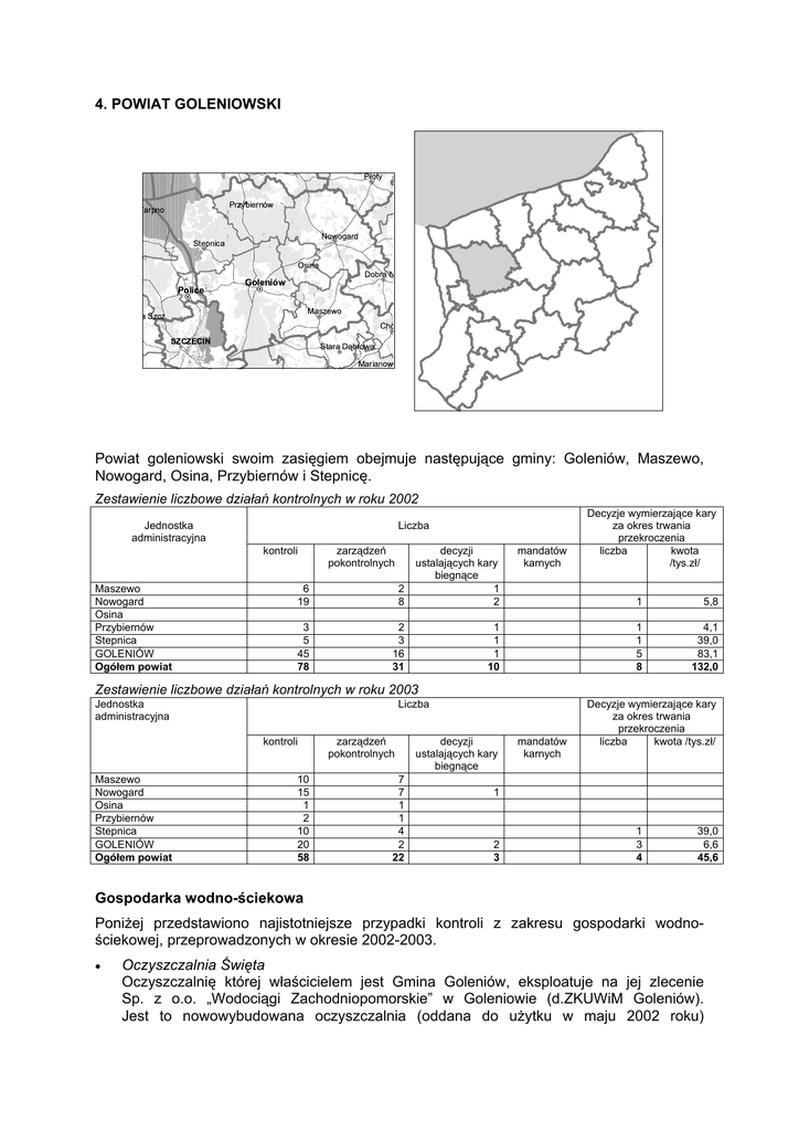 4. POWIAT GOLENIOWSKI P³oty Y# Y# Y# Przybiernów Warpno Nowogard Y# Stepnica Y# Police #Y Osina Y# Goleniów DobraY# Now #Y Maszewo Y# bra Szcz. SZCZECIN #Y Choc w Y# StaraY# D¹browa Marianowo o³baskowo Powiat goleniowski swoim zasięgiem obejmuje następujące gminy: Goleniów, Maszewo, Nowogard, Osina, Przybiernów i Stepnicę. Zestawienie liczbowe działań kontrolnych w roku 2002 Jednostka administracyjna Liczba kontroli Maszewo Nowogard Osina Przybiernów Stepnica GOLENIÓW Ogółem powiat zarządzeń pokontrolnych 6 19 2 8 decyzji ustalających kary biegnące 1 2 3 5 45 78 2 3 16 31 1 1 1 10 mandatów karnych Decyzje wymierzające kary za okres trwania przekroczenia liczba kwota /tys.zł/ 1 5,8 1 1 5 8 4,1 39,0 83,1 132,0 Zestawienie liczbowe działań kontrolnych w roku 2003 Jednostka administracyjna Liczba kontroli Maszewo Nowogard Osina Przybiernów Stepnica GOLENIÓW Ogółem powiat 10 15 1 2 10 20 58 zarządzeń pokontrolnych 7 7 1 1 4 2 22 decyzji ustalających kary biegnące mandatów karnych Decyzje wymierzające kary za okres trwania przekroczenia liczba kwota /tys.zł/ 1 2 3 1 3 4 39,0 6,6 45,6 Gospodarka wodno-ściekowa Poniżej przedstawiono najistotniejsze przypadki kontroli z zakresu gospodarki wodnościekowej, przeprowadzonych w okresie 2002-2003. • Oczyszczalnia Święta Oczyszczalnię której właścicielem jest Gmina Goleniów, eksploatuje na jej zlecenie Sp. z o.o. „Wodociągi Zachodniopomorskie” w Goleniowie (d.ZKUWiM Goleniów). Jest to nowowybudowana oczyszczalnia (oddana do użytku w maju 2002 roku) oczyszczająca ścieki tylko z miejscowości Święta. W skład oczyszczalni wchodzą następujące urządzenia: łapacz piasku, przepompownia ścieków surowych, reaktor biologiczny „WSC”. Ścieki oczyszczone w ilości 21 m3/dobę odprowadzone są bezpośrednio do Kanału Święta i dalej do rzeki Odry. Odprowadzanie ścieków odbywa się na podstawie aktualnego pozwolenia wodnoprawnego. • Oczyszczalnia Portu Lotniczego Goleniów Użytkownikiem oczyszczalni jest „Port Lotniczy” Sp. z o.o w Glewicach. Podstawowy ciąg technologiczny oczyszczalni stanowi zestaw „BIOBLOK” Mu-100. Z uwagi na niewielką ilość ścieków wynoszącą 10 m3/dobę występowały zakłócenia w pracy oczyszczalni. W celu usprawnienia pracy oczyszczalni - zainstalowano sondę tlenową w komorze natleniającej i zmodyfikowano pracę aeratora. Odbiornikiem ścieków oczyszczonych jest lokalny system rowów melioracyjnych. Odprowadzanie ścieków odbywa się na podstawie aktualnego pozwolenia wodnoprawnego. • Oczyszczalnia Wierzbięcin Użytkownikiem oczyszczalni jest Spółdzielnia Mieszkaniowa „Zgoda” w Wierzbięcinie. W skład oczyszczalni wchodzą następujące obiekty: krata koszowa, przepompownia ścieków surowych, wyniesiony ponad teren osadnik Imhoffa oraz filtr gruntowy (7 kwater o powierzchni ogółem 3000m2). Stan techniczny i eksploatacyjny oczyszczalni jest dobry, ale z uwagi na stosowaną technologię obiekt należy traktować jako przestarzały i niewystarczający. Odprowadzanie ścieków odbywa się na podstawie ważnego pozwolenia wodnoprawnego, zawierającego zobowiązanie użytkownika do modernizacji obiektu poprzez zastosowanie drugiego stopnia oczyszczania ścieków. Odbiornikiem ścieków oczyszczonych jest rzeka Dobra. • Oczyszczalnia Dębice Oczyszczalnię - której właścicielem jest Gmina Maszewo - na jej zlecenie eksploatuje Sp. z o. o. „Wodociągi Zachodniopomorskie” w Goleniowie (d.ZKUWiM Goleniów). W skład oczyszczalni wchodzą następujące obiekty: przepompownia ścieków surowych, zestaw „BIOBLOK” Mu-100, poletka osadowe i wewnętrzna przepompownia odcieków z poletek. Stan techniczny i eksploatacyjny oczyszczalni jest dobry, ale z uwagi na stosowaną technologię jednostopniowego oczyszczania biologicznego obiekt należy traktować jako przestarzały i niewystarczający. Odprowadzanie ścieków odbywa się na podstawie ważnego pozwolenia wodnoprawnego. Odbiornikiem ścieków oczyszczonych za pośrednictwem rowu melioracyjnego jest rzeka Sokola. • FBK „Prefbet” Powodowo - Zakład nr 4 w Rurce Na terenie zakładu zlokalizowana jest mechaniczno-biologiczna oczyszczalnia ścieków bytowo-gospodarczych. W skład oczyszczalni wchodzą: studnia zbiorcza, zbiornik sitowy, przepompownia, osadnik Imhoffa, złoże zraszane niskoobciążone, osadnik wtórny. Oczyszczone ścieki odprowadzane są do rowu melioracyjnego D-30 i dalej do Kanału Lubczyńskiego. Stan techniczny i eksploatacyjny oczyszczalni jest prawidłowy. W dniu kontroli Zakład odprowadzał oczyszczone ścieki w ilości 10 m3/d do wód powierzchniowych bez ważnego pozwolenia wodnoprawnego, jednakże złożony w Starostwie Powiatowym w Goleniowie wniosek wraz z właściwym operatem oczekiwał na rozpatrzenie i wydanie stosownej decyzji. Ochrona powietrza Poniżej przedstawiono najistotniejsze zakłady skontrolowane w latach 2002-2003 w zakresie ochrony powietrza: • Przedsiębiorstwo Energetyki Cieplnej w Goleniowie Przedsiębiorstwo dostarcza ciepło do większości budynków wielorodzinnych w Goleniowie. W kotłowni przedsiębiorstwa zainstalowane są trzy kotły typu WR-10 o mocy 11,6 MW każdy, opalane mieszanką miału węglowego i zrębków bukowych drewna. Pomiary kontrolne nie wykazały przekraczania wartości dopuszczalnych. 2 • Goleniowskie Fabryki Mebli „Kollektion WIM” Sp. z o.o. w Goleniowie W fabryce zainstalowane są następujące kotły : - dwa kotły węglowe typu P-125 o mocy łącznej 5,0 MW - jeden kocioł typu P-125 opalany drewnem o mocy 1,8 MW - jeden kocioł typu Lambion o mocy 1,5 MW – opalany drewnem. Tylko ostatni z nich zaopatrzony jest w 2 cyklony o sprawności 80%. Występuje nadmierna emisja sadzy z komina kotłowni. Zakład przekraczał emisję dopuszczalną tlenku węgla z kotłowni i w 2002 roku został ukarany karą łączną w kwocie 13238,48 zł. Wszystkie maszyny stolarskie do obróbki drewna posiadają odciąg
