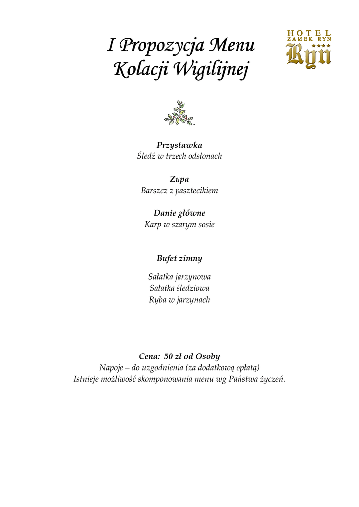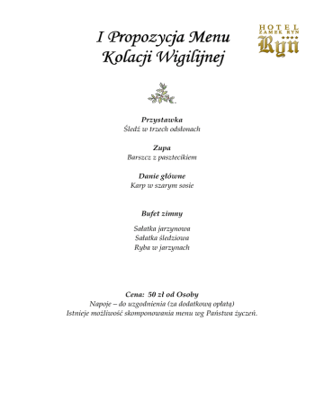 I Propozycja Menu Kolacji Wigilijnej - Przystawka Śledź w trzech odsłonach Zupa Barszcz z pasztecikiem Danie główne Karp w szarym sosie Bufet zimny Sałatka jarzynowa Sałatka śledziowa Ryba w jarzynach Cena: 50 zł od Osoby Napoje – do uzgodnienia (za dodatkową opłatą) Istnieje możliwość skomponowania menu wg Państwa życzeń. II Propozycja Menu Kolacji Wigilijnej Przystawka Śledź w śmietanie Zupa Krem grzybowy z grzankami Danie główne Dorsz w jarzynach Bufet zimny Sałatka jarzynowa Ryba po grecku Mix sałat, sosy Rolmopsy śledziowe Bufet gorący Kapusta z grochem Pstrąg z cebulką Pierogi z kapustą i grzybami Ziemniaki Warzywa Cena: 70 zł od Osoby Napoje – do uzgodnienia (za dodatkową opłatą) Istnieje możliwość skomponowania menu wg Państwa życzeń. III III Propozycja Menu Kolacji Wigilijnej Przystawka Rolada z sandacza z cytrusami Zupa Grzybowa z łazankami Danie główne Karp po staropolsku Bufet zimny Sałatka śledziowa z ogórkiem kiszonym Sałatka jarzynowa Rolady rybne Sałatka grecka z fetą Śledź w śmietanie ze szczypiorkiem Bufet gorący Barszcz z pasztecikiem Pierogi z kapustą i grzybami Dorsz w borowikach Ziemniaczki pieczone w ziołach Warzywa gotowane Ciasta, owoce Cena: 85 zł od Osoby Napoje – do uzgodnienia (za dodatkową opłatą) Istnieje możliwość skomponowania menu wg Państwa życzeń. IV Propozycja Menu Kolacji Wigilijnej Przystawka Łosoś marynowany z sosem chrzanowym Zupa Zupa rybna z pulpecikami z łososia Danie główne Sandacz w borowikach Bufet zimny Sałatka z rybą wędzoną Sałatka jarzynowa Trio śledziowe Sałatka Caprese Sałaty z wędzonym łososiem Bufet gorący Zupa grzybowa Krokiety z kapustą i grzybami Karp w szarym sosie Kapusta wigilijna Pieczone ziemniaki Warzywa Ciasta, owoce, kutia Cena: 95 zł od Osoby Napoje – do uzgodnienia (za dodatkową opłatą) Istnieje możliwość skomponowania menu wg Państwa życzeń.