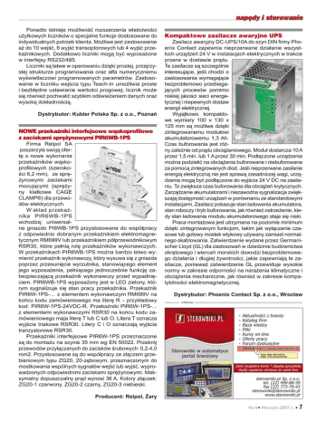 Ponadto istnieje możliwość rozszerzenia właściwości użytkowych liczników o specjalne funkcje dostosowane do indywidualnych potrzeb klienta. Możliwe jest zastosowanie aż do 10 wejść, 6 wyjść transoptorowych lub 4 wyjść przekaźnikowych. Dodatkowo liczniki mogą być wyposażone w interfejsy RS232/485. Liczniki są łatwe w operowaniu dzięki prostej, przejrzystej strukturze programowania oraz alfa numerycznemu wyświetlaczowi programowanych parametrów. Zastosowanie w liczniku wejścia typu Teach-In umożliwia proste i bezbłędne ustawianie wartości progowej; licznik może się również pochwalić szybkim odświeżaniem danych oraz wysoką dokładnością. Dystrybutor: Kubler Polska Sp. z o.o., Poznań NOWE przekaźniki interfejsowe wąskoprofilowe z zaciskami sprężynowymi PIR6WB-1PS Firma Relpol SA poszerzyła swoją ofertę o nowe wykonania przekaźników wąskoprofilowych (szerokości 6,2 mm), ze sprężynowymi zaciskami mocującymi (sprężyny klatkowe CAGE CLAMP®) dla przewodów elektrycznych. W skład przekaźnika PIR6WB-1PS wchodzą: uniwersalne gniazdo PI6WB-1PS przystosowane do współpracy z odpowiednio dobranym przekaźnikiem elektromagnetycznym RM699V lub przekaźnikiem półprzewodnikowym RSR30, które pełnią rolę przekaźników wykonawczych. W przekaźnikach PIR6WB-1PS można bardzo łatwo wymienić przekaźnik wykonawczy, który wysuwa się z gniazda poprzez przesunięcie wyrzutnika, stanowiącego element jego wyposażenia, pełniącego jednocześnie funkcję zabezpieczającą przekaźnik wykonawczy przed wypadnięciem. PIR6WB-1PS wyposażony jest w LED zielony, którym sygnalizuje się stan pracy przekaźnika. Przekaźnik PIR6W-1PS-… z elementem wykonawczym RM699V na końcu kodu zamówieniowego ma literę R – przykładowy kod: PIR6W-1PS-24VDC-R. Przekaźniki PIR6W-1PS-... z elementami wykonawczymi RSR30 na końcu kodu zamówieniowego maja literę T lub C lub O. Litera T oznacza wyjście triakowe RSR30. Litery C i O oznaczają wyjścia tranzystorowe RSR30. Przekaźniki interfejsowe PIR6W-1PS przeznaczone są do montażu na szynie 35 mm wg EN 50022. Przekrój przewodów przyłączanych do zacisków śrubowych: 0,2-4,0 mm2. Przystosowane są do współpracy ze złączem grzebieniowym typu ZG20, 20-zębowym, przeznaczonym do mostkowania wspólnych sygnałów wejść lub wyjść, wyprowadzonych odpowiednimi zaciskami sprężynowymi. Maksymalny dopuszczalny prąd wynosi 36 A. Kolory złączek: ZG20-1 czerwony, ZG20-2 czarny, ZG20-3 niebieski. Kompaktowe zasilacze awaryjne UPS Zasilacz awaryjny DC-UPS/10A do szyn DIN firmy Phoenix Contact zapewnia nieprzerwane działanie wszystkich urządzeń 24 V w instalacjach elektrycznych w trakcie przerw w dostawie prądu. Te zasilacze są szczególnie interesujące, jeśli chodzi o zastosowania wymagające bezproblemowo przebiegających procesów pomimo niskiej jakości sieci energetycznej i niepewnych dostaw energii elektrycznej. Wyjątkowo kompaktowe wymiary 100 x 130 x 125 mm są możliwe dzięki zintegrowanemu modułowi akumulatorowemu 1,3 Ah. Czas buforowania jest różny zależnie od prądu obciążeniowego. Moduł dostarcza 10 A przez 1,5 min. lub 1 A przez 30 min. Podłączone urządzenia można podzielić na obciążenia buforowane i niebuforowane za pomocą zintegrowanych diod. Jeśli nieprzerwane zasilanie energią elektryczną nie jest sprawą zasadniczej wagi, urządzenia mogą być podłączone do wyjścia 24 V DC na zasilaniu. To zwiększa czas buforowania dla obciążeń krytycznych. Zarządzanie akumulatorami i niezawodna sygnalizacja zwiększają dostępność urządzeń w porównaniu ze standardowymi instalacjami. Zasilacz pokazuje stan ładowania akumulatora, stan roboczy i tryb buforowania, jak również ostrzeżenie, kiedy stan ładowania modułu akumulatorowego staje się niski. Praca montażowa jest utrzymana na poziomie minimum dzięki zintegrowanym funkcjom, takim jak wyłączanie czasowe lub gotowy mostek wtykowy używany zamiast normalnego okablowania. Zatwierdzenie wydane przez Germanischer Lloyd (GL) dla zastosowań w dziedzinie budownictwa okrętowego i wierceń morskich dowodzi bezproblemowego działania i długiej żywotności, jakie zapewniają te zasilacze, ponieważ zatwierdzenie GL przewiduje wysokie normy w zakresie odporności na narażenia klimatyczne i obciążenia mechaniczne, jak również w zakresie kompatybilności elektromagnetycznej. Dystrybutor: Phoenix Contact Sp. z o.o., Wrocław reklama Producent: Relpol, Żary NR 9 WRZESIEŃ 2007 R. 7