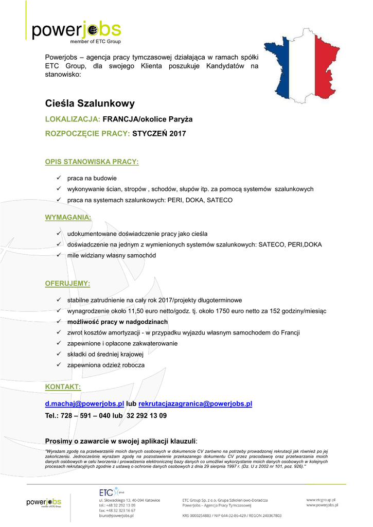 Powerjobs – agencja pracy tymczasowej działająca w ramach spółki ETC Group, dla swojego Klienta poszukuje Kandydatów na stanowisko: Cieśla Szalunkowy LOKALIZACJA: FRANCJA/okolice Paryża ROZPOCZĘCIE PRACY: STYCZEŃ 2017 OPIS STANOWISKA PRACY: praca na budowie wykonywanie ścian, stropów , schodów, słupów itp. za pomocą systemów szalunkowych praca na systemach szalunkowych: PERI, DOKA, SATECO WYMAGANIA: udokumentowane doświadczenie pracy jako cieśla doświadczenie na jednym z wymienionych systemów szalunkowych: SATECO, PERI,DOKA mile widziany własny samochód OFERUJEMY: stabilne zatrudnienie na cały rok 2017/projekty długoterminowe wynagrodzenie około 11,50 euro netto/godz. tj. około 1750 euro netto za 152 godziny/miesiąc możliwość pracy w nadgodzinach zwrot kosztów amortyzacji - w przypadku wyjazdu własnym samochodem do Francji zapewnione i opłacone zakwaterowanie składki od średniej krajowej zapewniona odzież robocza KONTAKT: [email protected] lub [email protected] Tel.: 728 – 591 – 040 lub 32 292 13 09 Prosimy o zawarcie w swojej aplikacji klauzuli: Strona | 1 "Wyrażam zgodę na przetwarzanie moich danych osobowych w dokumencie CV zarówno na potrzeby prowadzonej rekrutacji jak również po jej zakończeniu. Jednocześnie wyrażam zgodę na pozostawienie przekazanego dokumentu CV przez pracodawcę oraz przetwarzania moich danych osobowych w celu tworzenia i prowadzenia elektronicznej bazy danych co umożliwi wykorzystanie moich danych osobowych w kolejnych procesach rekrutacyjnych zgodnie z ustawą o ochronie danych osobowych z dnia 29 sierpnia 1997 r. (Dz. U z 2002 nr 101, poz. 926)."