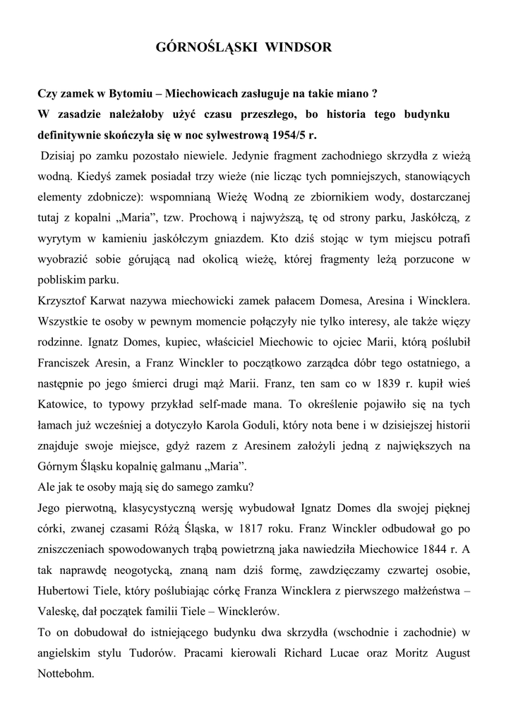 GÓRNOŚLĄSKI WINDSOR Czy zamek w Bytomiu – Miechowicach zasługuje na takie miano ? W zasadzie należałoby użyć czasu przeszłego, bo historia tego budynku definitywnie skończyła się w noc sylwestrową 1954/5 r. Dzisiaj po zamku pozostało niewiele. Jedynie fragment zachodniego skrzydła z wieżą wodną. Kiedyś zamek posiadał trzy wieże (nie licząc tych pomniejszych, stanowiących elementy zdobnicze): wspomnianą Wieżę Wodną ze zbiornikiem wody, dostarczanej tutaj z kopalni „Maria”, tzw. Prochową i najwyższą, tę od strony parku, Jaskółczą, z wyrytym w kamieniu jaskółczym gniazdem. Kto dziś stojąc w tym miejscu potrafi wyobrazić sobie górującą nad okolicą wieżę, której fragmenty leżą porzucone w pobliskim parku. Krzysztof Karwat nazywa miechowicki zamek pałacem Domesa, Aresina i Wincklera. Wszystkie te osoby w pewnym momencie połączyły nie tylko interesy, ale także więzy rodzinne. Ignatz Domes, kupiec, właściciel Miechowic to ojciec Marii, którą poślubił Franciszek Aresin, a Franz Winckler to początkowo zarządca dóbr tego ostatniego, a następnie po jego śmierci drugi mąż Marii. Franz, ten sam co w 1839 r. kupił wieś Katowice, to typowy przykład self-made mana. To określenie pojawiło się na tych łamach już wcześniej a dotyczyło Karola Goduli, który nota bene i w dzisiejszej historii znajduje swoje miejsce, gdyż razem z Aresinem założyli jedną z największych na Górnym Śląsku kopalnię galmanu „Maria”. Ale jak te osoby mają się do samego zamku? Jego pierwotną, klasycystyczną wersję wybudował Ignatz Domes dla swojej pięknej córki, zwanej czasami Różą Śląska, w 1817 roku. Franz Winckler odbudował go po zniszczeniach spowodowanych trąbą powietrzną jaka nawiedziła Miechowice 1844 r. A tak naprawdę neogotycką, znaną nam dziś formę, zawdzięczamy czwartej osobie, Hubertowi Tiele, który poślubiając córkę Franza Wincklera z pierwszego małżeństwa – Valeskę, dał początek familii Tiele – Wincklerów. To on dobudował do istniejącego budynku dwa skrzydła (wschodnie i zachodnie) w angielskim stylu Tudorów. Pracami kierowali Richard Lucae oraz Moritz August Nottebohm. Historia tego pałacu to jednocześnie historia pewnej grupy śląskiej arystokracji, arystokracji węgla i stali, która pojawiła się nagle w XIX wieku wraz z gwałtownym rozwojem przemysłu i równie szybko przeminęła w roku 1945. Właściciele Miechowic przenieśli z czasem swoje uczucia na obiekt znacznie większy, jakim był po rozbudowie pałac w Mosznej, który Hubert von Tiele-Winckler nabył w 1866 r. Tutaj łatwiej było imponować tym, od których zależało przyznawanie szlacheckich tytułów. Były jednak osoby, które do końca utożsamiały się z Miechowicami: wspomniana wcześniej Valeska von Tiele-Winckler i jej córka Eva (znana powszechnie jako matka Ewa). Dały temu wyraz w swoich listach i wspomnieniach. „Nie mogliśmy sobie wyobrazić nic piękniejszego niż rodzinne strony, duży pałac z wieżami i blankami, pokoje, z którymi wiąże się tyle wspomnień, pokój rodzinny z fotografiami rodziców, dziadków i gromadki dzieci, dziewięciorga rodzeństwa. (…) Najpiękniejszym pomieszczeniem w pałacu była prawdopodobnie sala kwiatowa. Zbudowane w stylu gotyckim z ostrołukowym sklepieniem na kolumnach, wysokie pomieszczenie w kościelnej formie było wykorzystywane podczas uroczystości rodzinnych jako kaplica, a na święta Bożego Narodzenia lśniła tam potężna choinka” – pisała Eva. Ale generalnie rodzina Tiele-Wincklerów pomieszkiwała tutaj w czasie odbudowy i rozbudowy pałacu w Mosznej, po jego pożarze w 1893 r. W pierwszych latach XX wieku przeprowadziła się tam na stałe, skazując pałac w Bytomiu na powolną degradację. W 1925 roku został on sprzedany przez kolejnego potomka, uznawanego za rodowego utracjusza, Klausa-Petera. Ostatecznego dzieła zniszczenia dokonał w 1945 roku pożar, a w 1954 saperzy LWP, wysadzając wypalone mury. Powróćmy na koniec do tytułowego Windsoru. Angielski neogotyk oprócz tego, że stylowo bardzo romantyczny, pozwalał również stworzyć (jak każdy historyzm zresztą) pozory budynku o wiele starszego niż był w rzeczywistości, nobilitując go jakby na dzień dobry i tym samym nobilitując także jego właściciela. Jeżeli jeszcze udało się przypisać mu podobieństwo do innego uznanego obiektu – to tym lepiej. Zabawę w takie porównania (mimo braku czasem uzasadnionego podobieństwa) można uznać za nieszkodliwą grę arystokracji, poprawiającą jednak ich właścicielom samopoczucie. Pałacem na Śląsku, bardziej przypominającym stylowo Windsor był np. pałac w Szczodrem, który w 1945 roku, niestety, również podzielił los miechowickiego. Obiekty tego typu dla potomnych stanowią widoczny znak minionego czasu, nawet gdy zachowały się jedynie w formie szczątkowej. Poglądu tego nie podzielają jednak władze miasta, które pałac w Miechowicach latami pozostawiały bez zabezpieczenia. Tym razem nie napisałem nic na temat miechowickiego parku i zieleni Tiele-Wincklerów – tej bytomskiej i katowickiej. Ale myślę, że na to będzie jeszcze okazja. Autor Aleksander Zembok