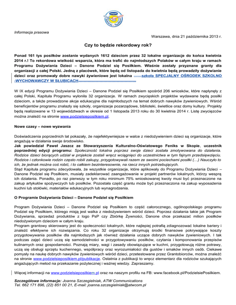 Informacja prasowa Warszawa, dnia 21 października 2013 r. Czy to będzie rekordowy rok? Ponad 161 tys posiłków zostanie wydanych 1612 dzieciom przez 32 lokalne organizacje do końca kwietnia 2014 r.! To rekordowa wielkość wsparcia, która ma trafić do najmłodszych Polaków w całym kraju w ramach Programu Dożywiania Dzieci – Danone Podziel się Posiłkiem. Właśnie zostały przyznane granty dla organizacji z całej Polski. Jedną z placówek, które będą od listopada do kwietnia będą prowadziły dożywianie dzieci oraz promowały dobre nawyki żywieniowe jest lokalna ……szkoła SPECJALNY OŚRODEK SZKOLNO -WYCHOWAWCZY W SŁUBICACH…………………………………….. W IX edycji Programu Dożywiania Dzieci – Danone Podziel się Posiłkiem spośród 206 wniosków, które napłynęły z całej Polski, Kapituła Programu wyłoniła 32 organizacje. W ramach zwycięskich projektów wydawane będą posiłki dzieciom, a także prowadzone akcje edukacyjne dla najmłodszych na temat dobrych nawyków żywieniowych. Wśród beneficjentów programu znalazły się szkoły, organizacje pozarządowe, biblioteki, świetlice oraz domy kultury. Projekty będą realizowane w 13 województwach w okresie od 1 listopada 2013 roku do 30 kwietnia 2014 r. Listę zwycięzców można znaleźć na stronie www.podzielsieposilkiem.pl. Nowe czasy – nowe wyzwania Doświadczenia poprzednich lat pokazały, że najefektywniejsze w walce z niedożywieniem dzieci są organizacje, które angażują w działania swoje środowisko. Jak powiedział Paweł Jaszcz ze Stowarzyszenia Kulturalno-Oświatowego Feniks w Skopie, uczestnik poprzedniej edycji programu: Społeczność lokalna poprzez swoje dzieci została zmotywowana do działania. Rodzice dzieci biorących udział w projekcie zostali wręcz wciągnięci do uczestnictwa w tym fajnym przedsięwzięciu. Rodzice i członkowie rodzin często robili zakupy, przygotowywali razem ze swoimi pociechami posiłki (…) Nauczyło to ich, że jednak można coś robić, i to całkiem bezinteresownie, na rzecz innych potrzebujących. Stąd Kapituła programu zdecydowała, że wszystkie organizacje, które aplikowały do Programu Dożywiania Dzieci – Danone Podziel się Posiłkiem, musiały zadeklarować zaangażowanie w projekt partnerów lokalnych, którzy wesprą ich działania. Ponadto, po raz pierwszy w tym roku minimum 75% wnioskowanej kwoty musi być przeznaczone na zakup artykułów spożywczych lub posiłków. Pozostała część grantu może być przeznaczona na zakup wyposażenia kuchni lub stołówki, materiałów edukacyjnych lub wynagrodzenia. O Programie Dożywiania Dzieci – Danone Podziel się Posiłkiem Program Dożywiania Dzieci – Danone Podziel się Posiłkiem to część całorocznego, ogólnopolskiego programu Podziel się Posiłkiem, którego misją jest walka z niedożywieniem wśród dzieci. Poprzez działania takie jak Program Dożywiania, sprzedaż produktów z logo PsP czy Zbiórkę Żywności, Danone chce przekazać milion posiłków niedożywionym dzieciom w całym kraju. Program grantowy skierowany jest do społeczności lokalnych, które najlepiej potrafią zdiagnozować lokalne bariery i znaleźć efektywne ich rozwiązania. Co roku 32 organizacje otrzymują środki finansowe pokrywające koszty przygotowywania posiłków dla najmłodszych jak również działania uczące dobrych nawyków żywieniowych. I tak podczas zajęć dzieci uczą się samodzielności w przygotowywaniu posiłków, czytania i komponowania przepisów kulinarnych oraz gospodarności. Poznają miary, wagi i zasady obowiązujące w kuchni, przygotowują różne potrawy, uczą się obsługi sprzętu kuchennego, współpracy oraz wyrozumiałości dla gustów i smaków innych osób. Ciekawe pomysły na naukę dobrych nawyków żywieniowych wśród dzieci, przetestowane przez Grantobiorców, można znaleźć na stronie www.podzielsieposilkiem.pl/publikacje. Ostatnia z publikacji to wręcz elementarz dla rodziców szukających angażujących metod na przekazanie pożytecznej i ważnej wiedzy. Zapraszamy. Więcej informacji na www.podzielsieposilkiem.pl oraz na naszym profilu na FB: www.facebook.pl/PodzielsiePosilkiem. Szczegółowe informacje: Joanna Szczegielniak, ATW Communications Tel. 662 171 896, (22) 851 00 21, E-mail: [email protected]