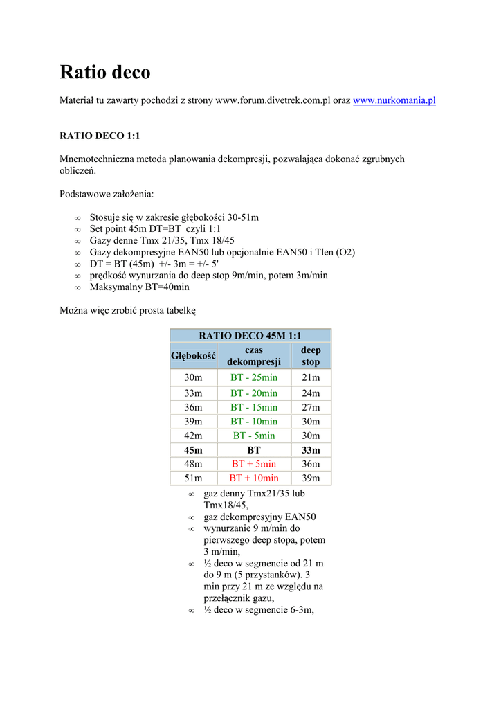 Ratio deco Materiał tu zawarty pochodzi z strony www.forum.divetrek.com.pl oraz www.nurkomania.pl RATIO DECO 1:1 Mnemotechniczna metoda planowania dekompresji, pozwalająca dokonać zgrubnych obliczeń. Podstawowe założenia: • • • • • • • Stosuje się w zakresie głębokości 30-51m Set point 45m DT=BT czyli 1:1 Gazy denne Tmx 21/35, Tmx 18/45 Gazy dekompresyjne EAN50 lub opcjonalnie EAN50 i Tlen (O2) DT = BT (45m) +/- 3m = +/- 5' prędkość wynurzania do deep stop 9m/min, potem 3m/min Maksymalny BT=40min Można więc zrobić prosta tabelkę RATIO DECO 45M 1:1 czas deep Głębokość dekompresji stop 30m BT - 25min 21m 33m 36m 39m 42m 45m 48m 51m BT - 20min BT - 15min BT - 10min BT - 5min BT BT + 5min BT + 10min 24m 27m 30m 30m 33m 36m 39m • • • • • gaz denny Tmx21/35 lub Tmx18/45, gaz dekompresyjny EAN50 wynurzanie 9 m/min do pierwszego deep stopa, potem 3 m/min, ½ deco w segmencie od 21 m do 9 m (5 przystanków). 3 min przy 21 m ze względu na przełącznik gazu, ½ deco w segmencie 6-3m, Dodatkowe wyjaśnienia • • • DT - deco time (czas wymaganej dekompresji) BT - bottom time (czas nurkowania liczony od momentu zanurzenia do momentu rozpoczęcia wynurzania) czas dodatkowy czas dodatkowy (czas+) dla głębokości nurkowania 45 metrów wynosi 0 minut. BT=DT (czas+) +/- 3m = -/+ 5 min - czas dodatkowy dla innych głębokości obliczamy według wzoru, że każde rozpoczęte 3metry zmienia DT (czas wymaganej dekompresji) o 5 minut, czyli dla głębokości o 3 metry większej (48 metrów) (czas+) będzie o 5 minut dłuższy i analogicznie głębokość mniejsza o 3 metry skraca o 5 minut czas wymaganej dekompresji. Przykładowo nurkowanie trwa 30min na głębokość 42m, wymagany czas dekompresji wynosi 30'-5'=25min. Kiedy nie ma w tabeli powyżej wymaganej głębokości nurkowania bierzemy pierwszą większą. Przykład: nurkowanie na 37m , obliczenia wykonujemy jak dla 39m. • • • Gazy denne - metodę stosuje się tylko do wymienionych gazów Tmx 21/35, Tmx 18/45 Gazy dekompresyjne - metoda stosuje się tylko do wymienionych gazów EAN50 i Tlen (O2) Pierwszy deep stop występuje w 80% głębokości wyrażonej w ata. Jak to obliczyć? Załóżmy głębokość nurkowania 51m. Ciśnienie absolutne na tej głębokości wynosi około 6,1 ata. Jeżeli mamy kalkulator to możemy wykonać proste obliczenie 6,1ata x 0,8 = 4,88ata czyli 38,8m po zaokrągleniu 39m. Jednak takie obliczenie powinno być do wykonania w głowie, jak to zrobić? Skorzystamy z prostej matematycznej sztuczki. Obliczamy ciśnienie absolutne na głębokości 51m, otrzymamy 6,1ata. Otrzymaną wartość mnożymy razy 2 i zaokrąglamy do pełnej wartości 6,1 x2 =12,2 po zaokrągleniu 12, następnie odejmujemy od głębokości nurkowania otrzymaną wartość. Daje to nam 51m - 12m =39m. Zatem w tym przykładzie 80% ata to głębokość 39m – do tej głębokości wynurzamy się z prędkością 9m/minutę i od tego miejsca zaczynamy deep stopy. Wynurzanie podzielono w metodzie RATIO DECO 45M 1:1 na cztery segmenty: 1. Segment wynurzania - od dna do pierwszego deep stopu wynurzamy się z prędkością 9m/min 2. Segment deep stopów - od pierwszego deep stopu do 21m. W tym segmencie poruszamy się z prędkością 3m/min. Dobrym rozwiązaniem jest 30 sekund wynurzania 30 sekund pobytu na deep stopie. 3. Segmentem głębokich przystanków dekompresyjnych od 21 do 9 metrów. Całkowity czas dekompresji w tym segmencie wynosi 1/2DT. W tym segmencie występuje 5 przystanków 21m, 18m 15m, 12m, 9m. 4. Segmentem płytkich przystanków dekompresyjnych od 6 do 3m. Całkowity czas dekompresji w tym segmencie wynosi 1/2DT. W tym segmencie występują dwa przystanki 6m i 3m. Dekompresję można wykonać na dwa sposoby, albo całość na 6m albo 1/4DT na 6m i 1/4DT na 3m. Do powierzchni wynurzamy się powoli z prędkością 1m/min. Czasu powolnego wynurzania nie wliczamy do czasu dekompresji. Segment przystanków dekompresyjnych Mamy tutaj 5 przystanków, na których w sumie mamy spędzić 1/2DT, czas należy podzielić w jakiś prosty sposób, jednocześnie zgodny z teoria dekompresji. czas może być podzielony według trzech krzywych • • • Krzywa dekompresji liniowej - to najprostsze podejście, wszystkie przystanki trwają dokładnie tyle samo, czas wymaganej dekompresji w tym segmencie dzielimy przez ilość przystanków np 1/2DT =15min, czyli 15min dzielimy przez 5 i otrzymujemy 3min Krzywa dekompresji wykładniczej - każdy następny przystanek jest dłuższy od poprzedniego w odpowiednim stosunku. S-krzywa - modyfikacja krzywej dekompresji liniowej w taki sposób, ze wydłużamy czas dekompresji na dwóch najgłębszych przystankach 21m i 18m a skracamy na głębokości 15m i 12m. Ważne jest, aby nie przekroczyć stosunku 4:1 przy porównaniu czasów dwóch kolejnych przystanków dekompresyjnych. Wydłużenie najgłębszych przystanków jest związane o szerszym otwarciem okienka tlenowego. Jest to najbardziej zalecana metoda w ratio deco dla 15min głębokość liniowa wykładnicza s-krzywa 21m 3' 1' 4' 18m 3' 2' 4' 15m 3' 3' 2' 12m 3' 4' 2' 9m 3' 6' 3' dla 23min głębokość liniowa wykładnicza s-krzywa 21m 5' 1' 7' 18m 5' 2' 7' 15m 4' 4' 3' 12m 4' 6' 3' 9m 5' 10' 5' Przykład 4 50m - 35' DT=35'+10'=45' Czas wymaganej dekompresji to czas nurkowania plus czas dodatkowy wynikający z maksymalnej głębokości nurkowania. 1/2DT = 23min Profil: 50m-35' ----------------------Deep stop 39m - 1' 36m - 1' 33m - 1' 30m - 1' 27m - 1' 24m - 1' ---------------------- Nx50 21m - 7' 18m - 7' 15m - 3' 12m - 3' 9m - 5' ---------------------- Nx50 (opcjonalnie O2) 6m - 23' Poniżej zamieszczam dekompresję wygenerowaną przy pomocy programu HLPlanner przy współczynniku bezpieczeństwa 20% model dekompresyjny VPM-B Odpowiednio dla nurkowania na powietrzu, Tmx 21/35, Tmx 18/45. dla Tmx 21/35 dla Tmx 18/45 Plan awaryjny - utrata gazu deco. W przypadku utraty gazu dekompresyjnego musimy odbyć dekompres