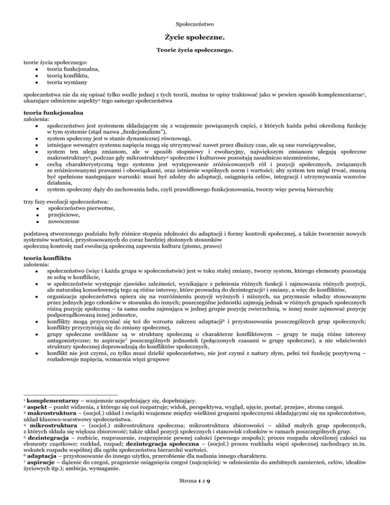 Społeczeństwo Życie społeczne. Teorie życia społecznego. teorie życia społecznego: teoria funkcjonalna, teorią konfliktu, teoria wymiany społeczeństwa nie da się opisać tylko wedle jednej z tych teorii, można te opisy traktować jako w pewien sposób komplementarne 1, ukazujące odmienne aspekty2 tego samego społeczeństwa teoria funkcjonalna założenia: społeczeństwo jest systemem składającym się z wzajemnie powiązanych części, z których każda pełni określoną funkcję w tym systemie (stąd nazwa „funkcjonalizm”), system społeczny jest w stanie dynamicznej równowagi, istniejące wewnątrz systemu napięcia mogą się utrzymywać nawet przez dłuższy czas, ale są one rozwiązywalne, system ten ulega zmianom, ale w sposób stopniowy i ewolucyjny, największym zmianom ulegają społeczne makrostruktury3, podczas gdy mikrostruktury4 społeczne i kulturowe pozostają zasadniczo niezmienione, cechą charakterystyczną tego systemu jest występowanie zróżnicowanych ról i pozycji społecznych, związanych ze zróżnicowanymi prawami i obowiązkami, oraz istnienie wspólnych norm i wartości; aby system ten mógł trwać, muszą być spełnione następujące warunki: musi być zdolny do adaptacji, osiągnięcia celów, integracji i utrzymywania wzorców działania, system społeczny dąży do zachowania ładu, czyli prawidłowego funkcjonowania, tworzy więc pewną hierarchię trzy fazy ewolucji społeczeństwa: społeczeństwo pierwotne, przejściowe, nowoczesne podstawą stworzonego podziału były różnice stopnia zdolności do adaptacji i formy kontroli społecznej, a także tworzenie nowych systemów wartości, przystosowanych do coraz bardziej złożonych stosunków społeczną kontrolę nad ewolucją społeczną zapewnia kultura (pismo, prawo) teoria konfliktu założenia: społeczeństwo (więc i każda grupa w społeczeństwie) jest w toku stałej zmiany, tworzy system, którego elementy pozostają ze sobą w konflikcie, w społeczeństwie występuje zjawisko zależności, wynikające z pełnienia różnych funkcji i zajmowania różnych pozycji, ale naturalną konsekwencją tego są różne interesy, które prowadzą do dezintegracji 5 i zmiany, a więc do konfliktów, organizacja społeczeństwa opiera się na rozróżnieniu pozycji wyższych i niższych, na przymusie władzy stosowanym przez jednych jego członków w stosunku do innych; poszczególne jednostki zajmują jednak w różnych grupach społecznych różną pozycję społeczną – ta sama osoba zajmująca w jednej grupie pozycję zwierzchnią, w innej może zajmować pozycję podporządkowaną innej jednostce, konflikty mogą przyczyniać się też do wzrostu zakresu adaptacji6 i przystosowania poszczególnych grup społecznych; konflikty przyczyniają się do zmiany społecznej, grupy społeczne uwikłane są w strukturę społeczną o charakterze konfliktowym – grupy te mają różne interesy antagonistyczne; to aspiracje7 poszczególnych jednostek (połączonych czasami w grupy społeczne), a nie właściwości struktury społecznej doprowadzają do konfliktów społecznych, konflikt nie jest czymś, co tylko musi dzielić społeczeństwo, nie jest czymś z natury złym, pełni też funkcję pozytywną – rozładowuje napięcia, wzmacnia więzi grupowe komplementarny – wzajemnie uzupełniający się, dopełniający. aspekt – punkt widzenia, z którego się coś rozpatruje; widok, perspektywa, wygląd, ujęcie, postać, przejaw, strona czegoś. 3 makrostruktura – (socjol.) układ i związki wzajemne między wielkimi grupami społecznymi składającymi się na społeczeństwo, układ klasowo-warstwowy społeczeństwa. 4 mikrostruktura – (socjol.) mikrostruktura społeczna; mikrostruktura zbiorowości – układ małych grup społecznych, z których składa się większa zbiorowość; także układ pozycji społecznych i stanowisk członków w ramach poszczególnych grup. 5 dezintegracja – rozbicie, rozproszenie, rozprzężenie pewnej całości (pewnego zespołu); proces rozpadu określonej całości na elementy cząstkowe; rozkład, rozpad; dezintegracja społeczna – (socjol.) proces rozkładu więzi społecznej zachodzący m.in. wskutek rozpadu wspólnej dla ogółu społeczeństwa hierarchii wartości. 6 adaptacja – przystosowanie do innego użytku, przerobienie dla nadania innego charakteru. 7 aspiracje – dążenie do czegoś, pragnienie osiągnięcia czegoś (najczęściej: w odniesieniu do ambitnych zamierzeń, celów, ideałów życiowych itp.); ambicja, wymaganie. 1 2 Strona 1 z 9 Społeczeństwo teoria wymiany założenia: bez względu na podziały kulturowe, historyczne i ekonomiczne, przynależności grupowe, stanowe, klasowe czy zakres dostępu do władzy ludzi łączy natura ludzka – wspólna dla wszystkich i taka sama dla każdego człowieka, człowiek jest nie tyle elementem (członkiem) społeczeństwa, ile – poprzez współistnienie z innymi ludźmi – dopiero to społeczeństwo tworzy, po to, by zaspokoić swoje naturalne potrzeby, społeczeństwo funkcjonuje wskutek wzajemnego oddziaływania jednostek na siebie; poszczególne jednostki posługują się zróżnicowanymi potrzebami i są zdolne do zwrotnego wzmacniania swoich oczekiwań, jak również do wzajemnej realizacji tychże oczekiwań, zachowanie społeczne jest wymianą dóbr zarówno materialnych, jak i niematerialnych: symboli, aprobaty8 i prestiżu9, przedmiotem badania powinny być zachowania ludzi jako ludzi, a nie jako członków społeczeństwa i dlatego dużą rolę należy przywiązywać do psychologii jako nauki inne teorie krytykują przede wszystkim funkcjonalistyczną teorię społeczeństwa, ale czerpią tylko pewne elementy z dwóch pozostałych, wskazując na ważne dodatkowe założenia założenia: odejście od traktowania społeczeństwa jako systemu społecznego, a jednostek jako elementów tego systemu, podstawą funkcjonowania grup społecznych są czynności po