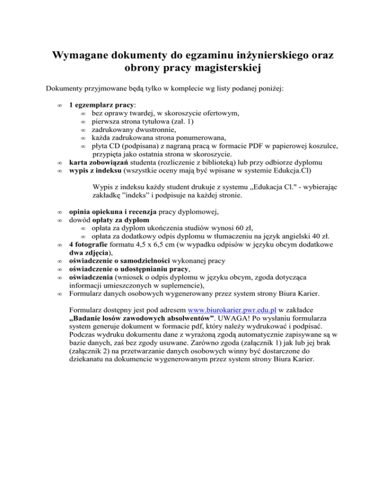 Wymagane dokumenty do egzaminu inżynierskiego oraz obrony pracy magisterskiej Dokumenty przyjmowane będą tylko w komplecie wg listy podanej poniżej: • • • 1 egzemplarz pracy: • bez oprawy twardej, w skoroszycie ofertowym, • pierwsza strona tytułowa (zał. 1) • zadrukowany dwustronnie, • każda zadrukowana strona ponumerowana, • płyta CD (podpisana) z nagraną pracą w formacie PDF w papierowej koszulce, przypięta jako ostatnia strona w skoroszycie. karta zobowiązań studenta (rozliczenie z biblioteką) lub przy odbiorze dyplomu wypis z indeksu (wszystkie oceny mają być wpisane w systemie Edukcja.Cl) Wypis z indeksu każdy student drukuje z systemu „Edukacja Cl." - wybierając zakładkę ”indeks” i podpisuje na każdej stronie. • • • • • • • opinia opiekuna i recenzja pracy dyplomowej, dowód opłaty za dyplom • opłata za dyplom ukończenia studiów wynosi 60 zł, • opłata za dodatkowy odpis dyplomu w tłumaczeniu na język angielski 40 zł. 4 fotografie formatu 4,5 x 6,5 cm (w wypadku odpisów w języku obcym dodatkowe dwa zdjęcia), oświadczenie o samodzielności wykonanej pracy oświadczenie o udostępnianiu pracy, oświadczenia (wniosek o odpis dyplomu w języku obcym, zgoda dotycząca informacji umieszczonych w suplemencie), Formularz danych osobowych wygenerowany przez system strony Biura Karier. Formularz dostępny jest pod adresem www.biurokarier.pwr.edu.pl w zakładce „Badanie losów zawodowych absolwentów”. UWAGA! Po wysłaniu formularza system generuje dokument w formacie pdf, który należy wydrukować i podpisać. Podczas wydruku dokumentu dane z wyrażoną zgodą automatycznie zapisywane są w bazie danych, zaś bez zgody usuwane. Zarówno zgoda (załącznik 1) jak lub jej brak (załącznik 2) na przetwarzanie danych osobowych winny być dostarczone do dziekanatu na dokumencie wygenerowanym przez system strony Biura Karier.