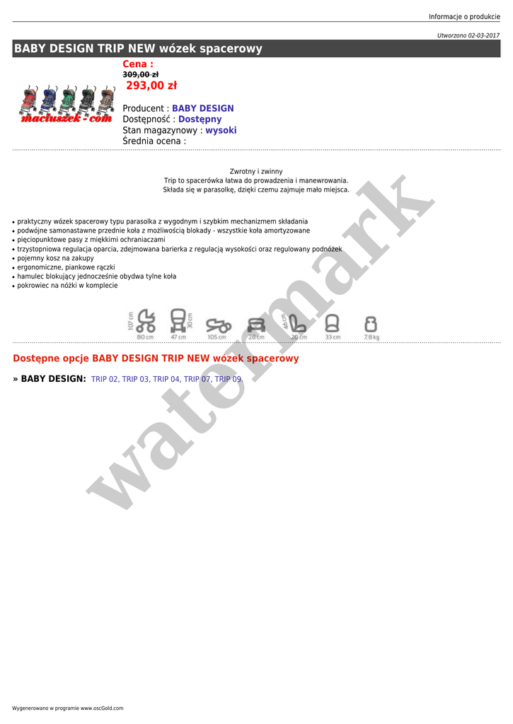 Informacje o produkcie Utworzono 02-03-2017 BABY DESIGN TRIP NEW wózek spacerowy Cena : 309,00 zł 293,00 zł Producent : BABY DESIGN Dostępność : Dostępny Stan magazynowy : wysoki Średnia ocena : ● ● ● ● ● ● ● ● er m ar k Zwrotny i zwinny Trip to spacerówka łatwa do prowadzenia i manewrowania. Składa się w parasolkę, dzięki czemu zajmuje mało miejsca. praktyczny wózek spacerowy typu parasolka z wygodnym i szybkim mechanizmem składania podwójne samonastawne przednie koła z możliwością blokady - wszystkie koła amortyzowane pięciopunktowe pasy z miękkimi ochraniaczami trzystopniowa regulacja oparcia, zdejmowana barierka z regulacją wysokości oraz regulowany podnóżek pojemny kosz na zakupy ergonomiczne, piankowe rączki hamulec blokujący jednocześnie obydwa tylne koła pokrowiec na nóżki w komplecie Dostępne opcje BABY DESIGN TRIP NEW wózek spacerowy w at » BABY DESIGN: TRIP 02, TRIP 03, TRIP 04, TRIP 07, TRIP 09. Wygenerowano w programie www.oscGold.com
