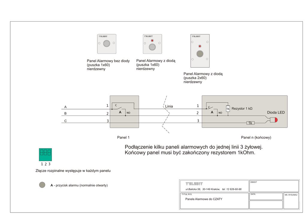 Telebit Telebit Panel Alarmowy bez diody (puszka 1x60) nierdzewny Telebit Panel Alarmowy z diodą (puszka 1x60) nierdzewny Panel Alarmowy z diodą (puszka 2x60) nierdzewny A 1 B 2 C 3 C 1 Linia A 2 NO C 1k Rezystor 1 kΩ A Dioda LED NO 3 Panel 1 1k Panel n (końcowy) Podłączenie kilku paneli alarmowych do jednej linii 3 żyłowej. Końcowy panel musi być zakończony rezystorem 1kOhm. 1 2 3 Złącze rozpinalne występuje w każdym panelu A - przycisk alarmu (normalnie otwarty) Telebit OBIEKT ul.Balicka 56, 30-149 Kraków, tel. 12 626-60-96 TYTUŁ RYS. Panele Alarmowe do CZATY DATA NR. RYSUNKU
