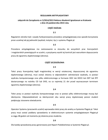 REGULAMIN ANTYPLAGIATOWY załącznik do Zarządzenia nr 5/2014/2015 Rektora Akademii Ignatianum w Krakowie z dnia 10 października 2014 roku CZĘŚĆ OGÓLNA §1 Regulamin określa tryb i zasady funkcjonowania procedury antyplagiatowej oraz sposób korzystania przez uczelnię lub jej jednostki (wydział, instytut, itp.) z systemu Plagiat.pl. §2 Procedura antyplagiatowa ma zastosowanie w stosunku do wszystkich prac licencjackich i magisterskich powstających w uczelni, a pozytywny wynik tej kontroli jest warunkiem dopuszczenia pracy do egzaminu dyplomowego (obrony). CZĘŚĆ SZCZEGÓŁOWA §3 Tekst pracy licencjackiej bądź magisterskiej w wersji ostatecznej, dopuszczonej do egzaminu dyplomowego (obrony), musi zostać złożony w odpowiednim sekretariacie wydziału, w postaci wydruku komputerowego oraz pliku elektronicznego w formacie DOC lub DOCX lub ODT lub RTF dostarczonego na nośniku CD lub DVD, na co najmniej 21 dni przed wyznaczonym terminem egzaminu dyplomowego (obrony). §4 Tekst pracy w postaci wydruku komputerowego oraz w postaci pliku elektronicznego muszą być identyczne. Odpowiedzialność za identyczność obu wersji pracy dyplomowej ponosi student podpisując stosowne oświadczenie. §5 Operator Systemu (pracownik uczelni) wprowadza tekst pracy do analizy w Systemie Plagiat.pl. Tekst pracy musi zostać poddany sprawdzeniu w elektronicznym systemie antyplagiatowym Plagiat.pl w ciągu 48 godzin od momentu jej złożenia przez studenta. §6 Dla każdej sprawdzanej pracy generowany jest Raport Podobieństwa w Systemie Plagiat.pl. §7 1. Operator Systemu dokonuje oględzin Raportu podobieństwa pod kątem występowania w pracy nieuprawnionych zapożyczeń, w szczególności ustala czy: a. współczynnik podobieństwa 1 nie przekracza 50%, b. współczynnik podobieństwa 2 nie przekracza 5%, c. próbowano ukryć obecność nieuprawnionych zapożyczeń („alert”). 2. Na podstawie analizy Raportu Podobieństwa Operator Systemu w ciągu 48 godzin przygotowuje „protokół kontroli oryginalności pracy” (zał. nr 1). UWAGA Operator Systemu nie dokonuje oceny merytorycznej pracy! §8 Jeżeli w wyniku oględzin Raportu podobieństwa, o których mowa w § 7., praca zostanie uznana za niebudzącą wątpliwości, Operator Systemu podpisuje „protokół kontroli oryginalności pracy” (stanowiący zał. nr 1), wprowadza pracę do Bazy Systemu, a praca zostaje dopuszczona do obrony. §9 Jeżeli w wyniku oględzin Raportu Podobieństwa, według kryteriów wskazanych w § 7., Operator Systemu uzna pracę za wymagającą dodatkowej oceny z punktu widzenia występowania niedopuszczalnych zapożyczeń, generuje Rozszerzony Raport Podobieństwa, który wraz z „protokołem kontroli oryginalności pracy” (zał. nr 1) przekazuje promotorowi pracy w celu jej merytorycznej oceny. § 10 Promotor, na podstawie Rozszerzonego Raportu Podobieństwa przygotowuje opinię (według wzoru stanowiącego zał. nr 2), w której ocenia czy praca, nie zawiera nieuprawnionych zapożyczeń (plagiat) lub czy zawarte w niej prawidłowo oznaczone zapożyczenia (cytaty) nie budzą wątpliwości co do samodzielności pracy dyplomowej przygotowanej przez studenta. W szczególności promotor powinien zwrócić uwagę czy: a. praca nie zawiera obszernych fragmentów tekstu (co najmniej 50. słów) zidentyfikowanych przez System jako „podobne”, b. nie występuje zbyt duża liczba potencjalnych zapożyczeń z jednego źródła, c. nie zachodzi szczególna zbieżność tematyki badanej pracy z potencjalnymi źródłami zapożyczeń, d. cechy redakcyjne badanej pracy nie wskazują na obecność „mechanicznych” zapożyczeń. Opinia promotora winna być wydana w terminie 2. tygodni od daty złożenia pracy przez studenta. 2 § 11 Jeżeli opinia promotora, o której mowa w § 10., wskazuje, że praca, pomimo przesłanek wskazanych w § 7., nie zawiera niedopuszczalnych zapożyczeń, Operator Systemu dołącza do niej Skrócony Raport Podobieństwa i wprowadza do Bazy Systemu. Pracę taką uważa się za zakwalifikowaną do obrony. § 12 Jeżeli z oceny, o której mowa w § 10. wynika, że praca nie zawiera przesłanek popełnienia plagiatu przez jej autora, lecz nadmierna liczba cytatów wskazuje na niski stopień samodzielności – praca nie jest dopuszczana do obrony i dodawana do Bazy Systemu. Student po konsultacji z promotorem dokonuje poprawy pracy, która następnie ponownie przechodzi całą procedurę antyplagiatową. § 13 Jeżeli w wyniku oceny, o której mowa w § 10. wynika, że praca nosi znamiona plagiatu, nie zostaje ona dopuszczona do obrony ani dodawana do Bazy Systemu, a wobec jej autora, w terminie 14. dni od przekazania informacji, Rektor wszczyna postępowanie wyjaśniające w trybie ustalonym w art. 214 ust. 4 ustawy z dnia 25. lipca 2005 r. – Prawo o szkolnictwie wyższym oraz przepisy szczegółowe1. § 14 Wszystkie prace, dopuszczone do egzaminu dyplomowego (obrony), są dodawane obligatoryjnie przez Operatorów Systemu do Bazy Danych Systemu Plagiat.pl w terminie 48. godzin od zakończenia procedury antyplagiatowej. §15 Wszystkie kwestie, dotyczące trybu postępowania dyscyplinarnego, nieujęte w Regulaminie określa Ustawa z dnia 27 lipca 2005 r. Prawo o szkolnictwie wyższym (Dz. U. Nr 164, poz. 1365 z późn. zm.) oraz rozporządzenie Ministra Nauki i Szkolnictwa Wyższego z dnia 6 grudnia 2006 r. w sprawie szczegółowego trybu postępowania wyjaśniającego i dyscyplinarnego wobec studentów (Dz. U. Nr 236, poz. 1707). § 16 Niniejszy regulamin wchodzi w życie z dniem podpisania. 1 Rozporządzenie Ministra Nauki i Szkolnictwa Wyższego z dnia 6 grudnia 2006 w sprawie szczegółowego trybu postępowania wyjaśniającego i dyscyplinarnego wobec studentów (Dz. U. Nr 236, poz. 1707). 3 Załącznik nr 1 do Regulaminu antyplagiatowego PROTOKÓŁ KONTROLI ORYGINALNOŚCI PRACY Autor: ........................................................................... Tytuł: ............