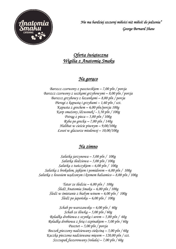 Nie ma bardziej szczerej miłości niż miłość do jedzenia” George Bernard Shaw Oferta świąteczna Wigilia z Anatomią Smaku Na gorąco Barszcz czerwony z pasztecikiem – 7,00 pln / porcja Barszcz czerwony z uszkami grzybowymi – 8,00 pln / porcja Barszcz grzybowy z łazankami – 8,00 pln / porcja Pierogi z kapustą i grzybami – 1,60 pln / szt. Kapusta z grochem – 6,00 pln/porcja 100g Karp smażony /dzwonek/ - 3,50 pln / 100g Pstrąg z pieca – 5,00 pln / 100g Ryba po grecku – 7,00 pln / 140g Halibut w cieście piwnym – 9,00/100g Łosoś w glazurze miodowej – 10,00/100g Na zimno Sałatka jarzynowa – 5,00 pln / 100g Sałatka śledziowa – 5,00 pln / 100g Sałatka z tuńczykiem – 6,00 pln / 100g Sałatka z brokułem, jajkiem i pomidorem – 6,00 pln / 100g Sałatka z łososiem wędzonym i kremem balsamico – 8,00 pln / 100g Tatar ze śledzia – 6,00 pln / 100g Śledź Anatomia Smaku – 6,00 pln / 100g Śledź w śmietanie z białym winem – 6,00 pln / 100g Śledź po japońsku – 6,00 pln / 100g Schab po warszawsku – 6,00 pln / 60g Schab ze śliwką – 5,00 pln / 60g Roladka drobiowa z szynką i serem – 5,00 pln / 60g Roladka drobiowa z fetą i szpinakiem – 5,00 pln / 60g Pasztet – 5,00 pln / porcja Boczek pieczony nadziewany cielęciną – 5,00 pln / 60g Kaczka pieczona nadziewana mięsem – 120,00 pln / szt. Szczupak faszerowany (rolada) – 7,00 pln / 60g Amur faszerowany (rolada) – 7,00 pln / 60g Karp w galarecie w całości na półmisku – 65,00 pln / 100g Rożki z ciasta francuskiego z pieczarkami – 5,00 pln / szt. Terrinka z łososia – 5,00 pln / porcja 40g Z własnej wędzarni (czas realizacji 7 dni) Szynka – 60,00 pln / kg Schab – 60,00 pln / kg Baleron – 55,00 pln / kg Boczek - 55,00 pln / kg Na słodko Makowiec – 6,00 pln / porcja Sernik – 6,00 pln / porcja Piernik – 5,00 pln / porcja Torcik czekoladowy – 8,00 pln / porcja Ciasto czekoladowo-wiśniowe – 6,00 pln / porcja Ciasto czekoladowe „ delicjusz „– 6,00 pln / porcja Kutia – 7,00 pln/100g Usługi dodatkowe Obrus – 20.00 pln/szt. Bieżnik – 5,00 pln/szt. Serwetki dekoracyjne – 2,00 pln/szt. Stół – 50,00 pln/szt. Krzesło składane z poduszką – 5,00 pln/szt. Pełna zastawa porcelanowa – 10,00 pln/os. [komplet] Pełna zastawa jednorazowa – 3,00 pln/osoba Obsługa – 30,00 pln/godz – koszt 1 osoby Kontakt: Rafał Boroński ‐ 504 769 855 Anna Wesołek – 505 913 912 [email protected]