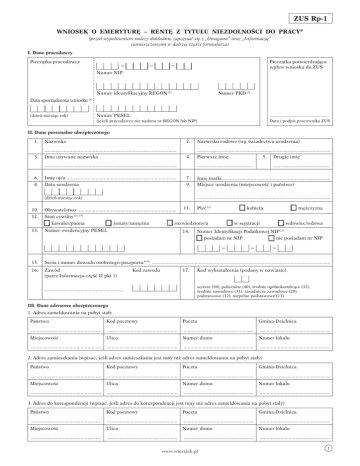 ZUS Rp-1 WNIOSEK O EMERYTURĘ – RENTĘ Z TYTUŁU NIEZDOLNOŚCI DO PRACY* (przed wypełnieniem należy dokładnie zapoznać się z „Uwagami” oraz „Informacją” zamieszczonymi w dalszej części formularza) I. Dane pracodawcy Pieczątka pracodawcy – – Pieczątka potwierdzająca wpływ wniosku do ZUS – Numer NIP Numer identyfikacyjny REGON (2) Data sporządzenia wniosku Numer PKD (2) (1) Numer PESEL (dzień-miesiąc-rok) .................................................. Data i podpis pracownika ZUS (jeżeli pracodawcy nie nadano nr REGON lub NIP) II. Dane personalne ubezpieczonego 1. Nazwisko 12. 3. ................................................................................................ Inne używane nazwiska 4. Nazwisko rodowe (wg świadectwa urodzenia) ................................................................................................. Pierwsze imię 5. Drugie imię ................................................................................................ 16. 8. Imię ojca ................................................................................ Data urodzenia ......................................... 7. 19. Imię matki............................................................................... Miejsce urodzenia (miejscowość i państwo) ................................................................................................. (dzień-miesiąc-rok) 10. ......................................... Obywatelstwo ........................................................................ 11. 6 kobieta Płeć (3) 6 mężczyzna (3), (4) 12. Stan cywilny 6 kawaler/panna 13. Numer ewidencyjny PESEL 6 żonaty/zamężna 6 rozwiedziony/a 14. 6 w separacji 6 wdowiec/wdowa Numer Identyfikacji Podatkowej NIP (3) 6 posiadam nr NIP 6 nie posiadam nr NIP – – – 15. Seria i numer dowodu osobistego-paszportu* (5) .................................................................................................................................. 16. Zawód (patrz Informacja część II pkt 1) Kod zawodu 17. Kod wykształcenia (podany w nawiasie) wyższe (50), policealne (40), średnie ogólnokształcące (32), średnie zawodowe (31), zasadnicze zawodowe (20), podstawowe (12), niepełne podstawowe (11) ......................................................... III. Dane adresowe ubezpieczonego 1. Adres zameldowania na pobyt stały Państwo Kod pocztowy Poczta Gmina-Dzielnica ................................................... ................................................... ................................................... ................................................... Miejscowość Ulica Numer domu Numer lokalu ................................................... ................................................... ................................................... ................................................... 2. Adres zamieszkania (wpisać, jeśli adres zamieszkania jest inny niż adres zameldowania na pobyt stały) Państwo Kod pocztowy Poczta Gmina-Dzielnica ................................................... ................................................... ................................................... ................................................... Miejscowość Ulica Numer domu Numer lokalu ................................................... ................................................... ................................................... ................................................... 3. Adres do korespondencji (wpisać, jeśli adres do korespondencji jest inny niż adres zameldowania na pobyt stały) Państwo Kod pocztowy Poczta Gmina-Dzielnica ................................................... ................................................... ................................................... ................................................... Miejscowość Ulica Numer domu Numer lokalu ................................................... ................................................... ................................................... ................................................... www.wieszjak.pl 1 4. Adres ostatniego zameldowania na pobyt stały w Polsce (wpisać, jeśli ubezpieczony zamieszkuje aktualnie za granicą) Kod pocztowy Poczta ...................................................................... Gmina-Dzielnica ...................................................................... ...................................................................... Miejscowość Ulica Numer domu Numer lokalu ................................................... ................................................... ................................................... .................................................... IV. Wniosek ubezpieczonego 1. Wnoszę o przyznanie: emerytury-renty z tytułu niezdolności do pracy – w związku z wypadkiem przy pracy (wypadkiem w drodze do pracy – z pracy, który miał miejsce przed dniem l stycznia 2003 r.) – wypadkiem w szczególnych okolicznościach – z chorobą zawodową – renty inwalidy wojennego – renty inwalidy wojskowego* .............................................................................................................................. ................................................................................................................................................................................................................. 2. Do ustalenia podstawy wymiaru emerytury-renty* wnoszę o przyjęcie wynagrodzenia – dochodu – przychodu* stanowiącego(ych) podstawę wymiaru składki na ubezpieczenia społeczne lub na ubezpieczenie emerytalne i rentowe albo na ubezpieczenie wypadkowe – uposażenia* osiąganego w Polsce (3): 6 w okresie 10 kolejnych lat kalendarzowych – z ostatnich 20 lat kalendarzowych, tj. od ......................... do ............................. 6 z 20 lat kalendarzowych z całego okresu podlegan