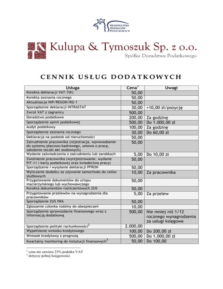 CENNIK US£UG DODATKOWYCH Usùuga Korekta deklaracji VAT-7(K) Korekta zeznania rocznego Aktualizacja NIP/REGON/RG-1 Sporz¹dzenie deklaracji INTRASTAT Zwrot VAT z zagranicy Doradztwo podatkowe Sporz¹dzenie opinii podatkowej Audyt podatkowy Sporz¹dzenie zeznania rocznego Deklaracja na podatek od nieruchomoœci Zatrudnienie pracownika (rejestracja, wprowadzenie do systemu pùacowo-kadrowego, umowa o pracê, zaùo¿enie teczki akt osobowych) Wydanie zaœwiadczenia o zatrudnieniu lub zarobkach Zwolnienie pracownika (wyrejestrowanie, wydanie PIT-11 i karty podatkowej oraz œwiadectwa pracy) Sporz¹dzanie i wysyùanie deklaracji PFRON Wyliczanie dodatku za u¿ywanie samochodu do celów sùu¿bowych Przygotowanie dokumentów do urlopu macierzyñskiego lub wychowawczego Korekta dokumentów rozliczeniowych ZUS Przygotowanie przelewów na wynagrodzenia dla pracowników Sporz¹dzenie ZUS IWA Zgùoszenie czùonka rodziny do ubezpieczeñ Sporz¹dzenie sprawozdania finansowego wraz z informacj¹ dodatkow¹ Sporz¹dzenie polityki rachunkowoœci Wypeùnienie wniosku kredytowego Wniosek kredytowy z prognoz¹ 2 Kwartalny monitoring do instytucji finansowych 1 2 cena nie zawiera 23% podatku VAT dotyczy peùnej ksiêgowoœci 3 Cena1 50,00 50,00 50,00 30,00 500,00 200,00 500,00 100,00 30,00 50,00 50,00 Uwagi +10,00 zù/pozycjê Za godzinê Do 1.000,00 zù Za godzinê Do 60,00 zù 5,00 Do 10,00 zù 50,00 50,00 10,00 Za pracownika 50,00 50,00 5,00 Za przelew 50,00 10,00 500,00 Nie mniej ni¿ 1/12 rocznego wynagrodzenia za usùugi ksiêgowe 2.000,00 100,00 Do 200,00 zù 500,00 Do 1.000,00 zù 50,00 Do 100,00 Wniosek o zwrot VAT za materiaùy budowlane (VZM) Wyliczenie delegacji Wystawienie faktury Osobisty odbiór dokumentów Pomoc i doradztwo przy zaùo¿eniu dziaùalnoœci gospodarczej4 Pomoc i doradztwo przy zaùo¿eniu spóùki cywilnej Pomoc i doradztwo przy zaùo¿eniu spóùki jawnej Pomoc i doradztwo przy zaùo¿eniu spóùki z o.o. Monit pùatnoœci elektroniczny (SMS, mail) Monit pùatnoœci poczt¹ tradycyjn¹ Sprawozdania statystyczne 100,00 30,00 10,00 20,00 100,00 Za godzinê Do 50,00 zù +5,00 zù/pozycjê Na terenie miasta 300,00 500,00 1.000,00 5,00 10,00 50,00 Do 300,00 zù Odpùatnoœã za czynnoœci nieobjête powy¿szym cennikiem bêdzie ustalana indywidualnie. Kulupa & Tymoszuk Sp. z o.o. Spóùka Doradztwa Podatkowego Al. Jana Pawùa II 11 21-500 Biaùa Podlaska www.kkp24.pl NIP: 537-25-33-787 S¹d rejestrowy: S¹d Rejonowy - S¹d Gospodarczy w Lublinie, XI Wydziaù KRS Numer KRS: 0000327521 Kapitaù zakùadowy: 100.000 zù 3 4 dotyczy peùnej ksiêgowoœci dotyczy jednoosobowej dziaùalnoœci gospodarczej