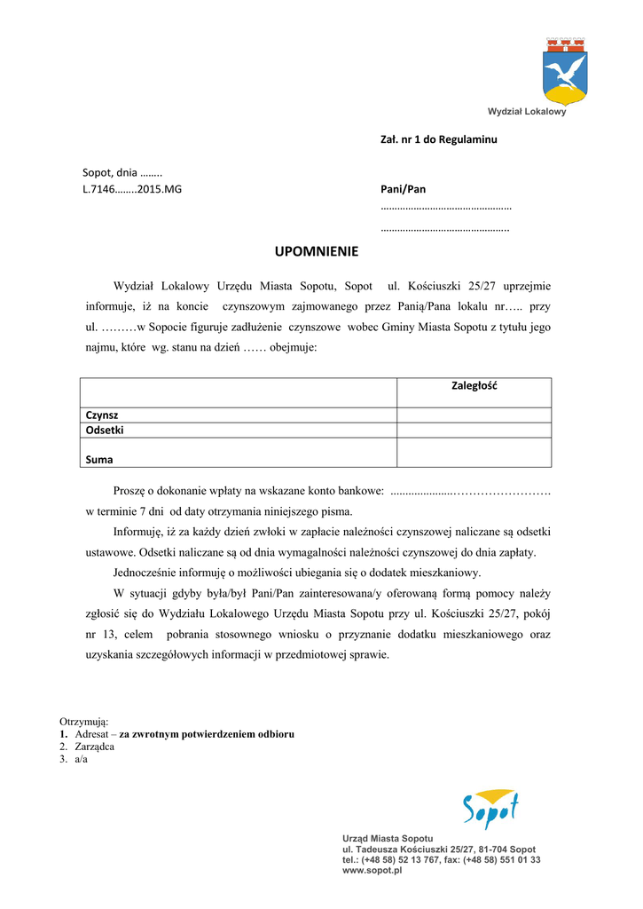 Wydział Lokalowy Zał. nr 1 do Regulaminu Sopot, dnia …….. L.7146……..2015.MG Pani/Pan ………………………………………… ……………………………………….. UPOMNIENIE Wydział Lokalowy Urzędu Miasta Sopotu, Sopot informuje, iż na koncie ul. Kościuszki 25/27 uprzejmie czynszowym zajmowanego przez Panią/Pana lokalu nr….. przy ul. ………w Sopocie figuruje zadłużenie czynszowe wobec Gminy Miasta Sopotu z tytułu jego najmu, które wg. stanu na dzień …… obejmuje: Zaległość Czynsz Odsetki Suma Proszę o dokonanie wpłaty na wskazane konto bankowe: .....................……………………. w terminie 7 dni od daty otrzymania niniejszego pisma. Informuję, iż za każdy dzień zwłoki w zapłacie należności czynszowej naliczane są odsetki ustawowe. Odsetki naliczane są od dnia wymagalności należności czynszowej do dnia zapłaty. Jednocześnie informuję o możliwości ubiegania się o dodatek mieszkaniowy. W sytuacji gdyby była/był Pani/Pan zainteresowana/y oferowaną formą pomocy należy zgłosić się do Wydziału Lokalowego Urzędu Miasta Sopotu przy ul. Kościuszki 25/27, pokój nr 13, celem pobrania stosownego wniosku o przyznanie dodatku mieszkaniowego oraz uzyskania szczegółowych informacji w przedmiotowej sprawie. Otrzymują: 1. Adresat – za zwrotnym potwierdzeniem odbioru 2. Zarządca 3. a/a Urząd Miasta Sopotu ul. Tadeusza Kościuszki 25/27, 81-704 Sopot tel.: (+48 58) 52 13 767, fax: (+48 58) 551 01 33 www.sopot.pl Wydział Lokalowy Zał. nr 2 do Regulaminu Sopot, dnia …….. L.7146……..2015.MG Pani/Pan ………………………………………… ……………………………………….. WEZWANIE DO ZAPŁATY Wydział Lokalowy Urzędu Miasta Sopotu, Sopot ul. Kościuszki 25/27 niniejszym wzywa Panią/Pana do zapłaty zadłużenia czynszowego wobec Gminy Miasta Sopotu z tytułu najmu lokalu nr…… przy ul. ……………………., które wg. stanu na dzień …… obejmuje: Zaległość Czynsz Odsetki Suma Zapłaty należy dokonać na wskazane konto bankowe: .....................……………………. w terminie 30 dni od daty otrzymania niniejszego wezwania. Za każdy dzień zwłoki w zapłacie należności czynszowej naliczane są odsetki ustawowe. Odsetki naliczane są od dnia wymagalności należności czynszowej do dnia zapłaty. Jednocześnie informuję o możliwości odpracowania powstałego zadłużenia w formie prac interwencyjnych na rzecz Miasta jak też spłaty zaległości w ratach. W sytuacji, gdyby była/był Pani/Pan zainteresowana/y oferowaną formą pomocy i mogła/mógł podjąć te działania należy zgłosić się do Wydziału Lokalowego Urzędu Miasta Sopotu przy ul. Kościuszki 25/27, pokój nr 77, celem złożenia stosownego oświadczenia w przedmiotowej sprawie. Brak podjęcia przez Panią/Pana działań zmierzających do uregulowania powstałego zadłużenia spowoduje skierowanie sprawy na drogę postępowania sądowego, co narazi Panią/Pana na dodatkowe koszty. Otrzymują: 1. Adresat – za zwrotnym potwierdzeniem odbioru 2. Zarządca 3. a/a Urząd Miasta Sopotu ul. Tadeusza Kościuszki 25/27, 81-704 Sopot tel.: (+48 58) 52 13 767, fax: (+48 58) 551 01 33 www.sopot.pl Wydział Lokalowy Zał. nr 3 do Regulaminu Sopot, dnia …….. L.7146……..2015.MG Pani/Pan ………………………………………… ……………………………………….. UPRZEDZENIE O ZAMIARZE WYPOWIEDZENIA UMOWY NAJMU Wydział Lokalowy Urzędu Miasta Sopotu, Sopot ul. Kościuszki 25/27 niniejszym wzywa Panią/Pana do zapłaty zadłużenia czynszowego wobec Gminy Miasta Sopotu z tytułu najmu lokalu nr…… przy ul. ……………………., które wg. stanu na dzień …… obejmuje: Zaległość Czynsz Odsetki Suma Zapłaty należy dokonać na wskazane konto bankowe: .....................……………………. w terminie 30 dni od daty otrzymania niniejszego wezwania. Za każdy dzień zwłoki w zapłacie należności czynszowej naliczane są odsetki ustawowe. Odsetki naliczane są od dnia wymagalności należności czynszowej do dnia zapłaty. Zgodnie z art. 11 ust.2 pkt 2 ustawy z dnia 21 czerwca 2011r. o ochronie praw lokatorów, mieszkaniowym zasobie gminy i o zmianie Kodeksu cywilnego (Dz.U.2014.150), zwłoka z zapłatą czynszu i opłat niezależnych od właściciela za 3 pełne okresy płatności upoważnia wynajmującego do wypowiedzenia Pani/Panu umowy najmu. Uprzedzam, że w przypadku nieuregulowania wyżej określonego zadłużenia we wskazanym terminie, wypowiedziana zostanie Pani/Panu umowa najmu lokalu mieszkalnego, a do sądu skierowany zostanie pozew o zapłatę należności i eksmisję z lokalu. Otrzymują: 1. Adresat – za zwrotnym potwierdzeniem odbioru 2. Zarządca 3. a/a Urząd Miasta Sopotu ul. Tadeusza Kościuszki 25/27, 81-704 Sopot tel.: (+48 58) 52 13 767, fax: (+48 58) 551 01 33 www.sopot.pl Wydział Lokalowy Zał. nr 4 do Regulaminu Sopot, dnia ................. L.7146………2015.MG Pani/Pan ................................. ................................. ................................. WYPOWIEDZENIE UMOWY NAJMU Gmina Miasta Sopotu wypowiada Pani/Panu umowę najmu lokalu mieszkalnego nr .... przy ul. ........... w Sopocie ze skutkiem na dzień ............. z powodu zalegania z zapłatą czynszu i opłat niezależnych od właściciela za ponad 3 pełne okresy płatności. Pomimo uprzedzenia o zamiarze wypowiedzenia umowy najmu z dnia .......... nadal zalega Pani/Pan z zapłatą czynszu i ww. opłat. Na dzień ............ na koncie lokalu występują zaległości z tytułu: 1. Zaległość główna 2. Odsetki od zaległości głównej ................ zł ................ zł RAZEM: .................zł Mając powyższe na uwadze Gmina Miasta Sopotu wzywa do opróżnienia i dobrowolnego wydania Wynajmującemu zajmowanego lokalu oraz uregulowania zadłużenia w kwocie ............. zł (słownie: ....................złotych ..../100) do