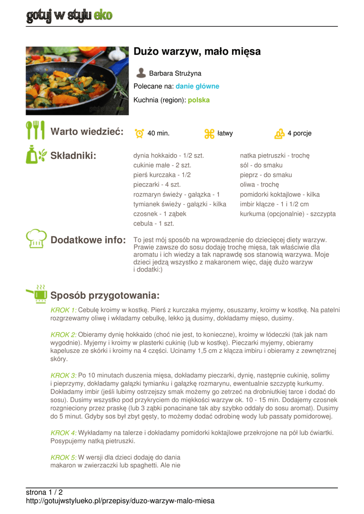 Dużo warzyw, mało mięsa Barbara Strużyna Polecane na: danie główne Kuchnia (region): polska Warto wiedzieć: 40 min. łatwy 4 porcje Składniki: dynia hokkaido - 1/2 szt. cukinie małe - 2 szt. pierś kurczaka - 1/2 pieczarki - 4 szt. rozmaryn świeży - gałązka - 1 tymianek świeży - gałązki - kilka czosnek - 1 ząbek cebula - 1 szt. Dodatkowe info: To jest mój sposób na wprowadzenie do dziecięcej diety warzyw. Prawie zawsze do sosu dodaję trochę mięsa, tak właściwie dla aromatu i ich wiedzy a tak naprawdę sos stanowią warzywa. Moje dzieci jedzą wszystko z makaronem więc, daję dużo warzyw i dodatki:) natka pietruszki - trochę sól - do smaku pieprz - do smaku oliwa - trochę pomidorki koktajlowe - kilka imbir kłącze - 1 i 1/2 cm kurkuma (opcjonalnie) - szczypta Sposób przygotowania: KROK 1: Cebulę kroimy w kostkę. Pierś z kurczaka myjemy, osuszamy, kroimy w kostkę. Na patelni rozgrzewamy oliwę i wkładamy cebulkę, lekko ją dusimy, dokładamy mięso, dusimy. KROK 2: Obieramy dynię hokkaido (choć nie jest, to konieczne), kroimy w łódeczki (tak jak nam wygodnie). Myjemy i kroimy w plasterki cukinię (lub w kostkę). Pieczarki myjemy, obieramy kapelusze ze skórki i kroimy na 4 części. Ucinamy 1,5 cm z kłącza imbiru i obieramy z zewnętrznej skóry. KROK 3: Po 10 minutach duszenia mięsa, dokładamy pieczarki, dynię, następnie cukinię, solimy i pieprzymy, dokładamy gałązki tymianku i gałązkę rozmarynu, ewentualnie szczyptę kurkumy. Dokładamy imbir (jeśli lubimy ostrzejszy smak możemy go zetrzeć na drobniutkiej tarce i dodać do sosu). Dusimy wszystko pod przykryciem do miękkości warzyw ok. 10 - 15 min. Dodajemy czosnek rozgnieciony przez praskę (lub 3 ząbki ponacinane tak aby szybko oddały do sosu aromat). Dusimy do 5 minut. Gdyby sos był zbyt gęsty, to możemy dodać odrobinę wody lub passaty pomidorowej. KROK 4: Wykładamy na talerze i dokładamy pomidorki koktajlowe przekrojone na pół lub ćwiartki. Posypujemy natką pietruszki. KROK 5: W wersji dla dzieci dodaję do dania makaron w zwierzaczki lub spaghetti. Ale nie strona 1 / 2 http://gotujwstylueko.pl/przepisy/duzo-warzyw-malo-miesa jest, to już wtedy danie bezglutenowe (chyba, że wykorzystamy makaron bezglutenowy) Smacznego!! strona 2 / 2 http://gotujwstylueko.pl/przepisy/duzo-warzyw-malo-miesa Powered by TCPDF (www.tcpdf.org)