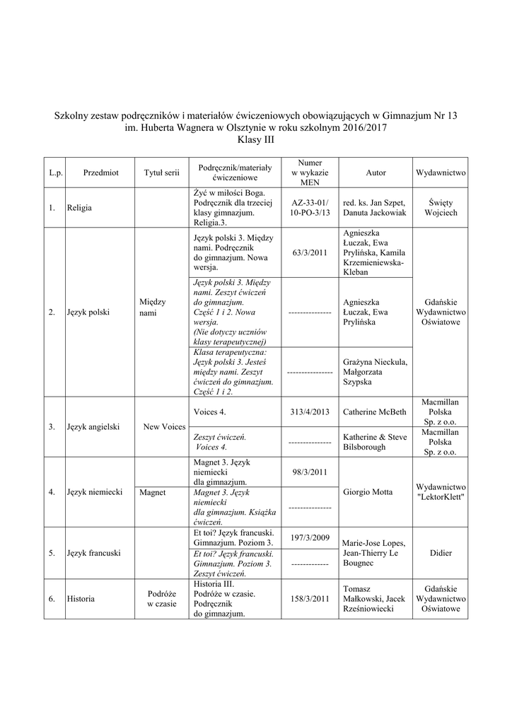 Szkolny zestaw podręczników i materiałów ćwiczeniowych obowiązujących w Gimnazjum Nr 13 im. Huberta Wagnera w Olsztynie w roku szkolnym 2016/2017 Klasy III L.p. 1. Przedmiot Tytuł serii Religia Podręcznik/materiały ćwiczeniowe Numer w wykazie MEN Autor Wydawnictwo Żyć w miłości Boga. Podręcznik dla trzeciej klasy gimnazjum. Religia.3. AZ-33-01/ 10-PO-3/13 red. ks. Jan Szpet, Danuta Jackowiak Święty Wojciech 63/3/2011 Agnieszka Łuczak, Ewa Prylińska, Kamila KrzemieniewskaKleban Język polski 3. Między nami. Podręcznik do gimnazjum. Nowa wersja. 2. 3. 4. 5. 6. Język polski Język angielski Język niemiecki Między nami --------------- Agnieszka Łuczak, Ewa Prylińska ---------------- Grażyna Nieckula, Małgorzata Szypska Voices 4. 313/4/2013 Catherine McBeth Zeszyt ćwiczeń. Voices 4. --------------- Katherine & Steve Bilsborough New Voices Magnet Język francuski Historia Język polski 3. Między nami. Zeszyt ćwiczeń do gimnazjum. Część 1 i 2. Nowa wersja. (Nie dotyczy uczniów klasy terapeutycznej) Klasa terapeutyczna: Język polski 3. Jesteś między nami. Zeszyt ćwiczeń do gimnazjum. Część 1 i 2. Podróże w czasie Magnet 3. Język niemiecki dla gimnazjum. Magnet 3. Język niemiecki dla gimnazjum. Książka ćwiczeń. Et toi? Język francuski. Gimnazjum. Poziom 3. Et toi? Język francuski. Gimnazjum. Poziom 3. Zeszyt ćwiczeń. Historia III. Podróże w czasie. Podręcznik do gimnazjum. Gdańskie Wydawnictwo Oświatowe Macmillan Polska Sp. z o.o. Macmillan Polska Sp. z o.o. 98/3/2011 Giorgio Motta Wydawnictwo "LektorKlett" --------------- 197/3/2009 ------------- 158/3/2011 Marie-Jose Lopes, Jean-Thierry Le Bougnec Didier Tomasz Małkowski, Jacek Rześniowiecki Gdańskie Wydawnictwo Oświatowe 7. 8. Wiedza o społeczeństwie Geografia Dziś i jutro Planeta Nowa Dziś i jutro. Wiedza o społeczeństwie. Podręcznik z ćwiczeniami dla gimnazjum. Część druga. Planeta Nowa. Podręcznik do geografii dla gimnazjum, cz.3 Planeta Nowa. Zeszyt ćwiczeń do geografii dla klasy trzeciej gimnazjum.3. Atlas geograficzny. Polska, kontynenty, świat. Puls życia. Podręcznik do biologii dla gimnazjum. 3. 9. Biologia 10. Chemia 11. Fizyka 12. Matematyka 13. Zajęcia techniczne 77/2/2010 Iwona Janicka, Arkadiusz Janicki, Aleksandra Kucia, Tomasz Maćkowski 7/3/2010 Mariusz Szubert ---------------- Ewa Ćwiklińska, Anna Wawrzkowicz, Justyna Knopik ---------------- Janusz Dajek, Marcin Banasiak 58/3/2010 Puls życia Puls życia. Zeszyt ćwiczeń do biologii dla gimnazjum. 3. ---------------- Chemia Nowej Ery Chemia Nowej Ery. Część 3. Podręcznik dla gimnazjum 49/3/2010 Spotkania z fizyką Spotkania z fizyką. Podręcznik dla gimnazjum. Część 4 93/4/2011 Matematyka z plusem Matematyka 3. Podręcznik dla klasy trzeciej gimnazjum 168/3/2011 Bliżej techniki. O żywności i żywieniu. Gimnazjum. Podręcznik z ćwiczeniami. 226/2/2009 Nowa Era Spółka z o.o Nowa Era Spółka z o.o. Beata Sągin, Andrzej Boczarowski, Marian Sęktas Monika Jaworska, Jolanta Pawłowska, Jacek Pawłowski, Monika Zaleska Nowa Era Spółka z o.o. Jan Kulawik, Teresa Kulawik, Maria Litwin Nowa Era Spółka z o.o. Grażyna FrancuzOrnat, Teresa Kulawik, Maria NowotnyRóżańska Zofia Bolałek, Małgorzata Dobrowolska, Marta Jucewicz, Marcin Karpiński, Jacek Lech, Adam Mysior, Krystyna Zarzycka Maria Boniecka, Danuta Łazuchiewicz Nowa Era Spółka z o.o. Gdańskie Wydawnictwo Oświatowe Wydawnictwa Szkolne i Pedagogiczne Sp. z o.o.
