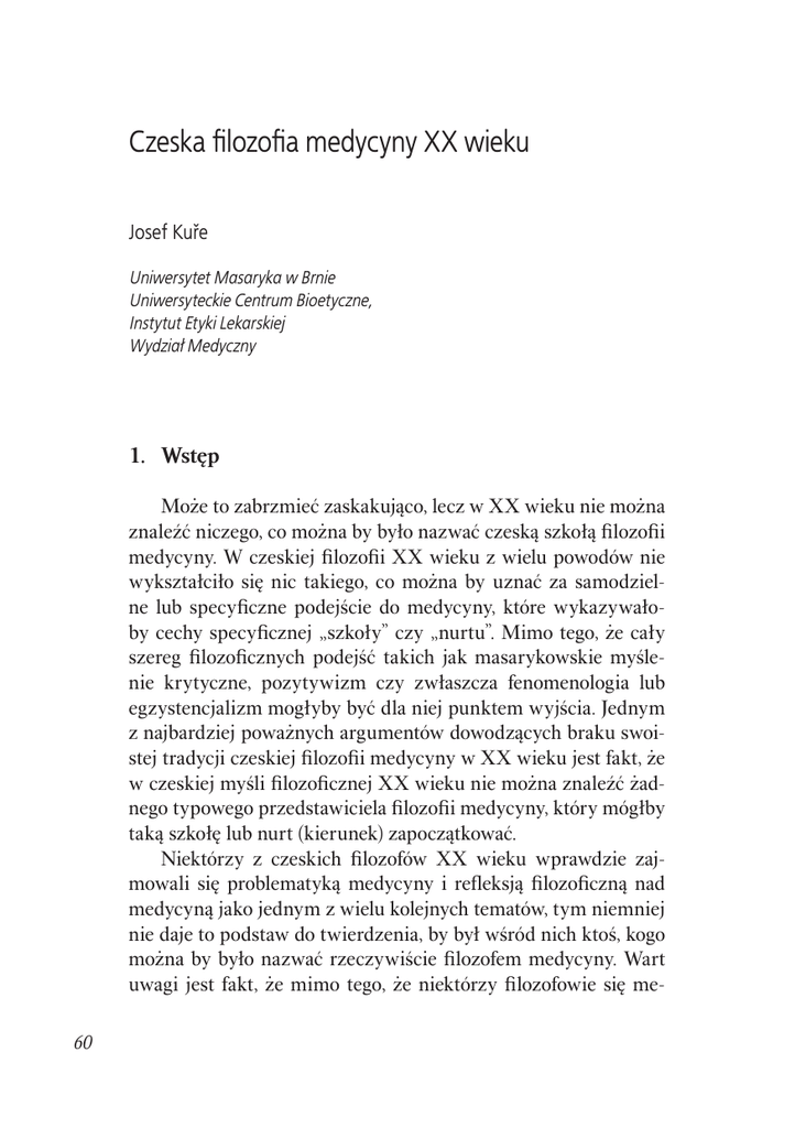 Czeska filozofia medycyny XX wieku Josef Kuře Uniwersytet Masaryka w Brnie Uniwersyteckie Centrum Bioetyczne, Instytut Etyki Lekarskiej Wydział Medyczny 1. Wstęp Może to zabrzmieć zaskakująco, lecz w XX wieku nie można znaleźć niczego, co można by było nazwać czeską szkołą filozofii medycyny. W czeskiej filozofii XX wieku z wielu powodów nie wykształciło się nic takiego, co można by uznać za samodzielne lub specyficzne podejście do medycyny, które wykazywałoby cechy specyficznej „szkoły” czy „nurtu”. Mimo tego, że cały szereg filozoficznych podejść takich jak masarykowskie myślenie krytyczne, pozytywizm czy zwłaszcza fenomenologia lub egzystencjalizm mogłyby być dla niej punktem wyjścia. Jednym z najbardziej poważnych argumentów dowodzących braku swoistej tradycji czeskiej filozofii medycyny w XX wieku jest fakt, że w czeskiej myśli filozoficznej XX wieku nie można znaleźć żadnego typowego przedstawiciela filozofii medycyny, który mógłby taką szkołę lub nurt (kierunek) zapoczątkować. Niektórzy z czeskich filozofów XX wieku wprawdzie zajmowali się problematyką medycyny i refleksją filozoficzną nad medycyną jako jednym z wielu kolejnych tematów, tym niemniej nie daje to podstaw do twierdzenia, by był wśród nich ktoś, kogo można by było nazwać rzeczywiście filozofem medycyny. Wart uwagi jest fakt, że mimo tego, że niektórzy filozofowie się me60 dycyną zajmowali, w trakcie całego XX wieku żaden z czeskich filozofów nie napisał dzieła, które można by było uważać za coś w rodzaju podstawowego podręcznika filozofii medycyny. Z poprzedniego wieku nie pochodzi żadna monografia filozofii medycyny napisana przez czeskiego filozofa. Paradoksalnie jedyną czeską monografią filozofii medycyny jest przekład filozofii medycyny autorów radzieckich z lat 60. minionego stulecia1. Jeżeli przyszłoby nam określić jakąś szkołę w czeskiej filozofii medycyny XX wieku, jedynym nurtem, który jednocześnie można by było oznaczyć za szkołę byłby najprawdopodobniej marksizm-leninizm czy po prostu marksizm. Wśród filozofów i filozofujących 1 Chodzi o tom Filozofie medicíny [Filozofia medycyny], którego autorami są Gennadij Iwanowicz Caregorodcew i Wiktor Porfirjewicz Petlenko, Praha 1984 (oryginał: Filosofskije woprosy mediciny, Moskva 1962, w Polsce por. G. I. Caregorodcew, Materializm dialektyczny a medycyna, Warszawa 1966). Oprócz tej monografii w latach 60.–80. XX w. zostały wydane cztery publikacje, których tytuły zawierają filozofię medycyny i za punkt wyjścia biorą sobie obowiązującą wówczas doktrynę: J. Beránek i in., Filosofické problémy medicíny: Určeno pro posluchače fakulty všeobecného lékařství, fakulty hygienické a fakulty dětského lékařství [Filozoficzne problemy medycyny. Dla słuchaczy wydziału lekarskiego, wydziału higienicznego i wydziału pedriatrii], Praha 1967, 190 s., J. Adamec (red.), Filosofické problémy medicíny. Sborník materiálů ze semináře v Hradci Králové a Pecce ve dnech 24.–26. října 1966 [Filozoficzne problemy medycyny. Zbiór materiałów z seminarium w Hradci Králové i Pecce w dniach 24–26 października 1966], Praha 1968, 184 s., J. Beránek, Z. Šafář, Filosofické a společenské problémy medicíny [Filozoficzne i społeczne problemy medycyny], Praha 1982, 311 s., J. Máchová, M. Hérová (red.), Některé filozofické a metodologické problémy medicíny se zaměřením na pediatrii: sborník výňatků z prací aspirantů fakulty dětského lékařství Univerzity Karlovy z let 1978–1985: studijní příručka pro aspiranty lékařských oborů. Připravil kolektiv pracovníků kabinetu marxismu-leninismu [Niektóre filozoficzne i metodologiczne problemy medycyny z ukierunkowaniem na pediatrię: zbiór cytatów z prac doktorantów wydziału pediatrii Uniwersytetu Karola z lat 1978–1985: skrypt dla doktorantów specjalizacji medycznych. Przygotował zespół pracowników zakładu makrsizmu-leninizmu], Praha 1987, 297 s. Podane podręczniki miały służyć raczej indoktrynacji (zwłaszcza studentów wydziałów lekarskich) niż refleksji filozoficznej, nie przedstawiają sobą żadnej samodzielnej filozofii medycyny, którą mogłaby być jakaś forma nieortodoksyjnej marksistowskiej filozofii medycyny. 61 lekarzy w XX w. znajdziemy kilku autorów, dla których punktem wyjścia była ortodoksja marksistowsko-leninowska lub znajdowali się pod znacznym wpływem marksizmu, jednak nie stworzyli oni samodzielnej szkoły filozoficznej, w ich przypadku chodziło raczej o znajdujące się pod intensywnym wpływem marksizmu lub orientacji lewicowej myślenie. Filozofię medycyny jako „szkołę obowiązkową” w latach 1948–1989 można by tylko z trudem nazwać czeską szkołą marksistowsko-leninowskiej filozofii medycyny, ponieważ o wiele bardziej chodziło tutaj o „marksistowsko-leninowski internacjonalizm”, który specyfikę narodową eliminował. Co więcej, po Praskiej Wiośnie zakończonej inwazją radzieckich i internacjonalistycznych czołgów stało się mniej więcej jasne, że jakakolwiek samodzielna czeska filozofia medycyny „na tym ugorze nie wzejdzie”. Po prostu dobrze już było wiadomo, czym jest rewizjonizm i co znaczy normalizacja.2 Czeska książka zajmująca się w pewnym stopniu także filozofią medycyny została wydana pod tytułem Medycyna w kontekście myśli zachodniej dopiero w 2008 r.3 i oprócz problematyki cierpienia i śmierci w swojej pierwszej części zajmuje się również historią myśli medycznej (s. 17–135). Czeską filozofię medycyny XX w. tworzą więc fragmenty poszczególnych autorów rozproszone po różnych częściach ich dzieł. Można wśród nich dokonać podziału przede wszystkim na dwie grupy: jedną grupę tworzą lekarze, którzy w duchu tradycji hipokratejskiej jako lekarze-filozofowie kontynuowali refleksję wymiaru filozoficznego medycyny,