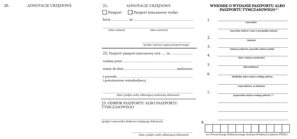 20. ADNOTACJE URZĘDOWE 21. WNIOSEK O WYDANIE PASZPORTU ALBO PASZPORTU TYMCZASOWEGO ADNOTACJE URZĘDOWE Paszport Paszport tymczasowy wydać: Seria ................ nr ........................................................ 1. ..................................................................................... (data wydania) ................................................................. (nazwisko) ................................................................. (data ważności) (nazwisko rodowe i inne w przypadku zmiany) ................................................... (podpis i pieczęć organu paszportowego) 22. Paszport/ paszport tymczasowy serii ..... nr ...................... wydany przez ....................................................................... ważny do dnia ..................................................... anulowano z powodu ............................................................................. i pozostawiono wnioskodawcy. 2. ................................................................. 3. ................................................................. 4. ................................................................. 5. ................................................................. 6. ................................................................. (imiona) (imiona rodziców, nazwisko rodowe matki) (data i miejsce urodzenia) (obywatelstwo) (dokładny adres miejsca stałego pobytu, ................................................................. województwo, nr telefonu) 7. ............................................................................................ (data i podpis osoby odbierającej anulowany dokument) ................................................................. (poprzednie miejsca stałego pobytu) ** ) ................................................................. 23. ODBIÓR PASZPORTU ALBO PASZPORTU TYMCZASOWEGO ................................................................. ..................................................... (podpis i stanowisko służbowe wydającego dokument) ................................................... (data i podpis osoby odbierającej dokument) 8. ................................................................. (nr Powszechnego Elektronicznego Systemu Ewidencji Ludności PESEL) 9. RYSOPIS 14. ZGODA RODZICÓW na wydanie małoletniemu: paszportu ...................................... (wzrost w centymetrach) ...................................... Rodzic/Opiekun ............................................................ (kolor oczu) *** ) ...................................... (znaki szczególne) 10. PŁEĆ: paszportu tymczasowego miejsce na fotografię 35 x 45 mm mężczyzna ADNOTACJE URZĘDOWE Informacja o palcach, których odciski zostały umieszczone w paszporcie (zaznaczyć krzyżykiem), lub przyczyna braku możliwości pobrania odcisków palców .................................................................................... L (imię i nazwisko, numer dokumentu tożsamości i podpis) Rodzic/Opiekun ............................................................ kobieta 16. P ..................................................................................... ..................................................................................... 11. .................................................................................... (imię i nazwisko, numer dokumentu tożsamości i podpis) 17. Uprawnienie do ulgi, powód obniżenia, podwyższenia lub podstawa do zwolnienia z opłaty paszportowej ..................................................................................... ...................................................... (podpis posiadacza paszportu - składa osoba, która ukończyła 13 lat - podpis nie może dotykać ani przecinać ramki) 12. ...................................................................... (rodzaj dokumentu tożsamości, seria i numer) ...................................................................... (data ważności, organ wydający) 13. ...................................................................... (nazwisko i imię osoby, którą można powiadomić w razie konieczności, ...................................................................... miejsce zamieszkania, telefon kontaktowy) (data, podpis i pieczęć przyjmującego zgodę) ..................................................................................... 18. Opłata paszportowa w wysokości .................................... ................................... (miejscowość, data) ................................... (podpis składającego wniosek) 15. POUCZENIE: *) Punkty 1 - 14 wypełnia w sposób czytelny wnioskodawca. **) W przypadku ubiegania się o wydanie paszportu lub paszportu tymczasowego za granicą, podać ostatnie miejsce zameldowania w Polsce (miejscowość, województwo). ***) W rubryce “kolor oczu” należy wpisać, zgodnie ze stanem faktycznym, np: niebieskie, szare, zielone, piwne, brązowe, czarne, czerwone, wielokolorowe, nieokreślone. wniesiona dnia .................................................................. 19. ........................................................... (data, podpis i pieczęć przyjmującego wniosek i pobierającego odciski palców)