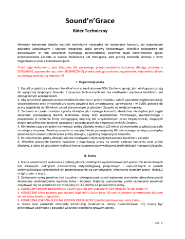 Sound’n’Grace Rider Techniczny Niniejszy dokument określa warunki techniczne niezbędne do wykonania koncertu na najwyższym poziomie jakościowym i stanowi integralną część umowy koncertowej. Wszelkie odstępstwa od postanowień w nim zawartych wymagają potwierdzonej pisemnie bądź elektronicznie zgody przedstawiciela Zespołu w osobie Realizatora lub Managera, pod groźbą zerwania umowy z winy Organizatora wraz z konsekwencjami. Treść tego dokumentu jest kluczowa dla sprawnego przeprowadzenia koncertu, dlatego prosimy o DOKŁADNE zapoznanie się z nim i (KONIECZNIE) przekazanie go osobom bezpośrednio odpowiedzialnym za obsługę techniczną imprezy !!! I. Organizacja pracy 1. Zespół przyjeżdża z własnym backline'm oraz realizatorem FOH. Zarówno sprzęt, jak i obsługa pozostają do wyłącznej dyspozycji Zespołu. Z przyczyn technicznych nie ma możliwości użyczenia backline'u ani obsługi innym wykonawcom. 2. Aby umożliwić sprawne przeprowadzenie montażu i próby dźwięku, całość aparatury nagłośnieniowej, oświetleniowej oraz infrastruktury sceny powinna być zmontowana, sprawdzona i w 100% gotowa do pracy najpóźniej na 30 minut przed planowanym przybyciem Zespołu na miejsce imprezy. 3. Zarówno w czasie montażu i próby dźwięku jak i samego koncertu absolutnie niezbędna jest ciągła obecność przynajmniej dwóch techników sceny oraz realizatorów frontowego, monitorowego i oświetlenia (z ramienia firmy obsługującej imprezę lub przydzielonych przez Organizatora), znających biegle specyfikę dostarczonej aparatury i pozostających do dyspozycji techniki Zespołu. 4. Minimalny czas potrzebny na montaż i próbę dźwięku wynosi 120 minut od momentu przybycia zespołu na miejsce imprezy. Prosimy ponadto o uwzględnienie przynajmniej 60 minutowego odstępu pomiędzy planowanym czasem zakończenia próby dźwięku, a godziną rozpoczęcia koncertu. 5. Po zakończeniu próby dźwięku nie ma możliwości złożenia/przestawienia backline’u Zespołu 6. Wszelkie pozostałe kwestie związane z organizacją pracy na scenie podczas koncertu oraz próby dźwięku, a także ze sposobem realizacji koncertu pozostają w wyłącznej gestii obsługi i managera Zespołu. II. Scena 1. Scena powinna być wykonana z dobrej jakości, stabilnych i wypoziomowanych podestów aluminiowych lub stalowych, pokrytych powierzchnią antypoślizgową, połączonych i usytuowanych w sposób uniemożliwiający jakiekolwiek ich przemieszczanie się czy kołysanie. Minimalne wymiary sceny: 6x8x1.2 m (gł. x szer. x wys.). 2. Zadaszenie sceny powinno być szczelne i zabezpieczone przed wpływem warunków atmosferycznych (konieczne wiatroodporne wysłony tylne i boczne). Najniżej usytuowany punkt zadaszenia powinien znajdować się na wysokości nie mniejszej niż 3,5 metra od powierzchni sceny. 3. KONIECZNY podest pod perkusję 4x2m (wys. 60 cm) ustawiony CENTRALNIE (w osi sceny)!!! 4. KONIECZNE DWA podesty pod ostatni rząd chóru 2x1m (wys. 30 cm) ustawiony symetrycznie skosami do osi sceny (patrz stage plan). 5. KONIECZNA OSŁONA PLEXI NA ZESTAW PERKUSYJNY (pięcioczęściowa wys. min.1.6m) 6. Scena oraz pozostałe elementy konstrukcji (zadaszenia, rampy oświetleniowe itd.) muszą być prawidłowo uziemione i posiadać wszystkie określone prawem atesty. str. 1 III. Zasilanie 1. Zasilanie aparatury nagłaśniającej, oświetleniowej oraz backline'u musi posiadać przydział mocy adekwatny do potrzeb z uwzględnieniem przynajmniej 20% zapasu. Napięcie zasilania musi być stabilne przy pełnym obciążeniu! Nie akceptujemy źródeł zasilania, wykazujących tendencje do przepięć czy chwilowych spadków napięcia. Jest to ekstremalnie ważne z punktu widzenia zarówno jakości koncertu jak i bezpieczeństwa ludzi oraz urządzeń backline'u, dlatego prosimy o dokładne sprawdzenie napięcia zasilania i wykonanie testu obciążeniowego przed przybyciem Zespołu! 2. Gniazda elektryczne na scenie (patrz Plan Sceny) oraz na stanowiskach realizatorów powinny być dobrej jakości, sprawne, zabezpieczone przed zalaniem i wpływem warunków atmosferycznych. 3. Każdy z obwodów zasilania musi być wyposażony w osobne zabezpieczenie prądowe, zaś obwód główny dodatkowo w zabezpieczenie różnicowo – prądowe. 4. Całkowity pobór mocy Naszego backline'u <2300W IV. System frontowy 1. Konieczny jest DUŻY, podwieszany, stereofoniczny system nagłośnieniowy uznanej marki (tj. Lacoustics (wszystkie serie), Adamson (wszystkie serie), Outline, Meyer-Sound (wszystkie serie), Nexo (GeoD lub GeoT), d&b (wszystkie serie), JBL (seria VerTec lub VTX), EAW, Turbosound, Electro-Voice (XLC 127 DVX lub XLE181) minimum 3-drożny z aktywnym podziałem pasma, wolny od szumów i przydźwięków, pozwalający na równomierne pokrycie dźwiękiem o średnim ciśnieniu akustycznym 115dB SPL (A-ważone) całego audytorium w pełnym paśmie akustycznym. Nie zamierzamy oczywiście grać aż tak głośno, potrzebny nam po prostu potężny zapas mocy. Subbas złożony z zestawów wyposażonych w przetworniki o średnicy 18” lub 21”(nie 15”!!! wyjątek: Meyer 600HP), w stosunku mocowym 2:1 (sub:góra) powinien być sterowany wyłączanie z poziomu procesora głośnikowego i zasilany sygnałem sumy (L-R master)! Konstrukcja systemu nie może wymuszać częstotliwości podziału pasma sub:góra wyższej niż 100Hz!!! Pod żadnym pozorem nie akceptujemy systemów nagłośnieniowych „domowej roboty”, kopii, podróbek, tanich rozwiązań chińskich (jak Alphard itp.) ani systemów następujących firm: RCF, FBT, MASTER AUDIO, KME, HK Audio Systemy marki POL-Audio są akceptowane TYLKO I WYŁĄCZNIE pod następującymi warunkami: a) WYŁĄCZNIE ORYGINALNE produkty (kopiom i podróbkom mówimy stanowcze NIE) b) System MUSI być skonfigurowany i zestrojony tuż przed imprezą przez inżyniera z firmy POLAudio, jeśli nie jest to możliwe BEZWZGLĘDNIE prosimy o kontakt. c) Jeśli powyższe waru
