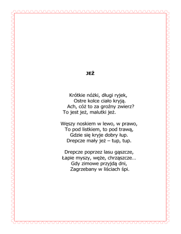 JEŻ Krótkie nóżki, długi ryjek, Ostre kolce ciało kryją. Ach, cóż to za groźny zwierz? To jest jeż, malutki jeż. Węszy noskiem w lewo, w prawo, To pod listkiem, to pod trawą, Gdzie się kryje dobry łup. Drepcze mały jeż – tup, tup. Drepcze poprzez lasu gąszcze, Łapie myszy, węże, chrząszcze… Gdy zimowe przyjdą dni, Zagrzebany w liściach śpi.
