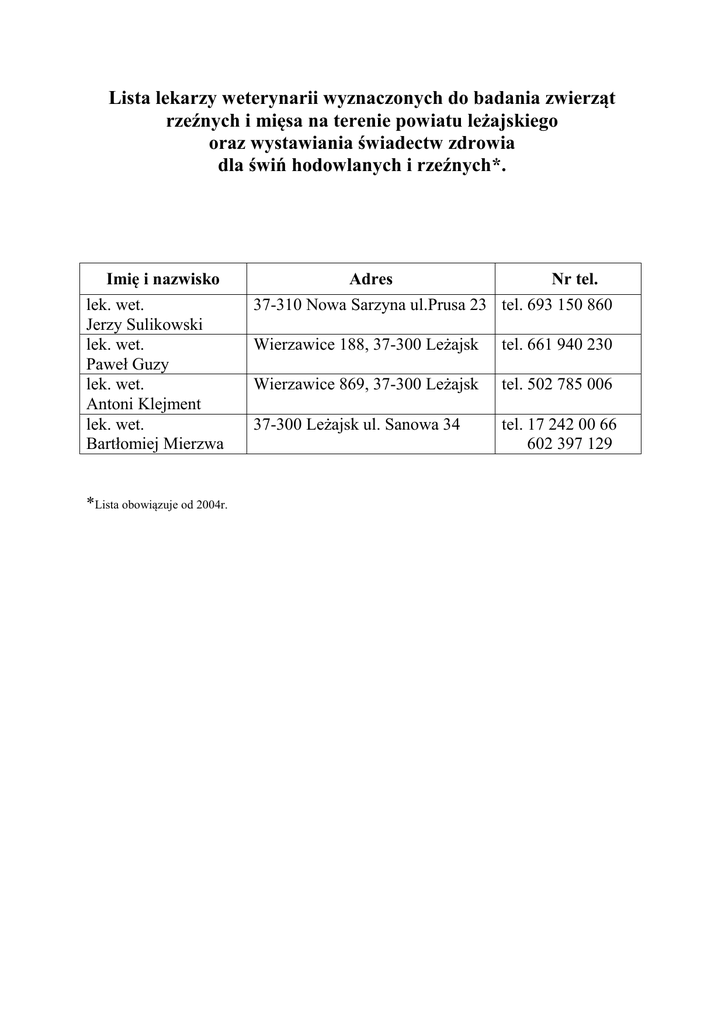 Lista lekarzy weterynarii wyznaczonych do badania zwierząt rzeźnych i mięsa na terenie powiatu leżajskiego oraz wystawiania świadectw zdrowia dla świń hodowlanych i rzeźnych*. Imię i nazwisko lek. wet. Jerzy Sulikowski lek. wet. Paweł Guzy lek. wet. Antoni Klejment lek. wet. Bartłomiej Mierzwa *Lista obowiązuje od 2004r. Adres Nr tel. 37-310 Nowa Sarzyna ul.Prusa 23 tel. 693 150 860 Wierzawice 188, 37-300 Leżajsk tel. 661 940 230 Wierzawice 869, 37-300 Leżajsk tel. 502 785 006 37-300 Leżajsk ul. Sanowa 34 tel. 17 242 00 66 602 397 129