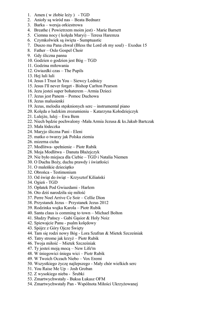 1. Amen ( w żłobie leży ) - TGD 2. Anioły są wśród nas – Beata Bednarz 3. Barka – wersja orkiestrowa 4. Breathe ( Powietrzem moim jest) - Marie Barnett 5. Ciemna nocy ( kolęda Maryi) – Teresa Haremza 6. Czymkolwiek są święta - Sumptuastic 7. Duszo ma Pana chwal (Bless the Lord oh my soul) – Exodus 15 8. Father – Oslo Gospel Choir 9. Gdy śliczna panna 10. Godzien o godzien jest Bóg – TGD 11. Godzina miłowania 12. Gwiazdki czas – The Pupils 13. Hej luli luli 14. Jesus I Trust In You – Siewcy Lednicy 15. Jesus I'll never forget - Bishop Carlton Pearson 16. Jezu jesteś super bohaterem – Armia Dzieci 17. Jezus jest Panem – Pomoc Duchowa 18. Jezus malusienki 19. Jezus, melodia stęsknionych serc – instrumental piano 20. Kolęda o ludzkim zrozumieniu – Katarzyna Kołodziejczyk 21. Lulejże, lulej – Ewa Bem 22. Niech będzie pochwalony -Mała Armia Jezusa & ks.Jakub Bartczak 23. Mała łódeczka 24. Maryjo śliczna Pani - Eleni 25. matko o twarzy jak Polska ziemia 26. mizerna cicha 27. Modlitwa- spełnienie – Piotr Rubik 28. Moja Modlitwa – Danuta Błażejczyk 29. Nie było miejsca dla Ciebie – TGD i Natalia Niemen 30. O Duchu Boży, duchu prawdy i światłości 31. O maleńkie dzieciątko 32. Obrońca - Testimonium 33. Od świąt do świąt – Krzysztof Kiliański 34. Ogień - TGD 35. Opłatek Pod Gwiazdami - Harlem 36. Oto dziś narodziła się miłość 37. Perre Noel Arrive Ce Soir – Cellie Dion 38. Przystanek Jezus – Przystanek Jezus 2012 39. Rodzinka wujka Karola – Piotr Rubik 40. Santa claus is comming to town – Michael Bolton 41. Słudzy Pańscy - Gabi Gąsior & Holy Noiz 42. Spiewajcie Panu - psalm kolędowy 43. Spójrz z Góry Ojcze Święty 44. Tam się rodzi nowy Bóg - Lora Szafran & Mietek Szcześniak 45. Tatry strome jak krzyż – Piotr Rubik 46. Twoja miłość – Mietek Szcześniak 47. Ty jesteś moją mocą – New Life'm 48. W śniegowici śniegu wici – Piotr Rubik 49. W Twoich Oczach Niebo – Vox Eremi 50. Wszystkiego życzę najlepszego - Mały chór wielkich serc 51. You Raise Me Up – Josh Groban 52. Z wysokiego nieba - Śrubki 53. Zmartwychwstały - Buksa Łukasz OFM 54. Zmartwychwstały Pan - Wspólnota Miłości Ukrzyżowanej