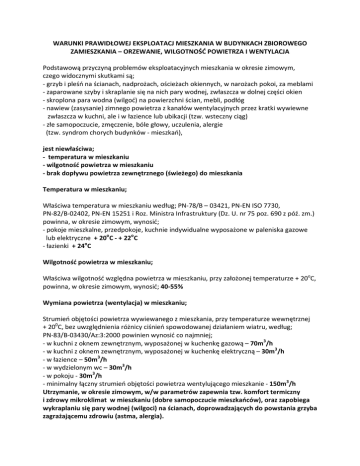WARUNKI PRAWIDŁOWEJ EKSPLOATACJ MIESZKANIA W BUDYNKACH ZBIOROWEGO ZAMIESZKANIA – ORZEWANIE, WILGOTNOŚĆ POWIETRZA I WENTYLACJA Podstawową przyczyną problemów eksploatacyjnych mieszkania w okresie zimowym, czego widocznymi skutkami są; - grzyb i pleśń na ścianach, nadprożach, ościeżach okiennych, w narożach pokoi, za meblami - zaparowane szyby i skraplanie się na nich pary wodnej, zwłaszcza w dolnej części okien - skroplona para wodna (wilgoć) na powierzchni ścian, mebli, podłóg - nawiew (zasysanie) zimnego powietrza z kanałów wentylacyjnych przez kratki wywiewne zwłaszcza w kuchni, ale i w łazience lub ubikacji (tzw. wsteczny ciąg) - złe samopoczucie, zmęczenie, bóle głowy, uczulenia, alergie (tzw. syndrom chorych budynków - mieszkań), jest niewłaściwa; - temperatura w mieszkaniu - wilgotność powietrza w mieszkaniu - brak dopływu powietrza zewnętrznego (świeżego) do mieszkania Temperatura w mieszkaniu; Właściwa temperatura w mieszkaniu według; PN-78/B – 03421, PN-EN ISO 7730, PN-82/B-02402, PN-EN 15251 i Roz. Ministra Infrastruktury (Dz. U. nr 75 poz. 690 z póź. zm.) powinna, w okresie zimowym, wynosić; - pokoje mieszkalne, przedpokoje, kuchnie indywidualne wyposażone w paleniska gazowe lub elektryczne + 20oC - + 22oC - łazienki + 24oC Wilgotność powietrza w mieszkaniu; Właściwa wilgotność względna powietrza w mieszkaniu, przy założonej temperaturze + 20oC, powinna, w okresie zimowym, wynosić; 40-55% Wymiana powietrza (wentylacja) w mieszkaniu; Strumień objętości powietrza wywiewanego z mieszkania, przy temperaturze wewnętrznej + 200C, bez uwzględnienia różnicy ciśnień spowodowanej działaniem wiatru, według; PN-83/B-03430/Az:3:2000 powinien wynosić co najmniej; - w kuchni z oknem zewnętrznym, wyposażonej w kuchenkę gazową – 70m3/h - w kuchni z oknem zewnętrznym, wyposażonej w kuchenkę elektryczną – 30m3/h - w łazience – 50m3/h - w wydzielonym wc – 30m3/h - w pokoju - 30m3/h - minimalny łączny strumień objętości powietrza wentylującego mieszkanie - 150m3/h Utrzymanie, w okresie zimowym, w/w parametrów zapewnia tzw. komfort termiczny i zdrowy mikroklimat w mieszkaniu (dobre samopoczucie mieszkańców), oraz zapobiega wykraplaniu się pary wodnej (wilgoci) na ścianach, doprowadzających do powstania grzyba zagrażającemu zdrowiu (astma, alergia). W celu ułatwienia kontroli wartości tych parametrów można zakupić tzw. „stację pogodową” (koszt od 15 do 50 zł.) mierzącą temperaturę i wilgotność powietrza w mieszkaniu. Utrzymanie w normie (temperatura ok. +200C i wilgotność powietrza ok. 50%) dwóch podstawowych parametrów, zapewnia właściwy i bezpieczny komfort zamieszkiwania. Wilgotność powietrza o wartości poniżej 50% uniemożliwia powstanie i rozwój grzyba!! Z przeprowadzonej analizy, jednoznacznie wynika, że problem występowania wilgoci i zagrzybienia na ścianach, występuje w mieszkaniach w których nadmiernie oszczędzana jest energia cieplna, niezbędna do ogrzania mieszkania, oraz w których brak jest właściwej wentylacji grawitacyjnej – zamontowano szczelną (bez nawiewników) stolarkę okienną i drzwiową. Takie niekorzystne zjawiska nie występowały w poprzednich latach, kiedy nie było opomiarowane indywidualne zużycie ciepła oraz gdy była stara nieszczelna stolarka okienna i drzwiowa. Zgodnie z Roz. Ministra Infrastruktury (Dz. U. nr 75 poz. 690 z późn. zm.) i normą PN-EN-ISO 12207:2001 (okna i drzwi – przepuszczalność powietrza), dopływ powietrza zewnętrznego do pokojów mieszkalnych oraz kuchni z oknem zewnętrznym powinien być zapewniony w następujący sposób: W przypadku zamontowania okien szczelnych (współczynnik infiltracji mniejszy niż 0,3 – 0,5m3), przez nawiewniki powietrza o regulowanym stopniu otwarcia, usytuowane w górnej części okna (w ościeżnicy, ramie skrzydła). Szczelne okna uniemożliwiają napływ zewnętrznego powietrza, a co za tym idzie wydalenie zużytego oraz, w okresie zimowym, powodują powstanie ciągu wstecznego (napływ zimnego powietrza z kanałów wentylacyjnych) powodujących wychłodzenie mieszkania jak i ściany stanowiącej fragment przewodu wentylacyjnego i wykraplanie się na niej pary wodnej i w efekcie zagrzybienia. Częstą reakcją mieszkańców, na to zjawisko, jest szczelne zaklejanie kratek wentylacyjnych, które jest niedopuszczalne!! Prawidłowe działanie wentylacji grawitacyjnej (naturalnej) możliwe jest tylko wówczas, gdy istnieje zarówno nawiew do, jak i wywiew powietrza z mieszkania. Przepływ powietrza jest wymuszany przez różnicę gęstości spowodowaną różnicą temperatury. Ciepłe powietrze jest lekkie i ucieka z mieszkania przez kanał wentylacyjny a w miejsce ciepłego, przez nawiewniki umieszczone w oknach, dostaje się cięższe zimne powietrze. Jednym sposobem rozwiązania tego problemu, jest montaż w oknach nawiewników (nawietrzaków) powietrza (zalecane; higrosterowane - działające automatycznie w zależności od wilgotności wewnętrznego powietrza i termostatyczne – działające samoczynnie pod wpływem zmiany temperatury zewnętrznej) lub przynajmniej usunięcie uszczelek z górnej części okien (mikrowentylacja) oraz częste wietrzenie mieszkania. Nawiew do pomieszczeń bez okien (łazienka, wc) mają zapewnić kratki znajdujące się w dolnej części drzwi, a wywiew z pomieszczeń nie posiadających własnych kratek wentylacyjnych (pokoje, przedpokój), szczeliną między drzwiami a podłogą. Skuteczność wentylacji grawitacyjnej uzależniona jest również od warunków atmosferycznych panujących na zewnątrz budynku; ciśnienia powietrza, temperatury, prędkości i kierunku wiatru. Według wyliczeń ekspertów, utrzymanie w mieszkaniu normatywnej temperatury i wilgotności powietrza (której nadmiar można odprowadzić przewodem wentylacyjnym z pomieszczeń dzięki umożliwieniu napływu z zewnątrz świeżego powietrza), w stosunku do mi