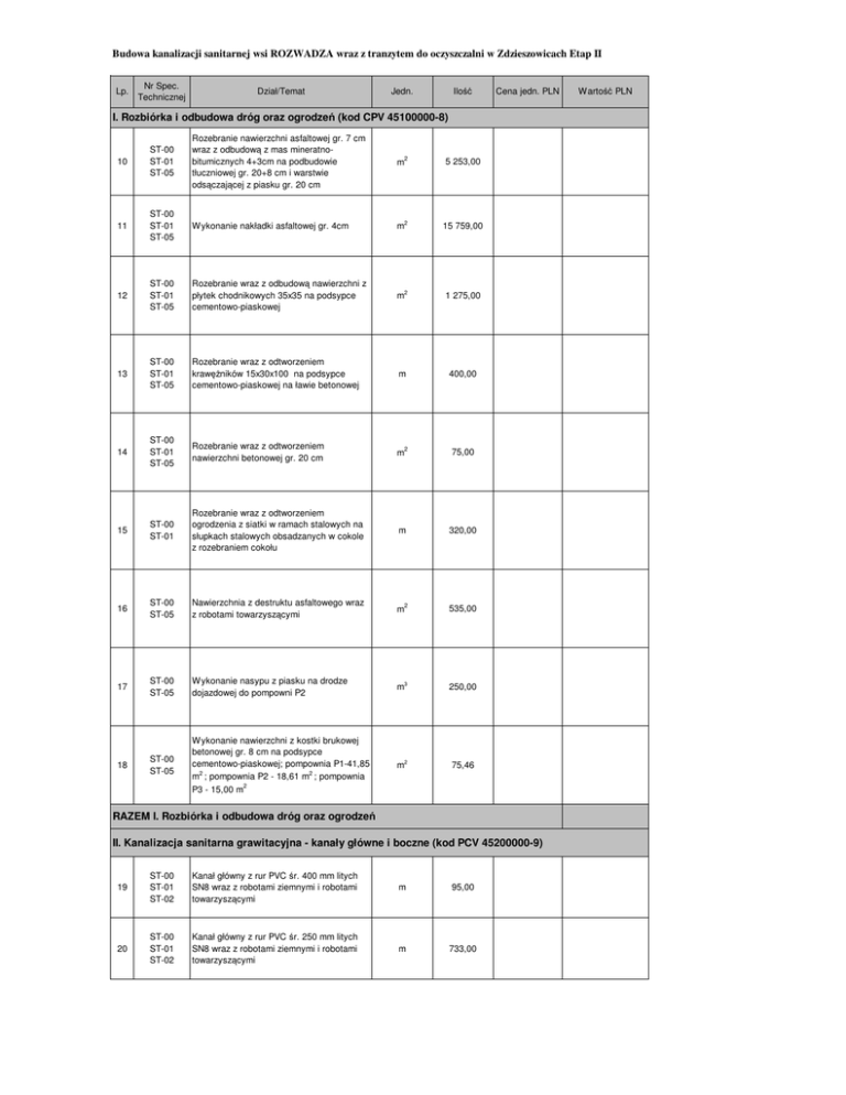 Budowa kanalizacji sanitarnej wsi ROZWADZA wraz z tranzytem do oczyszczalni w Zdzieszowicach Etap II PODKAMIE Lp. Nr Spec. Technicznej Dział/Temat Jedn. Ilość Cena jedn. PLN I. Rozbiórka i odbudowa dróg oraz ogrodzeń (kod CPV 45100000-8) 10 ST-00 ST-01 ST-05 Rozebranie nawierzchni asfaltowej gr. 7 cm wraz z odbudową z mas mineratnobitumicznych 4+3cm na podbudowie tłuczniowej gr. 20+8 cm i warstwie odsączającej z piasku gr. 20 cm m2 5 253,00 11 ST-00 ST-01 ST-05 Wykonanie nakładki asfaltowej gr. 4cm m2 15 759,00 12 ST-00 ST-01 ST-05 Rozebranie wraz z odbudową nawierzchni z płytek chodnikowych 35x35 na podsypce cementowo-piaskowej m2 1 275,00 13 ST-00 ST-01 ST-05 Rozebranie wraz z odtworzeniem krawężników 15x30x100 na podsypce cementowo-piaskowej na ławie betonowej m 400,00 14 ST-00 ST-01 ST-05 Rozebranie wraz z odtworzeniem nawierzchni betonowej gr. 20 cm m2 75,00 15 ST-00 ST-01 Rozebranie wraz z odtworzeniem ogrodzenia z siatki w ramach stalowych na słupkach stalowych obsadzanych w cokole z rozebraniem cokołu m 320,00 16 ST-00 ST-05 Nawierzchnia z destruktu asfaltowego wraz z robotami towarzyszącymi m2 535,00 17 ST-00 ST-05 Wykonanie nasypu z piasku na drodze dojazdowej do pompowni P2 m3 250,00 18 ST-00 ST-05 Wykonanie nawierzchni z kostki brukowej betonowej gr. 8 cm na podsypce cementowo-piaskowej; pompownia P1-41,85 m2 ; pompownia P2 - 18,61 m2 ; pompownia P3 - 15,00 m2 m2 75,46 RAZEM I. Rozbiórka i odbudowa dróg oraz ogrodzeń II. Kanalizacja sanitarna grawitacyjna - kanały główne i boczne (kod PCV 45200000-9) 19 ST-00 ST-01 ST-02 Kanał główny z rur PVC śr. 400 mm litych SN8 wraz z robotami ziemnymi i robotami towarzyszącymi m 95,00 20 ST-00 ST-01 ST-02 Kanał główny z rur PVC śr. 250 mm litych SN8 wraz z robotami ziemnymi i robotami towarzyszącymi m 733,00 Wartość PLN 21 ST-00 ST-01 ST-02 Kanał główny z rur PVC śr. 200 mm litych SN8 wraz z robotami ziemnymi i robotami towarzyszącymi m 5 829,00 22 ST-00 ST-01 ST-02 Kanał boczny z rur PVC śr. 160 mm litych SN8 wraz z robotami ziemnymi i towarzyszącymi m 763,00 23 ST-00 ST-01 ST-04 Wykonanie kompletnych studzienek śr. 1000 mm z betonu kl. B-45 prefabryk. wraz z robotami ziemnymi i robotami towarzyszącymi kpl. 225,00 24 ST-00 ST-01 ST-04 Wykonanie kompletnych studzienek kanalizacyjnych systemowych z tworzyw sztucznych śr. 425 mm wraz z robotami ziemnymi i robotami towarzyszącymi kpl. 155,00 RAZEM II. Kanalizacja sanitarna grawitacyjna - kanały główne i boczne III. Pompownie III.1. Pompownia P1 III.1.1. Roboty montażowe przepompowni ścieków P1 (kod CPV 45200000-9) 24 ST-00 ST-01 ST-04 Kompletna przepompownia wraz z wyposażeniem oraz robotami towarzyszącymi kpl. 1,00 25 ST-00 ST-04 Uruchomienie pompowni ścieków kpl. 1,00 RAZEM III.1.1. Roboty montażowe przepompowni ścieków P1 III.1.2. Roboty elektryczne i AKPiA przepompowni ścieków P1 (kod CPV 45200000-9) 25 ST-00 ST-06 Montaż szafki sterowniczej wraz z robotami towarzyszącymi kpl. 1,00 26 ST-00 ST-06 Wykonanie zasilania elektrycznego pompowni wraz z podaniem napięcia przez EnergiaPro wraz z robotami towarzyszącymi kpl. 1,00 27 ST-00 ST-06 Wykonanie instalacji elektrycznych i AKPiA w pompowni wraz z robotami towarzyszącymi kpl. 1,00 28 ST-00 ST-06 Wykonanie uziomów poziomych i pionowych wraz z robotami towarzyszącymi kpl. 1,00 29 ST-00 ST-06 Oprogramowanie sterownika i panelu sterującego kpl. 1,00 30 ST-00 ST-06 Uruchomienie sterowania i automatyki kpl. 1,00 31 ST-00 ST-06 Wykonanie wizualizacji pracy pompowni w dyspozytorni i uruchomienie komunikacji pomiędzy obiektem a dyspozytornią, a także kompletnego systemu monitoringu kpl. 1,00 RAZEM III.1.2. Roboty elektryczne i AKPiA pompowni ścieków P1 III.1.3. Zagospodarowanie terenu pompowni ścieków P1 (kod PCV 45200000-9) 32 ST-00 ST-01 ST-05 Zagospodarowanie terenu (niwelacja, plac na terenie pompowni, zieleń) kpl. 1,00 RAZEM III.1.3. Zagospodarowanie terenu pompowni ścieków P1 RAZEM III.1. Pompownia P1 III.2. Pompownia P2 III.2.1. Roboty montażowe przepompowni ścieków P2 (kod CPV 45200000-9) 33 ST-00 ST-01 ST-04 Kompletna przepompownia wraz z wyposażeniem oraz robotami towarzyszącymi kpl. 1,00 34 ST-00 ST-04 Uruchomienie pompowni ścieków kpl. 1,00 RAZEM III.2.1. Roboty montażowe przepompowni ścieków P2 III.2.2. Roboty elektryczne i AKPiA przepompowni ścieków P2 (kod CPV 45200000-9) 35 ST-00 ST-06 Montaż szafki sterowniczej wraz z robotami towarzyszącymi kpl. 1,00 36 ST-00 ST-06 Wykonanie zasilania elektrycznego pompowni wraz z podaniem napięcia przez EnergiaPro wraz z robotami towarzyszącymi kpl. 1,00 37 ST-00 ST-06 Wykonanie instalacji elektrycznych i AKPiA w pompowni wraz z robotami towarzyszącymi kpl. 1,00 38 ST-00 ST-06 Wyknanie uziomów poziomych i pionowych wraz z robotami towarzyszącymi kpl. 1,00 39 ST-00 ST-06 Oprogramowanie sterownika i panelu sterującego kpl. 1,00 40 ST-00 ST-06 Uruchomienie sterowania i automatyki kpl. 1,00 41 ST-00 ST-06 Wykonanie wizualizacji pracy pompowni w dyspozytorni i uruchomienie komunikacji pomiędzy obiektem a dyspozytornią, a także kompletnego systemu monitoringu kpl. 1,00 RAZEM III.2.2. Roboty elektryczne i AKPiA pompowni ścieków P2 III.2.3. Zagospodarowanie terenu pompowni ścieków P2 (kod PCV 45200000-9) 42 ST-00 ST-01 ST-05 Zagospodarowanie terenu (niwelacja, plac na terenie pompowni, zieleń) kpl. 1,00 RAZEM III.2.3. Zagospodarowanie terenu pompowni ścieków P2 RAZEM III.2. Pompownia P2 III.3. Pompownia P3 III.3.1. Roboty montażowe przepompowni ścieków P3 (kod CPV 45200000-9) 43 ST-00 ST-01 ST-04 Kompletna przepompownia wraz z wyposażeniem oraz robotami towarzyszącymi kpl. 1,00 44 ST-00 ST-04 Uruchomienie pompowni ścieków kpl. 1,00 RAZEM III.3.1. Roboty montażowe przepompowni ścieków P3 III.3.2. Roboty elektryczne i AKPiA przepompowni ścieków P3 (kod CPV 45200000-9) 45 ST-00 ST-06 Montaż szafki sterowniczej wraz z robotami towarzyszącymi kpl. 1,00 46 ST-00 ST-06 Wykonanie zasilan