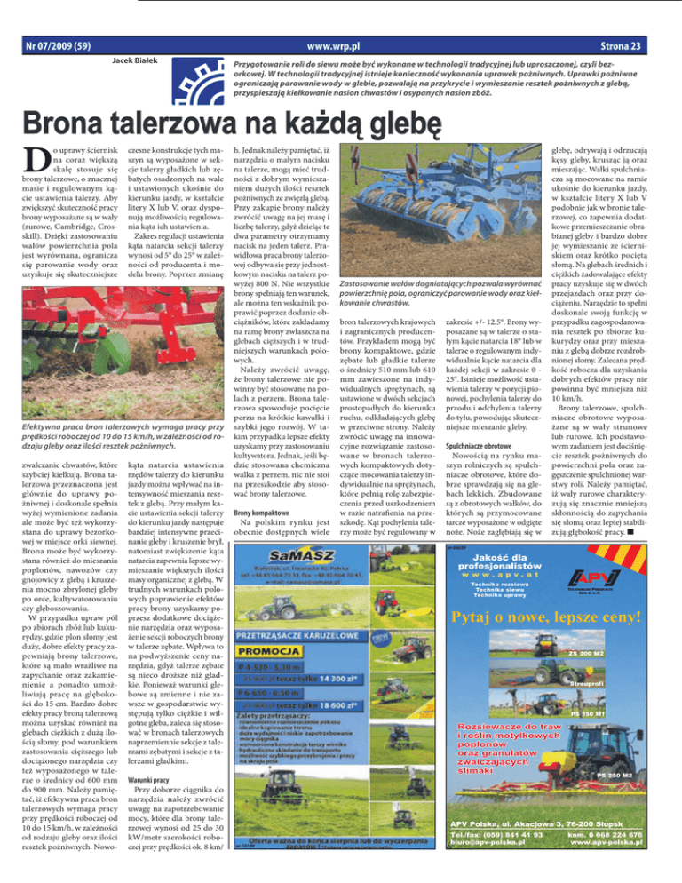Nr 07/2009 (59) www.wrp.pl Jacek Białek Strona 23 Przygotowanie roli do siewu może być wykonane w technologii tradycyjnej lub uproszczonej, czyli bezorkowej. W technologii tradycyjnej istnieje konieczność wykonania uprawek pożniwnych. Uprawki pożniwne ograniczają parowanie wody w glebie, pozwalają na przykrycie i wymieszanie resztek pożniwnych z glebą, przyspieszają kiełkowanie nasion chwastów i osypanych nasion zbóż. Brona talerzowa na każdą glebę D o uprawy ściernisk na coraz większą skalę stosuje się brony talerzowe, o znacznej masie i regulowanym kącie ustawienia talerzy. Aby zwiększyć skuteczność pracy brony wyposażane są w wały (rurowe, Cambridge, Crosskill). Dzięki zastosowaniu wałów powierzchnia pola jest wyrównana, ogranicza się parowanie wody oraz uzyskuje się skuteczniejsze czesne konstrukcje tych maszyn są wyposażone w sekcje talerzy gładkich lub zębatych osadzonych na wale i ustawionych ukośnie do kierunku jazdy, w kształcie litery X lub V, oraz dysponują możliwością regulowania kąta ich ustawienia. Zakres regulacji ustawienia kąta natarcia sekcji talerzy wynosi od 5° do 25° w zależności od producenta i modelu brony. Poprzez zmianę Efektywna praca bron talerzowych wymaga pracy przy prędkości roboczej od 10 do 15 km/h, w zależności od rodzaju gleby oraz ilości resztek pożniwnych. zwalczanie chwastów, które szybciej kiełkują. Brona talerzowa przeznaczona jest głównie do uprawy pożniwnej i doskonale spełnia wyżej wymienione zadania ale może być też wykorzystana do uprawy bezorkowej w miejsce orki siewnej. Brona może być wykorzystana również do mieszania poplonów, nawozów czy gnojowicy z glebą i kruszenia mocno zbrylonej gleby po orce, kultywatorowaniu czy głęboszowaniu. W przypadku upraw pól po zbiorach zbóż lub kukurydzy, gdzie plon słomy jest duży, dobre efekty pracy zapewniają brony talerzowe, które są mało wrażliwe na zapychanie oraz zakamienienie a ponadto umożliwiają pracę na głębokości do 15 cm. Bardzo dobre efekty pracy broną talerzową można uzyskać również na glebach ciężkich z dużą ilością słomy, pod warunkiem zastosowania cięższego lub dociążonego narzędzia czy też wyposażonego w talerze o średnicy od 600 mm do 900 mm. Należy pamiętać, iż efektywna praca bron talerzowych wymaga pracy przy prędkości roboczej od 10 do 15 km/h, w zależności od rodzaju gleby oraz ilości resztek pożniwnych. Nowo- kąta natarcia ustawienia rzędów talerzy do kierunku jazdy można wpływać na intensywność mieszania resztek z glebą. Przy małym kacie ustawienia sekcji talerzy do kierunku jazdy następuje bardziej intensywne przecinanie gleby i kruszenie brył, natomiast zwiększenie kąta natarcia zapewnia lepsze wymieszanie większych ilości masy organicznej z glebą. W trudnych warunkach polowych poprawienie efektów pracy brony uzyskamy poprzesz dodatkowe dociążenie narzędzia oraz wyposażenie sekcji roboczych brony w talerze zębate. Wpływa to na podwyższenie ceny narzędzia, gdyż talerze zębate są nieco droższe niż gładkie. Ponieważ warunki glebowe są zmienne i nie zawsze w gospodarstwie występują tylko ciężkie i wilgotne gleba, zaleca się stosować w bronach talerzowych naprzemiennie sekcje z talerzami zębatymi i sekcje z talerzami gładkimi. Warunki pracy Przy doborze ciągnika do narzędzia należy zwrócić uwagę na zapotrzebowanie mocy, które dla brony talerzowej wynosi od 25 do 30 kW/metr szerokości roboczej przy prędkości ok. 8 km/ h. Jednak należy pamiętać, iż narzędzia o małym nacisku na talerze, mogą mieć trudności z dobrym wymieszaniem dużych ilości resztek pożniwnych ze zwięzłą glebą. Przy zakupie brony należy zwrócić uwagę na jej masę i liczbę talerzy, gdyż dzieląc te dwa parametry otrzymamy nacisk na jeden talerz. Prawidłowa praca brony talerzowej odbywa się przy jednostkowym nacisku na talerz powyżej 800 N. Nie wszystkie brony spełniają ten warunek, ale można ten wskaźnik poprawić poprzez dodanie obciążników, które zakładamy na ramę brony zwłaszcza na glebach cięższych i w trudniejszych warunkach polowych. Należy zwrócić uwagę, że brony talerzowe nie powinny być stosowane na polach z perzem. Brona talerzowa spowoduje pocięcie perzu na krótkie kawałki i szybki jego rozwój. W takim przypadku lepsze efekty uzyskamy przy zastosowaniu kultywatora. Jednak, jeśli będzie stosowana chemiczna walka z perzem, nic nie stoi na przeszkodzie aby stosować brony talerzowe. Brony kompaktowe Na polskim rynku jest obecnie dostępnych wiele Zastosowanie wałów dogniatających pozwala wyrównać powierzchnię pola, ograniczyć parowanie wody oraz kiełkowanie chwastów. bron talerzowych krajowych i zagranicznych producentów. Przykładem mogą być brony kompaktowe, gdzie zębate lub gładkie talerze o średnicy 510 mm lub 610 mm zawieszone na indywidualnych sprężynach, są ustawione w dwóch sekcjach prostopadłych do kierunku ruchu, odkładających glebę w przeciwne strony. Należy zwrócić uwagę na innowacyjne rozwiązanie zastosowane w bronach talerzowych kompaktowych dotyczące mocowania talerzy indywidualnie na sprężynach, które pełnią rolę zabezpieczenia przed uszkodzeniem w razie natrafienia na przeszkodę. Kąt pochylenia talerzy może być regulowany w zakresie +/- 12,5°. Brony wyposażane są w talerze o stałym kącie natarcia 18° lub w talerze o regulowanym indywidualnie kącie natarcia dla każdej sekcji w zakresie 0 25°. Istnieje możliwość ustawienia talerzy w pozycji pionowej, pochylenia talerzy do przodu i odchylenia talerzy do tyłu, powodując skuteczniejsze mieszanie gleby. Spulchniacze obrotowe Nowością na rynku maszyn rolniczych są spulchniacze obrotowe, które dobrze sprawdzają się na glebach lekkich. Zbudowane są z obrotowych wałków, do których są przymocowane tarcze wyposażone w odgięte noże. Noże zagłębiają się w glebę, od