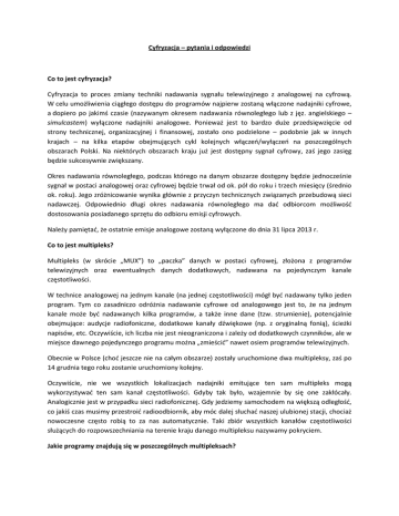 Cyfryzacja – pytania i odpowiedzi Co to jest cyfryzacja? Cyfryzacja to proces zmiany techniki nadawania sygnału telewizyjnego z analogowej na cyfrową. W celu umożliwienia ciągłego dostępu do programów najpierw zostaną włączone nadajniki cyfrowe, a dopiero po jakimś czasie (nazywanym okresem nadawania równoległego lub z jęz. angielskiego – simulcastem) wyłączone nadajniki analogowe. Ponieważ jest to bardzo duże przedsięwzięcie od strony technicznej, organizacyjnej i finansowej, zostało ono podzielone – podobnie jak w innych krajach – na kilka etapów obejmujących cykl kolejnych włączeń/wyłączeń na poszczególnych obszarach Polski. Na niektórych obszarach kraju już jest dostępny sygnał cyfrowy, zaś jego zasięg będzie sukcesywnie zwiększany. Okres nadawania równoległego, podczas którego na danym obszarze dostępny będzie jednocześnie sygnał w postaci analogowej oraz cyfrowej będzie trwał od ok. pół do roku i trzech miesięcy (średnio ok. roku). Jego zróżnicowanie wynika głównie z przyczyn technicznych związanych przebudową sieci nadawczej. Odpowiednio długi okres nadawania równoległego ma dać odbiorcom możliwość dostosowania posiadanego sprzętu do odbioru emisji cyfrowych. Należy pamiętać, że ostatnie emisje analogowe zostaną wyłączone do dnia 31 lipca 2013 r. Co to jest multipleks? Multipleks (w skrócie „MUX”) to „paczka” danych w postaci cyfrowej, złożona z programów telewizyjnych oraz ewentualnych danych dodatkowych, nadawana na pojedynczym kanale częstotliwości. W technice analogowej na jednym kanale (na jednej częstotliwości) mógł być nadawany tylko jeden program. Tym co zasadniczo odróżnia nadawanie cyfrowe od analogowego jest to, że na jednym kanale może być nadawanych kilka programów, a także inne dane (tzw. strumienie), potencjalnie obejmujące: audycje radiofoniczne, dodatkowe kanały dźwiękowe (np. z oryginalną fonią), ścieżki napisów, etc. Oczywiście, ich liczba nie jest nieograniczona i zależy od dodatkowych czynników, ale w miejsce dawnego pojedynczego programu można „zmieścić” nawet osiem programów telewizyjnych. Obecnie w Polsce (choć jeszcze nie na całym obszarze) zostały uruchomione dwa multipleksy, zaś po 14 grudnia tego roku zostanie uruchomiony kolejny. Oczywiście, nie we wszystkich lokalizacjach nadajniki emitujące ten sam multipleks mogą wykorzystywać ten sam kanał częstotliwości. Gdyby tak było, wzajemnie by się one zakłócały. Analogicznie jest w przypadku sieci radiofonicznej. Gdy jedziemy samochodem na większą odległość, co jakiś czas musimy przestroić radioodbiornik, aby móc dalej słuchać naszej ulubionej stacji, chociaż nowoczesne często robią to za nas automatycznie. Taki zbiór wszystkich kanałów częstotliwości służących do rozpowszechniania na terenie kraju danego multipleksu nazywamy pokryciem. Jakie programy znajdują się w poszczególnych multipleksach? Dla ich rozróżnienia multipleksy zostały ponumerowane od 1 do 3. Będą w nich zawarte następujące programy: MUX-1: TVP1, TVP2, TVP Info, Polo TV, ESKA TV, ATM Rozrywka TV, U-TV; MUX-2: Polsat, Polsat Sport News, TVN, TVN7, TV Puls, TV4, TV6; MUX-3: TVP1, TVP2, TVP INFO, TVP Kultura, TVP Historia; Wszystkie ww. programy są dostępne bez dodatkowych opłat poza obejmującą wszystkich posiadaczy telewizorów opłatą abonamentową. MUX-1 będzie dostępny na wybranych obszarach Polski od 14 grudnia 2011 r. Programy TVP1 w MUX-1 oraz TVP2 w MUX-3 z dniem 1 czerwca 2012 roku będą nadawane w wysokiej rozdzielczości (tzw. HD), co umożliwi obserwowanie zmagań na Euro2012 oraz podczas letniej Olimpiady w Londynie w jeszcze lepszej jakości z większą liczbą szczegółów. Jednocześnie w tym terminie znacząco zostanie poprawiony zasięg MUX-1, więc dla wielu odbiorców „przygoda” z cyfrową Jedynką rozpocznie się od razu w wysokiej rozdzielczości. Co to jest HD? HD to skrót od angielskiego wyrażenia „High Definition” i oznacza obraz wysokiej rozdzielczości czyli taki, który składa się większej liczby elementarnych punktów tworzących obraz (tzw. pikseli). Obraz HD, zwłaszcza na ekranach o dużych przekątnych, daje możliwość przekazania większej liczby szczegółów, a tym samym zwiększa realizm przekazów. Docenią to głównie widzowie audycji sportowych oraz przyrodniczych oraz wysokobudżetowych produkcji filmowych. Aby był możliwy odbiór HD, konieczne jest, aby odbiorca posiadał odpowiedni telewizor (zob. dział Jaki telewizor jest potrzebny do odbioru TV cyfrowej?), zaś nadawca rozpowszechniał program w tym formacie. Wśród programów dostępnych w rozpowszechnianych naziemnie TVP1 oraz TVP2 będą pierwszymi dostępnymi w wysokiej rozdzielczości. Kiedy zostanie włączony sygnał cyfrowy? Włączenia sygnału cyfrowego będą dokonywane etapami, zgodnie z informacjami zawartymi w tabeli. Obszar MUX-1 MUX-2 MUX-3 Rzeszów, Warszawa, Wisła, Zielona Góra, Żagań Białogard, Białystok, Bieszczady, Bydgoszcz, Częstochowa, Dęblin, Elbląg, Gdański, Giżycko, Gniezno, Gorlice, Iława, Jelenia Góra, Kalisz, Katowice, Kielce, Kłodzko, Konin, Koszalin, Kraków, Lębork, Lublin, Łódź, Olsztyn, Opoczno, Opole, Piła, Płock, Poznań, Przemyśl, Rabka, Siedlce, Suwałki, Szczawnica, Szczecin, Świnoujście, Tarnów, Wrocław, Zakopane, Zamość Leżajsk, Ostrołęka Białogard, Białystok, Bydgoszcz, Częstochowa, Dęblin, Elbląg, Gdańsk, Iława, Kalisz, Katowice, Kielce, Kłodzko, Konin, Koszalin, Kraków, Lębork, Lublin, Olsztyn, Opoczno, Opole, Piła, Płock, Poznań, Przemyśl, Rabka, Rzeszów, Siedlce, Suwałki, Szczawnica, Szczecin, Świnoujście, Tarnów, Warszawa, Wisła, Wrocław, Zakopane, Zamość, Zielona Góra, Żagań Bieszczady, Gniezno, Gorlice, Leżajsk, Łódź, Ostrołęka Giżycko, Jelenia Góra Białystok, Bydgoszcz, Częstochowa, Elbląg, Gdańsk, Gorzów Wielkopolski, Iława, Katowi