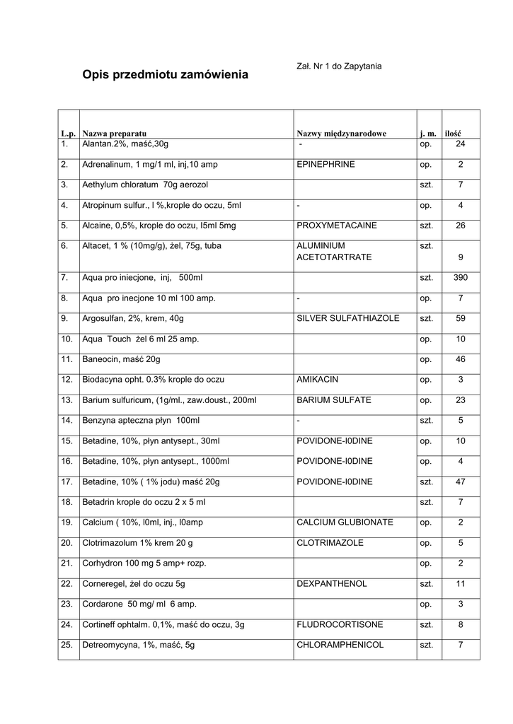 Opis przedmiotu zamówienia Zał. Nr 1 do Zapytania L.p. Nazwa preparatu 1. Alantan.2%, maść,30g Nazwy międzynarodowe - j. m. ilość op. 24 2. Adrenalinum, 1 mg/1 ml, inj,10 amp EPINEPHRINE op. 2 3. Aethylum chloratum 70g aerozol szt. 7 4. Atropinum sulfur., l %,krople do oczu, 5ml - op. 4 5. Alcaine, 0,5%, krople do oczu, I5ml 5mg PROXYMETACAINE szt. 26 6. Altacet, 1 % (10mg/g), żel, 75g, tuba ALUMINIUM ACETOTARTRATE szt. 7. Aqua pro iniecjone, inj, 500ml 8. Aqua pro inecjone 10 ml 100 amp. 9. Argosulfan, 2%, krem, 40g 10. 9 szt. 390 - op. 7 SILVER SULFATHIAZOLE szt. 59 Aqua Touch żel 6 ml 25 amp. op. 10 11. Baneocin, maść 20g op. 46 12. Biodacyna opht. 0.3% krople do oczu AMIKACIN op. 3 13. Barium sulfuricum, (1g/ml., zaw.doust., 200ml BARIUM SULFATE op. 23 14. Benzyna apteczna płyn 100ml - szt. 5 15. Betadine, 10%, płyn antysept., 30ml POVIDONE-I0DINE op. 10 16. Betadine, 10%, płyn antysept., 1000ml POVIDONE-I0DINE op. 4 17. Betadine, 10% ( 1% jodu) maść 20g POVIDONE-I0DINE szt. 47 18. Betadrin krople do oczu 2 x 5 ml szt. 7 19. Calcium ( 10%, l0ml, inj., l0amp CALCIUM GLUBIONATE op. 2 20. Clotrimazolum 1% krem 20 g CLOTRIMAZOLE op. 5 21. Corhydron 100 mg 5 amp+ rozp. op. 2 22. Corneregel, żel do oczu 5g szt. 11 23. Cordarone 50 mg/ ml 6 amp. op. 3 24. Cortineff ophtalm. 0,1%, maść do oczu, 3g FLUDROCORTISONE szt. 8 25. Detreomycyna, 1%, maść, 5g CHLORAMPHENICOL szt. 7 DEXPANTHENOL 26. Detreomycyna, 2%, maść, 5g CHLORAMPHENICOL szt. 32 27. Dexapolcort, 0,01%, aer, 30ml DEXAMETHASONE szt. 11 28. Dexaven 4mg/ml op. 2 29. Dicortineff, zaw,., do oczu i uszu 5 ml. szt. 3 30. Dicortineff maść do oczu op. 3 31. Gentamicin 40 mg/ ml ampułki 1ml op. 2 32. Gentamicin, 0,3%, krople do oczu 5 ml szt. 2 33. Glucozum 20% 10 ml 10 amp. op. 2 34. Heparinum, 300 j.m./g, krem, 20g op. 7 35. Hydrocortisonum 1% krem 15g op. 3 36. Furosemidum, 20mg/2ml., inj., 5amp FUROSEMIDE op. 2 37. Ketonal 100mg/2 ml., inj. dom., doz., 10 amp. KETOPROFEN op. 7 38. Lignocainum h/ch!or., 1% 20ml, inj., 5 Fiol. LIDOCAINE op. 2 39. Lignocainum h/ch!or., 2% 2ml, inj., 10 Fiol. LIDOCAINE op. 357 40. Lignocainum h/chlor., 2%, 20ml., inj., 20 amp. LIDOCAINE op. 19 41. Lignocainum h/chlor., 2% żel typ U, 30g LIDOCAINE szt. 91 42. Lignocainum h/chlor., 2% żel typ A, 30g LIDOCAINE szt. 48 43. Linomag, maść 30g szt. 40 44. Lidokaina 10% aerozol 38 g op. 5 45. Neomycinum,(6,8 mg/ml), aer, na skórę, 55 ml NEOMYCIN szt. 6 46. Neomycinum, 0,5 %, maść do oczu, 3g NEOMYCIN op. 76 47. Natr. Chloratum, 0,9%,l0 ml.inj., (pl) l00 amp - op. 32 48. Natr.chloratum, 0,9%inj., pl. 500 ml. - szt. 98 49. Natr.chloratum, 10%, 10 ml, inj,(szkło) , 10 amp. op. 33 50. No-Spa 40mg/2ml ,inj., 5 amp. DROTAVERINE szt. 1 51. Octanisept dezynfekcja skóry/bł. śluzowej - op. 21 52. Octanisept dezynfekcja skóry/bł. śluzowej 1000 ml op. 27 53. Oxycort aerozol 30 ml. szt. 2 54. Parafinum 100 g Liq. op. 39 - 250 ml 55. Phenazolinum, 100mg/2ml. Inj., l0amp., szt. 3 56. Polopiryna S 0,3 g 20 tab. op. 4 57. Relanium 5 mg/ml inj. 5 amp. op. 2 58. Sulfacetamidum H-E-C, 10%, krople 2x5ml szt. 3 59. Solcoseryl, 0,5% maść 20g szt. 5 60. Solcoseryl, 10 %, żel do ciała, 20g szt. 8 61. Sol. Neosynephrin - POS 10% op. 2 62. Spasmalgon, 5ml, inj. 10 amp op. 4 63. Spir. Salicylowy 2% 100 g szt. 21 64. Sulfocetamidum Natr 10 % 0,5 ml kroplea 12 szt. - op. 2 65. Woda utleniona 3% 100 g - szt. 62 66. Tropicamidum 0,5% (5mg/ml) krop.. do oczu 2x5ml - op. 3 67. Tropicamidum 1 % (5mg/ml) kropi. do oczu 2x5ml szt. 6 68. Teophylinum 12 mg/ml 250 ml butelka op. 2 69. Wazelina biała a 250 g op.. 16 70. Vagothyl 36% płyn do stos. zewn. 50g szt. 2 71. Marcaine Spinal 0,5% 5 mg/ml a 5 amp. Po 4 ml op. 3 72. Płyn Ringera a 500 ml szt. 2 - POLICRESULEN