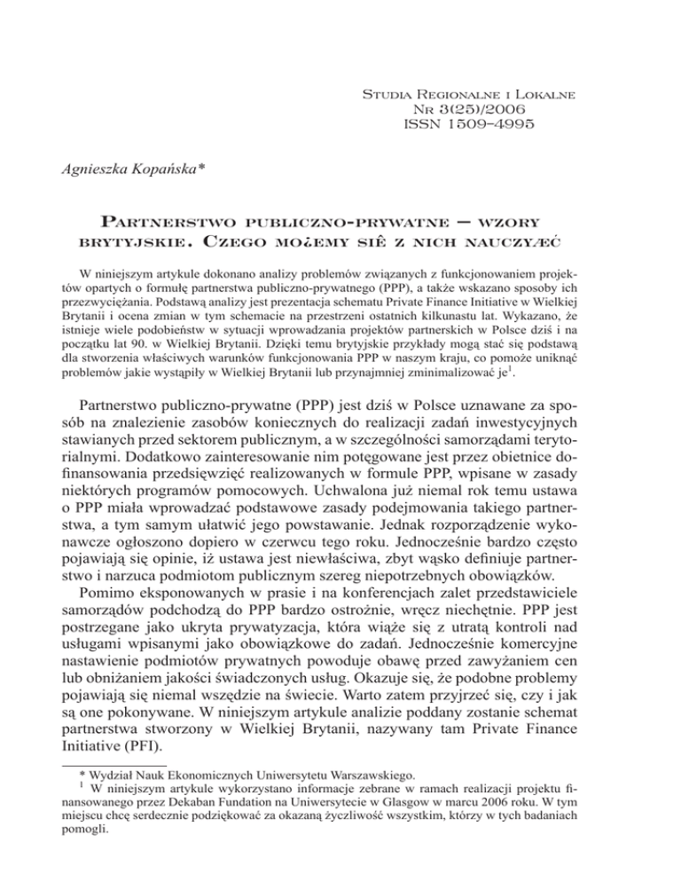 Studia Regionalne i Lokalne Nr 3(25)/2006 ISSN 1509–4995 Agnieszka Kopańska* Partnerstwo publiczno-prywatne – wzory brytyjskie. Czego mo¿emy siê z nich nauczyæć W niniejszym artykule dokonano analizy problemów związanych z funkcjonowaniem projektów opartych o formułę partnerstwa publiczno-prywatnego (PPP), a także wskazano sposoby ich przezwyciężania. Podstawą analizy jest prezentacja schematu Private Finance Initiative w Wielkiej Brytanii i ocena zmian w tym schemacie na przestrzeni ostatnich kilkunastu lat. Wykazano, że istnieje wiele podobieństw w sytuacji wprowadzania projektów partnerskich w Polsce dziś i na początku lat 90. w Wielkiej Brytanii. Dzięki temu brytyjskie przykłady mogą stać się podstawą dla stworzenia właściwych warunków funkcjonowania PPP w naszym kraju, co pomoże uniknąć problemów jakie wystąpiły w Wielkiej Brytanii lub przynajmniej zminimalizować je. Partnerstwo publiczno-prywatne (PPP) jest dziś w Polsce uznawane za sposób na znalezienie zasobów koniecznych do realizacji zadań inwestycyjnych stawianych przed sektorem publicznym, a w szczególności samorządami terytorialnymi. Dodatkowo zainteresowanie nim potęgowane jest przez obietnice dofinansowania przedsięwzięć realizowanych w formule PPP, wpisane w zasady niektórych programów pomocowych. Uchwalona już niemal rok temu ustawa o PPP miała wprowadzać podstawowe zasady podejmowania takiego partnerstwa, a tym samym ułatwić jego powstawanie. Jednak rozporządzenie wykonawcze ogłoszono dopiero w czerwcu tego roku. Jednocześnie bardzo często pojawiają się opinie, iż ustawa jest niewłaściwa, zbyt wąsko definiuje partnerstwo i narzuca podmiotom publicznym szereg niepotrzebnych obowiązków. Pomimo eksponowanych w prasie i na konferencjach zalet przedstawiciele samorządów podchodzą do PPP bardzo ostrożnie, wręcz niechętnie. PPP jest postrzegane jako ukryta prywatyzacja, która wiąże się z utratą kontroli nad usługami wpisanymi jako obowiązkowe do zadań. Jednocześnie komercyjne nastawienie podmiotów prywatnych powoduje obawę przed zawyżaniem cen lub obniżaniem jakości świadczonych usług. Okazuje się, że podobne problemy pojawiają się niemal wszędzie na świecie. Warto zatem przyjrzeć się, czy i jak są one pokonywane. W niniejszym artykule analizie poddany zostanie schemat partnerstwa stworzony w Wielkiej Brytanii, nazywany tam Private Finance Initiative (PFI). * Wydział Nauk Ekonomicznych Uniwersytetu Warszawskiego. W niniejszym artykule wykorzystano informacje zebrane w ramach realizacji projektu finansowanego przez Dekaban Fundation na Uniwersytecie w Glasgow w marcu 2006 roku. W tym miejscu chcę serdecznie podziękować za okazaną życzliwość wszystkim, którzy w tych badaniach pomogli. 84 Agnieszka Kopańska 1. Historia PFI Idea partnerstwa publiczno-prywatnego pojawiła się w Wielkiej Brytanii jako jeden z elementów nowego spojrzenia na sektor publiczny na przełomie lat 80. i 90. ubiegłego wieku, kreowanego przez Partię Konserwatywną. Uważano, że szansą na poprawę efektywności działania sektora publicznego stanie się poddanie go regułom działania rynkowego, w tym konkurencji. Wyrazem tego stało się dopuszczenie prywatnych firm do konkurowania o wykonywanie zadań publicznych, a ostatecznie wprowadzenie w 1992 roku Private Finance Initiative (Falconer, McLaughlin 2000, s. 120). „PFI jest formą partnerstwa publiczno-prywatnego łączącą elementy publicznej realizacji programu inwestycyjnego, w którym sektor publiczny nabywa od podmiotów prywatnych kapitał trwały, oraz outsourcingu, gdzie wykonywanie usług publicznych jest zlecone podmiotom prywatnym” (Allen 2001, s. 10), Jak widać z powyższej definicji, PFI to forma partnerstwa publiczno-prywatnego związana przede wszystkim z inwestycją infrastrukturalną realizowaną przez prywatne podmioty i jednocześnie, przejęciem obsługi usługi opartej na tej infrastrukturze przez partnera prywatnego. Najczęściej będzie to partnerstwo typu DBFO (zaprojektuj-buduj-sfinansuj-obsługuj). Zatem jak widać, jest PFI tylko jedną z wielu form partnerstwa publiczno-prywatnego, nastawioną szczególnie na sfinansowanie koniecznych publicznych inwestycji. Ten ostatni powód był zresztą bezpośrednią przyczyną promowania PFI w Wielkiej Brytanii. Na początku lat 90. deficyt finansów publicznych przekraczał w tym kraju 4% PKB (w 1993 roku wyniósł nawet 8% PKB). Jednocześnie znaczne problemy finansów publicznych spowodowały ograniczenie wydatków inwestycyjnych, które na początku lat 90. malały z roku na rok o 15%. (PFI-meeting 2003, s. 14). Istniała także konieczność podniesienia jakości usług publicznych, wynikająca z jednej strony z oczekiwań społecznych, a z drugiej z obowiązku dostosowania do norm europejskich. Spodziewano się, że dzięki PFI nastąpi znaczący wzrost wydatków inwestycyjnych związanych z infrastrukturą, a jednocześnie że wydatki te nie będą obciążały publicznych budżetów. Pomimo tych oczekiwań, jak pokazuje poniższa rycina, pierwsze lata po wprowadzeniu PFI przyniosły dość skromne wyniki. Dlatego też, aby przyspieszyć wykorzystanie PFI, w 1994 roku wprowadzono zasadę, iż żaden publiczny projekt inwestycyjny nie będzie zaakceptowany, jeśli nie zostanie przeprowadzone rozpoznanie możliwości realizacji poprzez mechanizm PFI (IPPR 2001, s. 78). Trzeba w tym miejscu zaznaczyć, że w pierwszej fazie funkcjonowania formuła PFI była kierowana przede wszystkim do agencji rządowych, zajmujących się w Wielkiej Brytanii np. opieką zdrowotną czy więziennictwem. Dopiero w kolejnych latach większy nacisk położono na wykorzystanie PFI w jednost Np. w latach 90. wydatki inwestycyjne związane z poprawą jakości wody wyniosły ok. 46 mld GBP (Sawkins, Dickie 2005). Partnerstwo publiczno-prywatne – wzory brytyjskie 85 kach samorządu terytorialnego, czego wyrazem stało się powołanie w 1