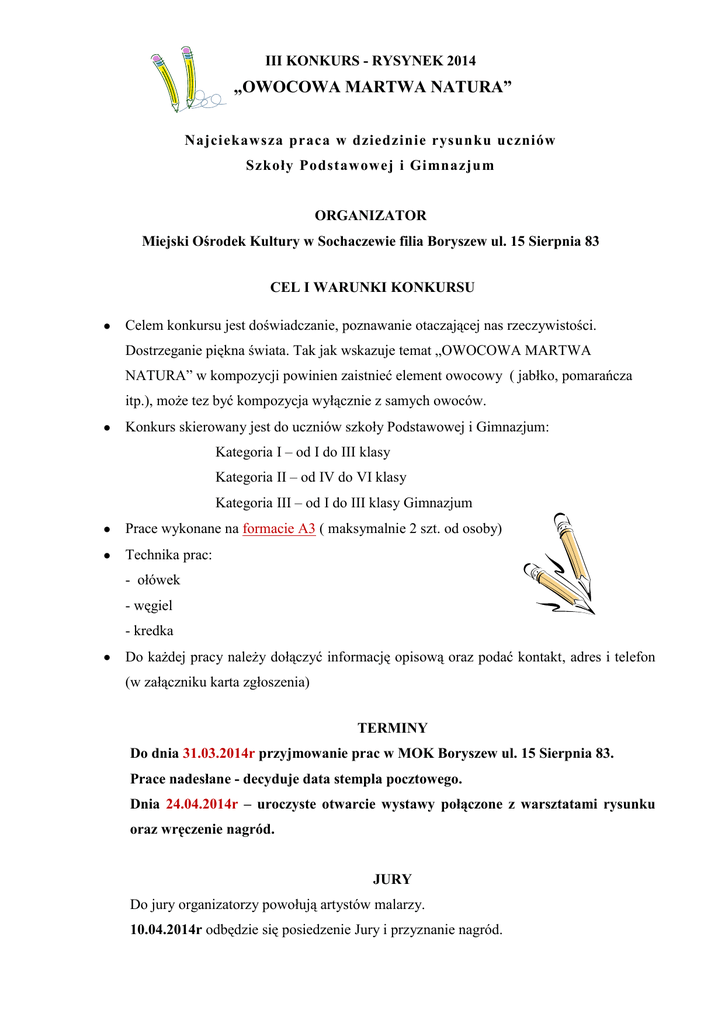 III KONKURS - RYSYNEK 2014 „OWOCOWA MARTWA NATURA” Najciekawsza praca w dziedzinie rysunku uczniów Szkoły Podstawowej i Gimnazjum ORGANIZATOR Miejski Ośrodek Kultury w Sochaczewie filia Boryszew ul. 15 Sierpnia 83 CEL I WARUNKI KONKURSU Celem konkursu jest doświadczanie, poznawanie otaczającej nas rzeczywistości. Dostrzeganie piękna świata. Tak jak wskazuje temat „OWOCOWA MARTWA NATURA” w kompozycji powinien zaistnieć element owocowy ( jabłko, pomarańcza itp.), może tez być kompozycja wyłącznie z samych owoców. Konkurs skierowany jest do uczniów szkoły Podstawowej i Gimnazjum: Kategoria I – od I do III klasy Kategoria II – od IV do VI klasy Kategoria III – od I do III klasy Gimnazjum Prace wykonane na formacie A3 ( maksymalnie 2 szt. od osoby) Technika prac: - ołówek - węgiel - kredka Do każdej pracy należy dołączyć informację opisową oraz podać kontakt, adres i telefon (w załączniku karta zgłoszenia) TERMINY Do dnia 31.03.2014r przyjmowanie prac w MOK Boryszew ul. 15 Sierpnia 83. Prace nadesłane - decyduje data stempla pocztowego. Dnia 24.04.2014r – uroczyste otwarcie wystawy połączone z warsztatami rysunku oraz wręczenie nagród. JURY Do jury organizatorzy powołują artystów malarzy. 10.04.2014r odbędzie się posiedzenie Jury i przyznanie nagród. NAGRODY Nagrody rzeczowe i dyplomy przyznane będą w trzech kategoriach wiekowych - I, II, III miejsce. POSTANOWIENIA DODATKOWE Udział w konkursie jest bezpłatny Organizator konkursu nie ponosi odpowiedzialności za ewentualne zmiany lub odwołanie konkursu z przyczyn od niego niezależnych Nadesłane na konkurs prace nie powinny brać udziału w innych wcześniejszych konkursach Do pracy należy dołączyć kartę zgłoszenia Prace nadesłane na konkurs nie będą zwracane Prace nie spełniające warunków konkursu nie będą rozpatrywane Wzięcie udziału w konkursie oznacza zgodę na zastosowanie się do wszystkich postanowień niniejszego regulaminu konkursu Z A PR A S Z A M Y Miejski Ośrodek Kultury w Sochaczewie Filia Boryszew ul. 15 Sierpnia 83 96-500 Sochaczew Tel.: 46 863 07 68 lub 668 850 337 adres email: [email protected] lub [email protected] Koordynator konkursu Ewa Kubeł- Zielińska – artysta malarz, instruktor Pracowni Rysunku MOK KARTA ZGŁOSZENIA do konkursu RYSUNEK 2014 „OWOCOWA MARTWA NATURA” Imię i nazwisko uczestnika Konkursu ……………………………………………………………………. Klasa ……………………………………………………………………………………………………………. Oświadczenie Po zapoznaniu się z regulaminem konkursu rysunkowego „Owocowa Martwa Natura” wyrażam zgodę na wykorzystanie pracy konkursowej mojego dziecka/ ucznia. ……………………………………………………….. Imię i nazwisko dziecka/ucznia (drukowanymi literami) …………………………………………….. Data i podpis czytelny rodzica lub opiekuna Dane adresowe …………………………………………………………………………….. Szkoła lub inny adres do korespondencji ………………………………………………….. Ulica, miejscowość ………………………………………………………………………… Kod pocztowy …………………………………………………………………………….. Imię i nazwisko koordynatora konkursu w szkole ………………………………………… Telefon kontaktowy ……………………………………………………………………….. E-mail: …………………………………………………………………………………….. ……………………………………………….. Podpis i pieczątka dyrektora