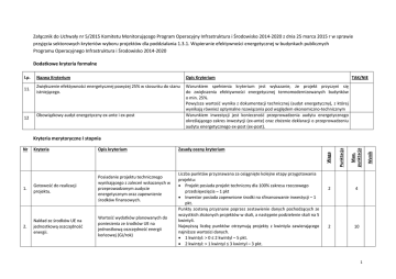 Załącznik do Uchwały nr 5/2015 Komitetu Monitorującego Program Operacyjny Infrastruktura i Środowisko 2014‐2020 z dnia 25 marca 2015 r w sprawie przyjęcia sektorowych kryteriów wyboru projektów dla poddziałania 1.3.1. Wspieranie efektywności energetycznej w budynkach publicznych Programu Operacyjnego Infrastruktura i Środowisko 2014‐2020 Dodatkowe kryteria formalne l.p. 11. 12 Nazwa Kryterium Opis Kryterium TAK/NIE Zwiększenie efektywności energetycznej powyżej 25% w stosunku do stanu Warunkiem spełnienia kryterium jest wykazanie, że projekt przyczyni się istniejącego. do zwiększenia efektywności energetycznej termomodernizowanych budynków o min. 25%. Powyższa wartość wynika z dokumentacji technicznej (audyt energetyczny), z której wynikają również optymalne rozwiązania pod względem ekonomiczno‐technicznym Obowiązkowy audyt energetyczny ex‐ante i ex‐post Warunkiem inwestycji jest konieczność przeprowadzenia audytu energetycznego określającego zakres inwestycji (ex‐ante) oraz złożenie deklaracji o przeprowadzeniu audytu energetycznego ex‐post (ex‐post). Gotowość do realizacji projektu. 2. Nakład ze środków UE na jednostkową oszczędność energii. Wartość wydatków planowanych do poniesienia ze środków UE na jednostkową oszczędność energii końcowej (GJ/rok) Liczba punktów przyznawana za osiągnięte kolejne etapy przygotowania projektu: Projekt posiada projekt techniczny dla 100% zakresu rzeczowego przedsięwzięcia – 1 pkt Inwestor posiada zapewnione środki na sfinansowanie inwestycji – 1 pkt. Punkty zostaną przyznane poprzez zestawienie danych pochodzących ze wszystkich złożonych projektów w skali, a następnie podzielenie skali na 5 kwintyli. Najwyższą liczbę punktów otrzymują projekty z kwintyla zawierającego najniższe wartości danych. 1 kwintyl: > 0 ≤ 2 kwintyl – 5 pkt. 2 kwintyl: > 1 kwintyl ≤ 3 kwintyl – 3 pkt. Wynik 1. Posiadanie projektu technicznego wynikającego z zaleceń wskazanych w przeprowadzonym audycie energetycznym oraz zapewnienie środków finansowych. Zasady oceny kryterium Max. punktacja Opis kryterium Punktacja Nr Kryteria Waga Kryteria merytoryczne I stopnia 2 4 2 10 1 3 kwintyl: > 2 kwintyl ≤ 4 kwintyl – 2 pkt. 4 kwintyl: > 3 kwintyl ≤ 5 kwintyl – 1 pkt. 5 kwintyl: > 4 kwintyl – 0 pkt. 3. Nakład ze środków UE na jednostkową redukcję emisji CO2 Wartość wydatków planowanych do poniesienia ze środków UE na redukcję 1 tony CO2. Punkty zostaną przyznane poprzez zestawienie danych pochodzących ze wszystkich złożonych projektów w skali, a następnie podzielenie skali na 5 kwintyli w danym PI. Najwyższą liczbę punktów otrzymują projekty z kwintyla zawierającego najniższe wartości danych. 1 kwintyl: > 0 ≤ 2 kwintyl – 5 pkt. 2 kwintyl: > 1 kwintyl ≤ 3 kwintyl – 3 pkt. 3 kwintyl: > 2 kwintyl ≤ 4 kwintyl – 2 pkt. 4 kwintyl: > 3 kwintyl ≤ 5 kwintyl – 1 pkt. 5 kwintyl: > 4 kwintyl – 0 pkt. 4. Zwiększenie efektywności energetycznej powyżej 60% Wartość wynikająca z dokumentacji technicznej (audyt energetyczny). Punkty zostaną przyznane za zwiększenie efektywności energetycznej powyżej 60% : Powyżej 60% ‐ 5 pkt. 1 5 5. Koordynacja projektu z planami rozwoju sieci ciepłowniczej dla danego obszaru Deklaracja beneficjenta o zgodności projektu z planem rozwoju sieci ciepłowniczej dla danego obszaru Punkt zostanie przyznany za deklarację o zgodności projektu z planami rozwoju sieci ciepłowniczej dla danego obszaru – 1 pkt. 1 1 6. Gotowość do współfinansowania ze środków beneficjenta Dodatkowe punkty dla projektów, które w jak największym stopniu dofinansowywane są przez beneficjenta Współfinansowanie przez beneficjenta: Powyżej 50% ‐ 6 pkt. 50%‐30% ‐ 2 pkt. 30%‐15% ‐ 1 pkt. Poniżej 15% ‐ 0 punktów 1 6 Suma 36 2 10 2