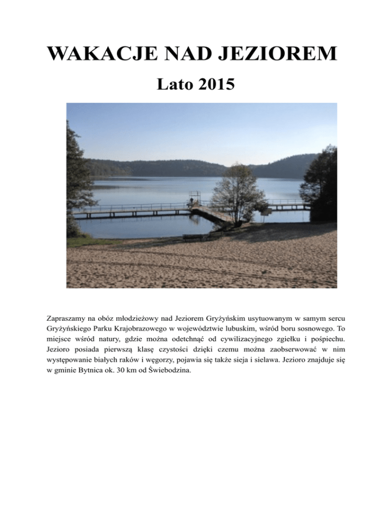 WAKACJE NAD JEZIOREM Lato 2015 Zapraszamy na obóz młodzieżowy nad Jeziorem Gryżyńskim usytuowanym w samym sercu Gryżyńskiego Parku Krajobrazowego w województwie lubuskim, wśród boru sosnowego. To miejsce wśród natury, gdzie można odetchnąć od cywilizacyjnego zgiełku i pośpiechu. Jezioro posiada pierwszą klasę czystości dzięki czemu można zaobserwować w nim występowanie białych raków i węgorzy, pojawia się także sieja i sielawa. Jezioro znajduje się w gminie Bytnica ok. 30 km od Świebodzina. RAMOWY PROGRAM DZIEŃ 1 (niedziela) Zbiórka uczestników wyjazdu na dworcu centralnym w Warszawie. Przejazd pociągiem InterCity relacji Warszawa – Berlin do Świebodzina. Transfer do ośrodka nad jeziorem. Zakwaterowanie. Kolacja. Wieczorna modlitwa połączona zawsze z tematem. DZIEŃ 2 (poniedziałek) Śniadanie. Modlitwa poranna. Czas nad jeziorem – pływanie, rowerki wodne. (Ośrodek posiada plażę strzeżoną przez ratowników). Dla chętnych siatkówka, koszykówka, badminton. Obiad. Spacer po lesie, czas nad jeziorem. Kolacja. Modlitwa wieczorna. ) DZIEŃ 3 (wtorek) Śniadanie. Krótka modlitwa poranna. Przejazd autokarem do Berlina. Zwiedzanie centrum miasta – Katedra Berlińska, Wyspa Muzeów, Checkpoint Charlie, Mur Berliński, Brama Brandenburska, Bundestag. W miarę możliwości wstęp do Muzeum Techniki. Czas wolny na obiad. Wieczorny powrót do ośrodka. Kolacja. DZIEŃ 4 (środa) Śniadanie. Modlitwa poranna. Wycieczka rowerowa po okolicznym terenie – zwiedzanie zespołu pałacowo – parkowego w Gryżynie. Obiad. Czas nad jeziorem. Kolacja. Modlitwa wieczorna. DZIEŃ 5 (czwartek) Śniadanie. Modlitwa poranna. Wyjazd do Międzyrzecza. Zwiedzanie z przewodnikiem Międzyrzeckiego Rejonu Umocnień, który jest to potężnym systemem poniemieckich fortyfikacji, powstały w latach 30 XX w. na pograniczu niemiecko – polskim. Położony w łuku Odry i Warty rozciąga się na odcinku ok. 100 km. Najważniejszym elementem fortyfikacji jest system podziemnych tuneli wybudowanych w okolicach Międzyrzecza, o łącznej długości przekraczającej 30 km. Podziemia stanowią element Muzeum Fortyfikacji i Nietoperzy w Pniewie, przy którym zorganizowana jest całoroczna trasa turystyczna. Powrót do ośrodka. Obiadokolacja w formie grilla. Modlitwa wieczorna. DZIEŃ 6 (piątek) Śniadanie. Modlitwa poranna. Spływ kajakowy. Obiad. Czas nad jeziorem. Kolacja. Modlitwa wieczorna. Możliwość wyjścia do planetarium. DZIEŃ 7 (sobota) Śniadanie. Modlitwa poranna. Transfer na dworzec kolejowy w Świebodzinie. Powrót pociągiem InterCity relacji Berlin – Warszawa do Warszawy. Zakończenie obozu. Kolejność punktów programu może ulec zmianie. W razie niepogody gry i zabawy w ośrodku. ZAKWATEROWANIE Ośrodek Anapausis. Zakwaterowanie w domkach 4 - osobowych. Rozkład Domków: dwa pokoje sypialne po dwa łóżka- łącznie cztery miejsca. Wyposażone w lampki nocne, szafki nocne, regał na ubrania, pościel. Pokój dzienny: stół, cztery krzesła, piecyk kominkowy i aneks kuchenny (stół kuchenny, lodówka, kuchenka do gotowania, czajnik, talerze, sztućce, garnki, patelnia, deska do krojenia, nóż, durszlak, szklanki), grzejnik elektryczny konwektorowy, szczotka, szufelka, mop. Łazienka: prysznic z deszczownicą, toaleta, umywalka, lusterko, grzejnik drabinkowy, bojler. ) CENA: ok. 780 PLN + 25 EUR (na bilety komunikacji miejskiej i obiad w Berlinie) Cena zawiera: - przejazdy - zakwaterowanie - wyżywienie - koszt wstępu do Międzyrzeckiego Rejonu Umocnień - ubezpieczenie - wypożyczenie kajaków, rowerów wodnych, rowerów