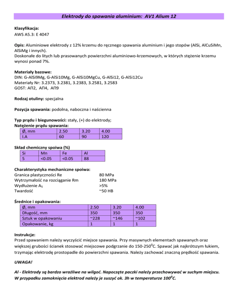 Elektrody do spawania aluminium: AV1 Alium 12 Klasyfikacja: AWS A5.3: E 4047 Opis: Aluminiowe elektrody z 12% krzemu do ręcznego spawania aluminium i jego stopów (AlSi, AlCuSiMn, AlSiMg i innych). Doskonałe do litych lub prasowanych powierzchni aluminiowo-krzemowych, w których stężenie krzemu wynosi ponad 7%. Materiały bazowe: DIN: G-AlSi9Mg, G-AlSi10Mg, G-AlSi10MgCu, G-AlSi12, G-AlSi12Cu Materiały Nr: 3.2373, 3.2381, 3.2383, 3.2581, 3.2583 GOST: AП2, AП4, AП9 Rodzaj otuliny: specjalna Pozycja spawania: podolna, naboczna i naścienna Typ prądu i biegunowości: stały, (+) do elektrody; Natężenie prądu spawania: Ø, mm 2.50 3.20 4.00 I.A 60 90 120 Skład chemiczny spoiwa (%) Si Mn Fe 5 <0.05 <0.05 Al 88 Charakterystyka mechaniczne spoiwa: Granica plastyczności Re Wytrzymałość na rozciąganie Rm Wydłużenie A5 Twardość Średnice i opakowania: Ø, mm Długość, mm Sztuk w opakowaniu Opakowanie, kg 80 MPa 180 MPa >5% ~50 HB 2.50 350 ~228 1 3.20 350 ~146 1 4.00 350 ~102 1 Instrukcje: Przed spawaniem należy wyczyścić miejsce spawania. Przy masywnych elementach spawanych oraz większej grubości ścianek stosować miejscowe podgrzanie do 150-2500C. Spawać jak najkrótszym łukiem, trzymając elektrodę prostopadle do powierzchni spawania. Należy zachować znaczną prędkość spawania. UWAGA! Al - Elektrody są bardzo wrażliwe na wilgoć. Napoczęte paczki należy przechowywać w suchym miejscu. W przypadku zamoknięcia elektrod należy je suszyć ok. 3h w temperaturze 1000C.