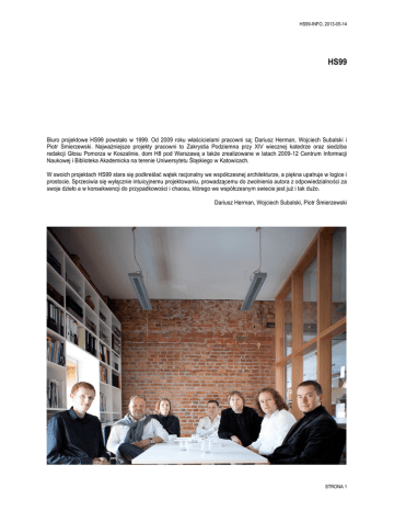 HS99-INFO, 2013-05-14 HS99 Biuro projektowe HS99 powstało w 1999. Od 2009 roku właścicielami pracowni są: Dariusz Herman, Wojciech Subalski i Piotr Smierzewski. Najważniejsze projekty pracowni to Zakrystia Podziemna przy XIV wiecznej katedrze oraz siedziba redakcji Głosu Pomorza w Koszalinie, dom H8 pod Warszawą a także zrealizowane w latach 2009-12 Centrum Informacji Naukowej i Biblioteka Akademicka na terenie Uniwersytetu Śląskiego w Katowicach. W swoich projektach HS99 stara się podkreślać wątek racjonalny we współczesnej architekturze, a piękna upatruje w logice i prostocie. Sprzeciwia się wyłącznie intuicyjnemu projektowaniu, prowadzącemu do zwolnienia autora z odpowiedzialności za swoje dzieło a w konsekwencji do przypadkowości i chaosu, którego we współczesnym swiecie jest już i tak dużo. Dariusz Herman, Wojciech Subalski, Piotr Śmierzewski STRONA 1 HS99-INFO, 2013-05-14 partnerzy Dariusz Herman, (31.08.1963, Koszalin) 1983-1988 Politechnika Gdańska, Wydział Architektury 1988-1990 Miastoprojekt, Koszalin 1990-1993 Arkonbet, Koszalin 1993-1999 Własne biuro projektowe w Koszalinie 1999- Partner w HS99 Herman i Śmierzewski 2009- Partner w biurze HS99 Wojciech Subalski, (18.02.1978, Koszalin) 1998-2004 Politechnika Gdańska, Wydział Architektury 2002-2008 HS99 Herman i Śmierzewski, Koszalin 2009- Partner w biurze HS99 Piotr Smierzewski, (02.01.1965, Koszalin) 1983-1988 Politechnika Gdańska, Wydział Architektury 1988-1990 Politechnika Gdańska, Asystent 1991-1992 Oklahoma State University, Stillwater/USA, Graduate School, Master of Architecture 1991-1992 Oklahoma State University, Stillwater/USA, Asystent 1992-1994 Manfred Raus, Karlsruhe 1994-1995 Prof. R. Kramm+A. Strigl, Darmstadt 1994-2000 TU Darmstadt, Asystent, Katedra Prof. B. Jakubeit/Prof. D.Eberle 1995-1999 Własne biuro projektowe w Karlsruhe, Niemcy 1999- Partner w HS99 Herman i Śmierzewski 2009- Partner w biurze HS99 2013- TU Koszalin, Wykładowca STRONA 2 HS99-INFO, 2013-05-14 wybrane nagrody 2013 CINiBA shortlisted w Nagrodzie im. Miesa van der Rohe 2013 ArchDaily Building Of The Year 2012 w kategorii Muzea i Biblioteki 2013 Nominacja do Nagrody im. Miesa van der Rohe: CINiBA 2012 Grand Prix Życie w Architekturze za Najlepsza Realizacje 2000- 2012: CINiBA 2012 Główna Nagroda Życia w Architekturze za Najlepszy Budynek Użytecznosci Publicznej 2000-2012:CINiBA 2012 Nominacja do Nagrody Życie w Architekturze w kategorii Budynek Rodzinny: Villa Moderna 2012 Nagroda SARP za Najlepszy Budynek Wzniesiony ze Srodków Publicznych: CINiBA 2012 Nagroda Polskiego Cementu: CINiBA 2012 Laureat Nagrody Architektonicznej Polityki: CINiBA 2012 Pierwsze Miejsce w Plebistycie Architektonicznym Bryła Roku: CINiBA 2011 Grand Prix Architektura Roku Województwa Slaskiego: CINiBA 2010 Nagroda Europe 40 Under 40: Wojciech Subalski 2004 Nagroda Dom & Wnetrze Projekt Roku Trzecie Miejsce: H6 STRONA 3 HS99-INFO, 2013-05-14 wybrane publikacje Scientific Information Centre and Academic Library, Poland, Modern Decoration 2/2013 Polish Architecture, Mark 42, 02-03/2013 Zycie w architekturze, Architektura 2/2013 Rudzielec z Katowic, A&B 12/2102 Biblioteka w Katowicach, Architektura 10/2012 Architektura Zegarka, Polityka 30.05.2012 Vedecke Informacni centrum a univerzitni knihovna v Katovicich, era 21 02/2012 Update: University Libraries, A10 44, 03-04/2012 101 Landmarks of Contemporary Polish Architecture, Agora 2011 Villa Moderna w Koszalinie, Architektura 9/2011 Rynek Staromiejski w Koszalinie, Archivolta 2/2010 Osiedle Słoneczne w Koszalinie, Architektura 01/2010 HS99 - niematerialne, Archivolta 4/2009 Laterizio e legno (H9), CIL 126, 2008 Polen Architektur, Wien 2008 Dom Piotra Smierzewskiego w Koszalinie, Architektura 08/2008 H8 House in the Phaidon Atlas of 21st Century World Architetcure, Phaidon 2008 Clear and formal home in Koszalin-Lubiatowo, A10 05/06 2008 Knihowna Slezske Univerzity v Katovicich, era 21 06/2007 Galeria Jednego Projektu, Muzeum Architektury, Wrocław 2007 Biblioteka US w Katowicach, Architektura 08/2006 Dom pod Warszawa, Architektura 08/2006 Emerging Polish Architecture, World Architecture 05/2005 Emerging Identities-east, DAZ Berlin, 2005 University Library, Katowice, A10, 04/2005 Directions, Nowa Architektura w Japonii i Polsce, 2005 Dom w Nowych Bielicach, Architektura 3/2003 Biblioteka US w Katowicach, Architektura i Biznes, 2/2003 Centrum handlowo-rozrywkowe galeria Emka, Architektura 9/2002 Trzy strefy, Architektura 6/2002 Głos Pomorza, Architektura 10/2001 W Starym Drawsku, Architektura 6/2001 Nastrojowy realizm (podziemna zakrystia przy Katedrze), Architektura 3/2001 Dom z płaskim dachem, Architektura i Biznes, 2/1998 Głos Pomorza, Architektura i Biznes, 1/1998 Radio Koszalin, Architektura i Biznes, 9/1996 Struktura falowa, Architektura i Biznes, 5/1996 Volksbank Wiesloch, Wettbewerbe Aktuell 3/1996 Towards the Other Bank, Europan 3, Belgia 1994 STRONA 4 HS99-INFO, 2013-05-14 wybrane realizacje 2010-2013 Ustronie Morskie, Boulevard 2008-2013 Koszalin, H13 2007-2010 Koszalin, Villa Moderna 2005-2006 Koszalin, H9 2004-2008 Koszalin, Pronykowa 2004-2006 Warszawa, H8 2002-2012 Katowice, CINiBA 2000-2006 Koszalin, Budynek Zarządu Cmentarza Komunalnego 2000-2002 Koszalin, Centrum Handlowe „Galeria Emka” 1999-2000 Stare Drawsko, Ośrodek wczasowy MK Cafe 1998-2001 Koszalin, Zakrystia podziemna przy katedrze 1997-2001 Koszalin, Siedziba Redakcji Głosu Pomorza STRONA 5 HS99-INFO, 2013-05-14 wybrane projekty konkursowe 2013 Wałbrzych, Centrum Kulturalne – 1 nagroda 2012 Sopot, Mieszkania Komunalne 2011 Gdańsk, Gazownia – 2 nagroda 2011 Opole, Centrum Nauki Newton – 3 nagroda 2010 Koszalin, Kaplica Cmentarna – 3 nagroda 2009 Koszalin, Rynek Staromiejski – wyróżnienie 2009 Bydgoszcz, Ratusz i Rynek Staromiejski – wyróżnienie 2009 Szczecin, Centrum Dialogu 2009 Warszawa, Muzeum Historii Polski 2008 Gdansk, Wydzial Neofilologii UG 2007 Gdańsk, Wydział Infor