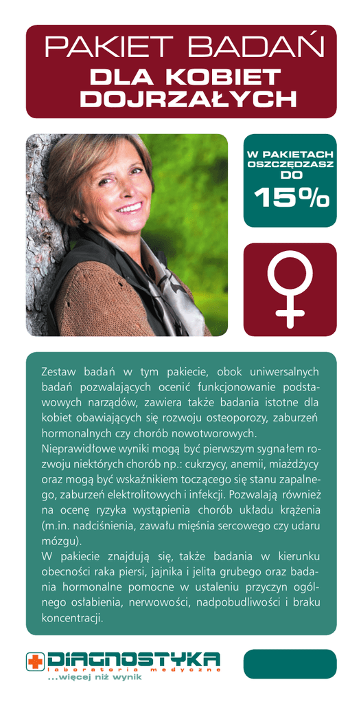 PAKIET BADAŃ DLA KOBIET DOJRZAŁYCH W PAKIETACH OSZCZĘDZASZ DO 15% Zestaw badań w tym pakiecie, obok uniwersalnych badań pozwalających ocenić funkcjonowanie podstawowych narządów, zawiera także badania istotne dla kobiet obawiających się rozwoju osteoporozy, zaburzeń hormonalnych czy chorób nowotworowych. Nieprawidłowe wyniki mogą być pierwszym sygnałem rozwoju niektórych chorób np.: cukrzycy, anemii, miażdżycy oraz mogą być wskaźnikiem toczącego się stanu zapalnego, zaburzeń elektrolitowych i infekcji. Pozwalają również na ocenę ryzyka wystąpienia chorób układu krążenia (m.in. nadciśnienia, zawału mięśnia sercowego czy udaru mózgu). W pakiecie znajdują się, także badania w kierunku obecności raka piersi, jajnika i jelita grubego oraz badania hormonalne pomocne w ustaleniu przyczyn ogólnego osłabienia, nerwowości, nadpobudliwości i braku koncentracji. PAKIET BADAŃ DLA KOBIET DOJRZAŁYCH OBEJMUJE: Mocz-badanie ogólne – jest podstawowym badaniem odzwierciedlającym funkcje układu moczowego służącym do wykrywania m.in. chorób nerek i zakażeń układu moczowo-płciowego. OB– jest badaniem oceniającym ogólny stan zdrowia i umożliwiającym wykrycie stanów zapalnych zwi ązanych z różnymi chorobami. Morfologia krwi – całościowa analiza wszystkich rodzajów komórek krwi (czerwonych, bia łych i płytek). Badanie s łużące do oceny ogólnego stanu zdrowia i stanowi ące podstawę rozpoznania wielu chorób m.in. anemii, zaburzeń krzepnięcia krwi, niedoborów odporności czy infekcji. Większość chorób powoduje widoczne zmiany w morfologii krwi. Glukoza – podstawowe badanie w rozpoznawaniu cukrzycy. Elektrolity (Na, K) – rozpoznawanie zaburzeń równowagi wodno-elektrolitowej wyst ępujących m.in. w chorobach nerek lub w odwodnieniu organizmu. Nieprawid łowy poziom elektrolitów może powodować zaburzenia rytmu serca. Lipidogram – szczegółowe badanie w kierunku ryzyka rozwoju miażdżycy – przyczyny chorób uk ładu krążenia. W skład badania wchodzi oznaczenie poziomu cholesterolu ca łkowitego, HDL („dobrego” cholesterolu), LDL („z łego” cholesterolu) i triglicerydów. Próby wątrobowe (ALT, AST, ALP, GTP, BIL) – zestaw badań całościowo odzwierciedlających funkcje wątroby i dróg żółciowych. Mocznik i kreatynina – podwyższone wyniki wskazuj ą na niewydolność nerek, zaburzenia metaboliczne lub odwodnienie organizmu. Kwas moczowy – badanie związane z zaburzeniami metabolicznymi, chorobami nerek oraz dolegliwo ściami stawowymi. Ferrytyna – badanie najlepiej oceniaj ące zasoby żelaza w ustroju. Obniżony wynik wyst ępuje w niedoborach żelaza, a podwyższony w stanach zapalnych. Wapń całkowity, fosfor nieorganiczny – podstawowe badania służące do oceny stanu gospodarki mineralnej bezpośrednio związanej ze stanem kości. Wstępne badanie w kierunku osteoporozy. Magnez – badanie wykonywane w przypadku objawów, takich jak osłabienie, drażliwość, zaburzenia rytmu serca, nudności. hsCRP – bardzo czuły wskaźnik toczącego się stanu zapalnego oraz marker podwyższonego ryzyka wyst ąpienia choroby wie ńcowej. Kał na obecność krwi utajonej – badanie pozwalające na wykrycie utajonego krwawienia z przewodu pokarmowego, nasuwaj ącego podejrzenie m.in. raka jelita grubego. TSH – badanie odzwierciedlające funkcjonowanie tarczycy. Nieprawidłowy, wysoki poziom hormonu mo że sugerować niedoczynność tarczycy, a nieprawid łowo niski – jej nadczynność. Choroby tarczycy mają negatywny wpływ na większość funkcji życiowych i objawiaj ą się m.in. nerwowością, zmęczeniem, kołataniem serca czy nagłym tyciem lub chudnięciem. FSH – badanie hormonalne przydatne w diagnostyce zaburze ń miesiączkowania (nieregularnych cykli). Prolaktyna – hormonalna diagnostyka zaburzeń miesiączkowania i problemów z płodnością. Osteokalcyna – badanie przydatne w ocenie metabolizmu kostnego, istotne w diagnostyce osteoporozy. CA 125*– marker nowotworowy związany m.in. z rakiem jajnika. CA 15-3*– marker nowotworowy związany m.in. z rakiem piersi. * wzrost tego markera obserwuje si ę także w przebiegu wielu chorób nienowotworowych i na podstawie podwy ższonego wyniku nie można wnioskować o obecności raka. Po konsultacji z lekarzem wynik nale ży interpretowa ć w kontekście innych badań i objawów klinicznych. Pełnej informacji o ofercie oraz adresów Punktów Pobrań szukaj na www.diag.pl i www.pakiety.diag.pl