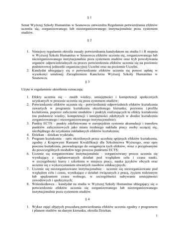 §1 Senat Wyższej Szkoły Humanitas w Sosnowcu zatwierdza Regulamin potwierdzania efektów uczenia się, zorganizowanego lub niezorganizowanego instytucjonalnie poza systemem studiów. §2 1. Niniejszy regulamin określa zasady potwierdzania kandydatom na studia I i II stopnia w Wyższej Szkole Humanitas w Sosnowcu efektów uczenia się, zorganizowanego lub niezorganizowanego instytucjonalnie poza systemem studiów oraz tryb powoływania organów odpowiedzialnych za proces potwierdzenia efektów uczenia się na poziomie podstawowej jednostki organizacyjnej Uczelni oraz na poziomie Uczelni. 2. Kandydat ubiegający się o potwierdzanie efektów uczenia się ponosi opłatę w wysokości ustalonej Zarządzeniem Kanclerza Wyższej Szkoły Humanitas w Sosnowcu. §3 Użyte w regulaminie określenia oznaczają: 1. Efekty uczenia się – zasób wiedzy, umiejętności i kompetencji społecznych uzyskanych w procesie uczenia się poza systemem studiów; 2. Potwierdzenie efektów uczenia się - potwierdzenie odpowiednich efektów kształcenia zawartych w programie kształcenia określonego kierunku, poziomu i profilu kształcenia, poprzez zaliczenie modułów i praktyk realizujących te efekty kształcenia (na podstawie wiedzy, kompetencji i umiejętności zdobytych w drodze kształcenia zorganizowanego i niezorganizowanego instytucjonalnie); 3. Punkty ECTS – punkty zdefiniowane w europejskim systemie akumulacji i transferu punktów zaliczeniowych jako miara średniego nakładu pracy osoby uczącej się, niezbędnego do uzyskania zakładanych efektów kształcenia; 4. Dziekan – dziekan wydziału; 5. Program kształcenia – opis określonych przez uczelnię spójnych efektów kształcenia, zgodny z Krajowymi Ramami Kwalifikacji dla Szkolnictwa Wyższego, oraz opis procesu kształcenia, prowadzącego do osiągnięcia tych efektów, wraz z przypisanymi do poszczególnych modułów tego procesu punktami ECTS; 6. Uczenie się zorganizowane instytucjonalnie – zorganizowany proces uczenia się wynikający z zaplanowanych działań pod względem celu i czasu nauki, w szczególności kursy i szkolenia w miejscu pracy, nauka języków obcych oraz uczenie się z wykorzystaniem otwartych zasobów edukacyjnych; 7. Uczenie się niezorganizowane instytucjonalnie – uczenie się niezorganizowane pod względem celu i czasu, wynikające z działań związanych z pracą, życiem rodzinnym lub spędzaniem czasu wolnego, w szczególności nabywanie umiejętności zawodowych i społecznych; 8. Wnioskodawca – kandydat na studia w Wyższej Szkoły Humanitas ubiegający się o potwierdzenie efektów uczenia się zorganizowanego lub niezorganizowanego instytucjonalnie poza systemem studiów. §4 1. Wykaz zajęć objętych procedurą potwierdzania efektów uczenia zgodny z programem i planem studiów na danym kierunku, określa Dziekan. 1 2. Efekty uczenia się mogą zostać potwierdzone: 1) osobie posiadającej świadectwo dojrzałości i co najmniej pięć lat doświadczenia zawodowego – w przypadku ubiegania się o potwierdzenie efektów kształcenia na poziomie studiów I stopnia lub jednolite studia magisterskie. 2) osobie posiadającej tytuł zawodowy licencjata lub równorzędny i co najmniej trzy lata doświadczenia zawodowego po ukończeniu studiów pierwszego stopnia w przypadku ubiegania się o potwierdzenie efektów kształcenia na poziomie studiów II stopnia 3) osobie posiadającej tytuł zawodowy magistra lub równorzędny i co najmniej dwa lata doświadczenia zawodowego po ukończeniu studiów drugiego stopnia albo jednolitych studiów magisterskich – w przypadku ubiegania się o przyjęcie na kolejny kierunek studiów pierwszego lub drugiego stopnia lub jednolite studia magisterskie. 3. W wyniku potwierdzenia efektów uczenia się można zaliczyć wnioskodawcy nie więcej niż 50% punktów ECTS przypisanych do danego programu kształcenia określonego kierunku, poziomu i profilu kształcenia. §5 1. Decyzje w sprawie potwierdzenia efektów uczenia się podejmuje Dziekan po zasięgnięciu opinii Komisji ds. Potwierdzania Efektów Uczenia się. 2. Komisję ds. Potwierdzania Efektów Uczenia się powołuje Dziekan. 3. Przewodniczącym Komisji ds. Potwierdzania Efektów Uczenia się jest samodzielny pracownik nauki zatrudniony na Wydziale. 4. Komisja ds. Potwierdzania Efektów Kształcenia, przed sformułowaniem opinii, o której mowa w pkt. 1, może konsultować się z nauczycielami akademickimi prowadzącymi zajęcia, o zaliczenie których, ubiega się wnioskodawca, przedstawicielami Instytutowych Zespołów ds. Jakości Kształcenia oraz przedstawicielami Uczelnianego Zespołu ds. Jakości Kształcenia. 5. Do zadań Komisji ds. Potwierdzania Efektów Uczenia się należy w szczególności przedstawianie Dziekanowi opinii w sprawach z zakresu potwierdzania efektów uczenia się. 6. Organem odwoławczym od decyzji Dziekana jest Uczelniana Komisja Odwoławcza ds. Potwierdzania Efektów Uczenia się, której przewodniczy Rektor. Członków Uczelnianej Komisji Odwoławczej ds. Potwierdzania Efektów Uczenia się powołuje Rektor spośród nauczycieli akademickich uczelni. §6 1. Wnioskodawca składa wniosek o potwierdzenie efektów uczenia się zgodnie z formularzem stanowiącym załącznik nr 1 do niniejszego regulaminu. 2. Do wniosku wnioskodawca załącza dokumenty pozwalające ocenić wiedzę, umiejętności i kompetencje społeczne wnioskodawcy nabyte w systemach uczenia się zorganizowanego lub niezorganizowanego instytucjonalnie. 3. Wniosek o potwierdzenie efektów uczenia się wraz z wymaganymi załącznikami składane są przez wnioskodawcę w Dziekanacie odpowiedniego Wydziału. 4. W przypadku uznania przez Dziekana wniosku o potwierdzenie efektów uczenia się za niekompletny, wnioskodawca zobowiązany jest niezwłocznie do uzupełnienia wniosku pod rygorem pozostawienia wniosku bez rozpoznania. 5. Po analizie złożonych dokumentów, przewodniczący właściwej Komisji ds. Potwierdzania 