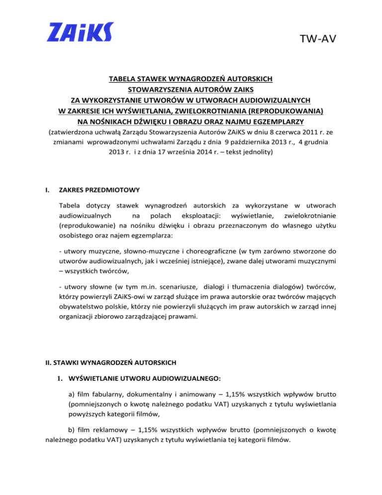 TW-AV TABELA STAWEK WYNAGRODZEŃ AUTORSKICH STOWARZYSZENIA AUTORÓW ZAIKS ZA WYKORZYSTANIE UTWORÓW W UTWORACH AUDIOWIZUALNYCH W ZAKRESIE ICH WYŚWIETLANIA, ZWIELOKROTNIANIA (REPRODUKOWANIA) NA NOŚNIKACH DŹWIĘKU I OBRAZU ORAZ NAJMU EGZEMPLARZY (zatwierdzona uchwałą Zarządu Stowarzyszenia Autorów ZAiKS w dniu 8 czerwca 2011 r. ze zmianami wprowadzonymi uchwałami Zarządu z dnia 9 października 2013 r., 4 grudnia 2013 r. i z dnia 17 września 2014 r. – tekst jednolity) I. ZAKRES PRZEDMIOTOWY Tabela dotyczy stawek wynagrodzeń autorskich za wykorzystane w utworach audiowizualnych na polach eksploatacji: wyświetlanie, zwielokrotnianie (reprodukowanie) na nośniku dźwięku i obrazu przeznaczonym do własnego użytku osobistego oraz najem egzemplarza: - utwory muzyczne, słowno-muzyczne i choreograficzne (w tym zarówno stworzone do utworów audiowizualnych, jak i wcześniej istniejące), zwane dalej utworami muzycznymi – wszystkich twórców, - utwory słowne (w tym m.in. scenariusze, dialogi i tłumaczenia dialogów) twórców, którzy powierzyli ZAiKS-owi w zarząd służące im prawa autorskie oraz twórców mających obywatelstwo polskie, którzy nie powierzyli służących im praw autorskich w zarząd innej organizacji zbiorowo zarządzającej prawami. II. STAWKI WYNAGRODZEŃ AUTORSKICH 1. WYŚWIETLANIE UTWORU AUDIOWIZUALNEGO: a) film fabularny, dokumentalny i animowany – 1,15% wszystkich wpływów brutto (pomniejszonych o kwotę należnego podatku VAT) uzyskanych z tytułu wyświetlania powyższych kategorii filmów, b) film reklamowy – 1,15% wszystkich wpływów brutto (pomniejszonych o kwotę należnego podatku VAT) uzyskanych z tytułu wyświetlania tej kategorii filmów. 2. ZWIELOKROTNIANIE (REPRODUKOWANIE) UTWORÓW NA NOŚNIKACH DŹWIĘKU I OBRAZU, PRZEZNACZONYCH DO WŁASNEGO UŻYTKU OSOBISTEGO 2.1.Stawki wynagrodzeń autorskich są ustalane jako procent od ceny brutto sprzedaży jednego egzemplarza nośnika (pomniejszonej o kwotę należnego podatku VAT) lub kwotowo za jeden egzemplarz nośnika, z zastrzeżeniem pkt.2.2.-2.5.: a) utwory słowne – 2,44%, b) utwory muzyczne – 1,4%, c) wynagrodzenia autorskie obliczone według stawek określonych pod lit. a) i b) nie mogą być niższe – z zastrzeżeniem postanowień pod lit.d) – f) – niż podane niżej stawki ustalone kwotowo (w PLN) za jeden egzemplarz nośnika z jednym utworem audiowizualnym: BLUE RAY DVD VCD/VHS utwory słowne 0,51 0,34 0,20 utwory muzyczne 0,30 0,20 0,12 utwory słowne 0,41 0,27 0,16 utwory muzyczne 0,24 0,16 0,10 utwory słowne 0,38 0,25 0,15 utwory muzyczne 0,22 0,15 0,09 utwory słowne 0,26 0,17 0,10 utwory muzyczne 0,15 0,10 0,06 film fabularny serial fabularny film dokumentalny/serial dokumentalny Strona 2 film animowany /serial animowany d) w przypadku zwielokrotnienia na jednym nośniku więcej niż jednego odcinka serialu fabularnego stawka minimalna określona pod lit.c) odnosi się do pierwszych 140 minut czasu trwania wszystkich odcinków na danym nośniku, a za każde dalsze rozpoczęte 35 minut jest powiększana o ¼ stawki minimalnej, e)w przypadku zwielokrotnienia na jednym nośniku więcej niż jednego filmu animowanego lub więcej niż jednego odcinka serialu animowanego stawka minimalna określona pod lit.c) odnosi się do pierwszych 60 minut trwania wszystkich filmów lub odcinków serialu na danym nośniku, a za każde dalsze rozpoczęte 15 minut jest powiększana o ¼ stawki minimalnej, f)w przypadku zwielokrotnienia na jednym nośniku więcej niż jednego odcinka serialu dokumentalnego stawka minimalna określona pod lit.c) odnosi się do pierwszych 60 minut trwania wszystkich odcinków na danym nośniku, a za każde dalsze rozpoczęte 30 minut jest powiększana o ½ stawki minimalnej. 2.2. W odniesieniu do nośników sprzedawanych łącznie z dziennikami i czasopismami stosowane są stawki procentowe w wysokości określonej w pkt.2.1. lit.a) i b), ale liczone od 70% różnicy pomiędzy ceną dziennika i/lub czasopisma bez nośnika i ceną z nośnikiem. Wynagrodzenia autorskie obliczone w powyższy sposób nie mogą być niższe niż podane niżej stawki ustalone kwotowo (w PLN) za jeden egzemplarz nośnika z jednym utworem audiowizualnym: BLUE RAY DVD VCD/VHS utwory słowne 0,23 0,15 0,09 utwory muzyczne 0,13 0,08 0,05 utwory słowne 0,17 0,11 0,07 utwory muzyczne 0,10 0,07 0,04 utwory słowne 0,17 0,11 0,06 utwory muzyczne 0,09 0,06 0,04 film fabularny serial fabularny Strona film animowany /serial animowany 3 film dokumentalny/serial dokumentalny utwory słowne 0,15 0,10 0,06 utwory muzyczne 0,08 0,05 0,03 2.3. Do wynagrodzeń autorskich ustalonych zgodnie z pkt.2.2. mają odpowiednie zastosowanie postanowienia pkt.1 lit.d) – f). 2.4.W odniesieniu do nośników sprzedawanych łącznie z dziennikami lub czasopismami stosuje się następujące opusty: a)przy nakładach powyżej 50.000 egzemplarzy - 5%, b)przy nakładach powyżej 80.000 egzemplarzy – 10%, c)przy nakładach powyżej 120.000 egzemplarzy – 15%. 2.5. w odniesieniu do nośników sprzedawanych łącznie z innymi produktami niż wymienione w pkt.2.2. stosuje się stawki ryczałtowe określone w pkt.2.1. lit.c). 3. NAJEM EGZEMPLARZA UTWORU AUDIOWIZUALNEGO 2% wpływów brutto (pomniejszonych o kwotę należnego podatku VAT) uzyskanych z tytułu najmu egzemplarza nośnika z filmem fabularnym, dokumentalnym lub animowanym. POSTANOWIENIA OGÓLNE 1. W rozumieniu Tabeli: „wyświetlanie” oznacza prezentację utworu audiowizualnego za pośrednictwem projektora filmowego, dostępną publicznie i w miejscach zamkniętych dla publiczności, o ile wykracza poza granice dozwolonego użytku w rozumieniu ustawy o prawie autorskim i prawach pokrewnych. 1a). Na potrzeby niniejszej Tabeli przyjmuje się, że pojęcie utworów audiowizualnych na polu „wyświetlanie” obejmuje filmy fabularne, dokumentalne, animowane i reklamowe, a na polach „zwielokrotnianie (reprodukowanie) na nośnikach dźwięku i obrazu