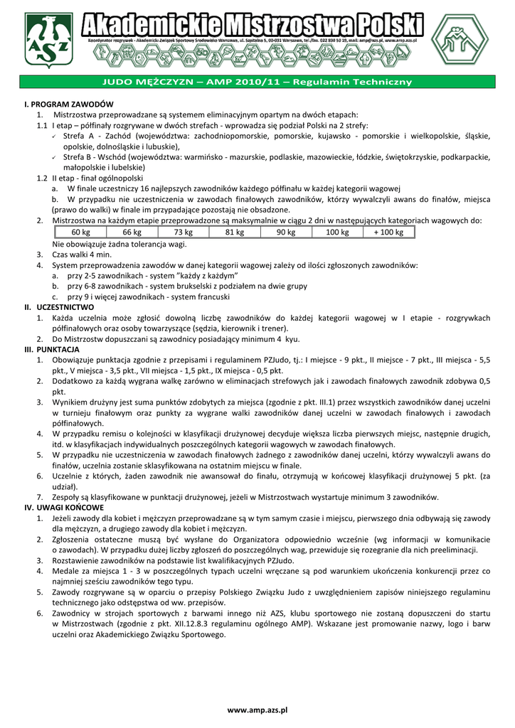 JUDO MĘŻCZYZN – AMP 2010/11 – Regulamin Techniczny I. PROGRAM ZAWODÓW 1. Mistrzostwa przeprowadzane są systemem eliminacyjnym opartym na dwóch etapach: 1.1 I etap – półfinały rozgrywane w dwóch strefach - wprowadza się podział Polski na 2 strefy: Strefa A - Zachód (województwa: zachodniopomorskie, pomorskie, kujawsko - pomorskie i wielkopolskie, śląskie, opolskie, dolnośląskie i lubuskie), Strefa B - Wschód (województwa: warmińsko - mazurskie, podlaskie, mazowieckie, łódzkie, świętokrzyskie, podkarpackie, małopolskie i lubelskie) 1.2 II etap - finał ogólnopolski a. W finale uczestniczy 16 najlepszych zawodników każdego półfinału w każdej kategorii wagowej b. W przypadku nie uczestniczenia w zawodach finałowych zawodników, którzy wywalczyli awans do finałów, miejsca (prawo do walki) w finale im przypadające pozostają nie obsadzone. 2. Mistrzostwa na każdym etapie przeprowadzone są maksymalnie w ciągu 2 dni w następujących kategoriach wagowych do: 60 kg 66 kg 73 kg 81 kg 90 kg 100 kg + 100 kg Nie obowiązuje żadna tolerancja wagi. 3. Czas walki 4 min. 4. System przeprowadzenia zawodów w danej kategorii wagowej zależy od ilości zgłoszonych zawodników: a. przy 2-5 zawodnikach - system ”każdy z każdym” b. przy 6-8 zawodnikach - system brukselski z podziałem na dwie grupy c. przy 9 i więcej zawodnikach - system francuski II. UCZESTNICTWO 1. Każda uczelnia może zgłosić dowolną liczbę zawodników do każdej kategorii wagowej w I etapie - rozgrywkach półfinałowych oraz osoby towarzyszące (sędzia, kierownik i trener). 2. Do Mistrzostw dopuszczani są zawodnicy posiadający minimum 4 kyu. III. PUNKTACJA 1. Obowiązuje punktacja zgodnie z przepisami i regulaminem PZJudo, tj.: I miejsce - 9 pkt., II miejsce - 7 pkt., III miejsca - 5,5 pkt., V miejsca - 3,5 pkt., VII miejsca - 1,5 pkt., IX miejsca - 0,5 pkt. 2. Dodatkowo za każdą wygrana walkę zarówno w eliminacjach strefowych jak i zawodach finałowych zawodnik zdobywa 0,5 pkt. 3. Wynikiem drużyny jest suma punktów zdobytych za miejsca (zgodnie z pkt. III.1) przez wszystkich zawodników danej uczelni w turnieju finałowym oraz punkty za wygrane walki zawodników danej uczelni w zawodach finałowych i zawodach półfinałowych. 4. W przypadku remisu o kolejności w klasyfikacji drużynowej decyduje większa liczba pierwszych miejsc, następnie drugich, itd. w klasyfikacjach indywidualnych poszczególnych kategorii wagowych w zawodach finałowych. 5. W przypadku nie uczestniczenia w zawodach finałowych żadnego z zawodników danej uczelni, którzy wywalczyli awans do finałów, uczelnia zostanie sklasyfikowana na ostatnim miejscu w finale. 6. Uczelnie z których, żaden zawodnik nie awansował do finału, otrzymują w końcowej klasyfikacji drużynowej 5 pkt. (za udział). 7. Zespoły są klasyfikowane w punktacji drużynowej, jeżeli w Mistrzostwach wystartuje minimum 3 zawodników. IV. UWAGI KOŃCOWE 1. Jeżeli zawody dla kobiet i mężczyzn przeprowadzane są w tym samym czasie i miejscu, pierwszego dnia odbywają się zawody dla mężczyzn, a drugiego zawody dla kobiet i mężczyzn. 2. Zgłoszenia ostateczne muszą być wysłane do Organizatora odpowiednio wcześnie (wg informacji w komunikacie o zawodach). W przypadku dużej liczby zgłoszeń do poszczególnych wag, przewiduje się rozegranie dla nich preeliminacji. 3. Rozstawienie zawodników na podstawie list kwalifikacyjnych PZJudo. 4. Medale za miejsca 1 - 3 w poszczególnych typach uczelni wręczane są pod warunkiem ukończenia konkurencji przez co najmniej sześciu zawodników tego typu. 5. Zawody rozgrywane są w oparciu o przepisy Polskiego Związku Judo z uwzględnieniem zapisów niniejszego regulaminu technicznego jako odstępstwa od ww. przepisów. 6. Zawodnicy w strojach sportowych z barwami innego niż AZS, klubu sportowego nie zostaną dopuszczeni do startu w Mistrzostwach (zgodnie z pkt. XII.12.8.3 regulaminu ogólnego AMP). Wskazane jest promowanie nazwy, logo i barw uczelni oraz Akademickiego Związku Sportowego. www.amp.azs.pl