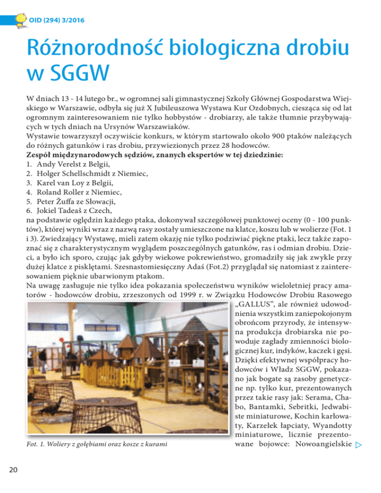 OID (294) 3/2016 Różnorodność biologiczna drobiu w SGGW W dniach 13 - 14 lutego br., w ogromnej sali gimnastycznej Szkoły Głównej Gospodarstwa Wiejskiego w Warszawie, odbyła się już X Jubileuszowa Wystawa Kur Ozdobnych, ciesząca się od lat ogromnym zainteresowaniem nie tylko hobbystów - drobiarzy, ale także tłumnie przybywających w tych dniach na Ursynów Warszawiaków. Wystawie towarzyszył oczywiście konkurs, w którym startowało około 900 ptaków należących do różnych gatunków i ras drobiu, przywiezionych przez 28 hodowców. Zespół międzynarodowych sędziów, znanych ekspertów w tej dziedzinie: 1. Andy Verelst z Belgii, 2. Holger Schellschmidt z Niemiec, 3. Karel van Loy z Belgii, 4. Roland Roller z Niemiec, 5. Peter Žuffa ze Słowacji, 6. Jokiel Tadeaš z Czech, na podstawie oględzin każdego ptaka, dokonywał szczegółowej punktowej oceny (0 - 100 punktów), której wyniki wraz z nazwą rasy zostały umieszczone na klatce, koszu lub w wolierze (Fot. 1 i 3). Zwiedzający Wystawę, mieli zatem okazję nie tylko podziwiać piękne ptaki, lecz także zapoznać się z charakterystycznym wyglądem poszczególnych gatunków, ras i odmian drobiu. Dzieci, a było ich sporo, czując jak gdyby wiekowe pokrewieństwo, gromadziły się jak zwykle przy dużej klatce z pisklętami. Szesnastomiesięczny Adaś (Fot.2) przyglądał się natomiast z zainteresowaniem pięknie ubarwionym ptakom. Na uwagę zasługuje nie tylko idea pokazania społeczeństwu wyników wieloletniej pracy amatorów - hodowców drobiu, zrzeszonych od 1999 r. w Związku Hodowców Drobiu Rasowego „GALLUS”, ale również udowodnienia wszystkim zaniepokojonym obrońcom przyrody, że intensywna produkcja drobiarska nie powoduje zagłady zmienności biologicznej kur, indyków, kaczek i gęsi. Dzięki efektywnej współpracy hodowców i Władz SGGW, pokazano jak bogate są zasoby genetyczne np. tylko kur, prezentowanych przez takie rasy jak: Serama, Chabo, Bantamki, Sebritki, Jedwabiste miniaturowe, Kochin karłowaty, Karzełek łapciaty, Wyandotty miniaturowe, licznie prezentoFot. 1. Woliery z gołębiami oraz kosze z kurami wane bojowce: Nowoangielskie 20 AKTUALNOŚCI 21 OID (294) 3/2016 miniaturowe, Staroangielskie miniaturowe, Ko-schamo, Kyo-chibi, Tosa-chibi, Asil miniaturowe, Orłowskie miniaturowe, Lutyjskie miniaturowe, Burgijskie miniaturowe, Tuzo, la Manche, Yakido, Jawoajskie, Asil Pakistańskie, Asil, Asil Reza, Madras, Galoirlandzkie, Indyjskie miniaturowe, Indyjskie, Gallo brazylijskie, Bojowce turecke Hint, Shamo, Lutyjskie, Malajskie, Staroangielskie; Holenderskie biało czube miniaturowe, Jedwabiste, Gołoszyjki miniaturowe, Hamburskie miniaturowe, Brakle miniaturowe, Appenzeller czubate, Sumatra miniaturowe, Feniks miniaturowe, Barkel, Włoszki, Maranas, Araukana, Mechelner, Gołoszyjki, Brahama, Kochin, Wyandotty, Sułtany, Koeyoshi, Tomaru, Denzili, Feniky, Satsumadori, Sumatra, Hamburskie, Cubalaya, Ohiki i inne. Hodowcy z kolei mogli zapoznać się na Wystawie z nowymi rodzajami wylęgowych aparatów, sprzętem drobiarskim oraz z atrakcyjnymi rozwiązaniami technicznymi „budek” do chowu drobiu”. Uzupełnieniem wystawy domowego, ale rasowego ptactwa, było stanowisko Koła Naukowego „AVES” zajmującego się bardzo szlachetnym sportem jakim jest sokolnictwo. Koło to eksponowało oswojone, drapieżne ptaki (sowę i myszołowa), przyuczone do siadania na rękawicy ” urodziwych „sokolniczek”. Fot. 2. Zainteresowany Adaś Wieczorem, 13 lutego br., w budyn– może przyszły hodowca drobiu ozdobnego ku Wydziału Nauki o Zwierzętach odbył się tradycyjny Bal Zdechłego Koguta, na którym Prezes HZDR „GALLUS”, pani dr Monika Łukasiewicz w towarzystwie znanego hodowcy, prof. Leona Tarasewicza, przekazali hodowcom nagrody w postaci „Złotej klatki” - najlepszemu i „Honorowego Szpadla”, który w tym sezonie miał niepowodzenia hodowlane (Fot. 4). Na podkreślenie zasługuje, że nagrodzeni to bardzo młodzi hodowcy, co rokuje dobre perspektywy dla rozwoju w Polsce amatorskiej hodowli ozdobnego drobiu rasowego. Wśród oklaskujących nagroFot. 3. Imponująco prezentująca się hala wystawowa 22 AKTUALNOŚCI 23 OID (294) 3/2016 dzonych, nie zabrakło Prorektora SGGW prof. Jana Niemca i Dziekan Wydziału Nauki o Zwierzętach SGGW pani Prof. Wandy Olech. Do tak udanej drobiarskiej imprezy przyczynili się między innymi główni sponsorzy (PKO Bank Polski, ENERTON, Tabot Galeria Sztuki Współczesnej) oraz Medialni Radiowa „Trójka”, miesięcznik Polskie Drobiarstwo, Fauna i Flora, Polski Związek Krótkofalowców). W niedzielę (14.02.2016) gromadnie przybyły na Wystawę rodziny Fot. 4. Organizatorzy, dr Monika Łukasiewicz warszawiaków z dziećmi i wnui prof. Leon Tarasiewicz przed wręczeniem dwóch skrajnych nagród kami, by podziwiać biologiczną różnorodność i urodę drobiu. Należy podkreślić, że ta forma ochrony przed zagładą ginących ras i genotypów drobiu nie jest finansowana przez Ministerstwo Rolnictwa i Rozwoju Wsi oraz przez Unię Europejską, a działa wyłącznie z inicjatywy indywidualnych amatorów hodowców drobiu. dla 24 16 wa rs zł tw y 2 cm