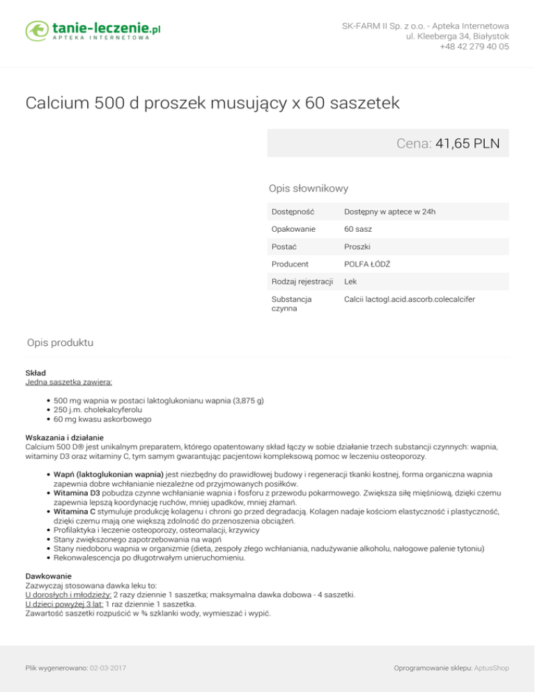 SK-FARM II Sp. z o.o. - Apteka Internetowa ul. Kleeberga 34, Białystok +48 42 279 40 05 Calcium 500 d proszek musujący x 60 saszetek Cena: 41,65 PLN Opis słownikowy Dostępność Dostępny w aptece w 24h Opakowanie 60 sasz Postać Proszki Producent POLFA ŁÓDŹ Rodzaj rejestracji Lek Substancja czynna Calcii lactogl.acid.ascorb.colecalcifer Opis produktu Skład Jedna saszetka zawiera: 500 mg wapnia w postaci laktoglukonianu wapnia (3,875 g) 250 j.m. cholekalcyferolu 60 mg kwasu askorbowego Wskazania i działanie Calcium 500 D® jest unikalnym preparatem, którego opatentowany skład łączy w sobie działanie trzech substancji czynnych: wapnia, witaminy D3 oraz witaminy C, tym samym gwarantując pacjentowi kompleksową pomoc w leczeniu osteoporozy. Wapń (laktoglukonian wapnia) jest niezbędny do prawidłowej budowy i regeneracji tkanki kostnej, forma organiczna wapnia zapewnia dobre wchłanianie niezależne od przyjmowanych posiłków. Witamina D3 pobudza czynne wchłanianie wapnia i fosforu z przewodu pokarmowego. Zwiększa siłę mięśniową, dzięki czemu zapewnia lepszą koordynację ruchów, mniej upadków, mniej złamań. Witamina C stymuluje produkcję kolagenu i chroni go przed degradacją. Kolagen nadaje kościom elastyczność i plastyczność, dzięki czemu mają one większą zdolność do przenoszenia obciążeń. Profilaktyka i leczenie osteoporozy, osteomalacji, krzywicy Stany zwiększonego zapotrzebowania na wapń Stany niedoboru wapnia w organizmie (dieta, zespoły złego wchłaniania, nadużywanie alkoholu, nałogowe palenie tytoniu) Rekonwalescencja po długotrwałym unieruchomieniu. Dawkowanie Zazwyczaj stosowana dawka leku to: U dorosłych i młodzieży: 2 razy dziennie 1 saszetka; maksymalna dawka dobowa - 4 saszetki. U dzieci powyżej 3 lat: 1 raz dziennie 1 saszetka. Zawartość saszetki rozpuścić w ¾ szklanki wody, wymieszać i wypić. Plik wygenerowano: 02-03-2017 Oprogramowanie sklepu: AptusShop SK-FARM II Sp. z o.o. - Apteka Internetowa ul. Kleeberga 34, Białystok +48 42 279 40 05 Przeciwwskazania Leku nie należy stosować przy nadwrażliwości na składniki leku, u dzieci poniżej 3 lat, w hiperkalcemii (w przebiegu nadczynności przytarczyc, niedoczynności tarczycy, rozsianych chorób nowotworowych:przerzuty do kości, szpiczak mnogi; w przebiegu sarkoidozy, hiperwitaminozy D). Calcium 500D nie powinien być stosowany także w niewydolności nerek z hiperfosfatemią (ryzyko odkładania się złogów), u osób z fenyloketonurią, hiperkalciurią oraz w kamicy nerkowej wapniowej. Przed zastosowaniem w okresie ciąży i karmienia piersią należy skonsultować się z lekarzem. Więcej informacji znajduje się w ulotce dostępnej w zakładce Załączniki. Informacje dodatkowe Przed użyciem zapoznaj się z ulotką dołączoną do opakowania, która zawiera wskazania, przeciwwskazania, dane dotyczące działań niepożądanych i dawkowanie oraz informacje dotyczące stosowania i przechowywania produktu leczniczego, bądź skonsultuj się z lekarzem lub farmaceutą, gdyż każdy lek niewłaściwie stosowany zagraża Twojemu życiu lub zdrowiu. Służymy Państwu pomocą pod adresem [email protected]. Plik wygenerowano: 02-03-2017 Powered by TCPDF (www.tcpdf.org) Oprogramowanie sklepu: AptusShop