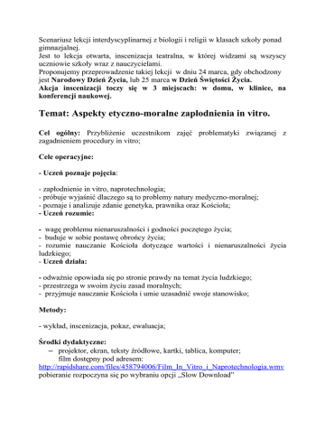 Scenariusz lekcji interdyscyplinarnej z biologii i religii w klasach szkoły ponad gimnazjalnej. Jest to lekcja otwarta, inscenizacja teatralna, w której widzami są wszyscy uczniowie szkoły wraz z nauczycielami. Proponujemy przeprowadzenie takiej lekcji w dniu 24 marca, gdy obchodzony jest Narodowy Dzień Życia, lub 25 marca w Dzień Świętości Życia. Akcja inscenizacji toczy się w 3 miejscach: w domu, w klinice, na konferencji naukowej. Temat: Aspekty etyczno-moralne zapłodnienia in vitro. Cel ogólny: Przybliżenie uczestnikom zajęć problematyki związanej z zagadnieniem procedury in vitro; Cele operacyjne: - Uczeń poznaje pojęcia: - zapłodnienie in vitro, naprotechnologia; - próbuje wyjaśnić dlaczego są to problemy natury medyczno-moralnej; - poznaje i analizuje zdanie genetyka, prawnika oraz Kościoła; - Uczeń rozumie: - wagę problemu nienaruszalności i godności poczętego życia; - buduje w sobie postawę obrońcy życia; - rozumie nauczanie Kościoła dotyczące wartości i nienaruszalności życia ludzkiego; - Uczeń działa: - odważnie opowiada się po stronie prawdy na temat życia ludzkiego; - przestrzega w swoim życiu zasad moralnych; - przyjmuje nauczanie Kościoła i umie uzasadnić swoje stanowisko; Metody: - wykład, inscenizacja, pokaz, ewaluacja; Środki dydaktyczne: – projektor, ekran, teksty źródłowe, kartki, tablica, komputer; film dostępny pod adresem: http://rapidshare.com/files/458794006/Film_In_Vitro_i_Naprotechnologia.wmv pobieranie rozpoczyna się po wybraniu opcji „Slow Download” Wprowadzenie (katecheta, nauczyciel) Powitanie i modlitwa w intencji poszanowania życia ludzkiego. Prowadzący zajęcia informuje, że: 25 marca każdego roku w Uroczystość Zwiastowania Pańskiego – cały katolicki świat przeżywa Dzień Świętości Życia. W tym dniu w sposób szczególny spoglądamy nie tylko na własne życie, które jest wielkim darem Stwórcy, ale jest to okazja, aby zatroszczyć się o życie najbardziej bezbronnych, poczętych ale jeszcze nienarodzonych istot ludzkich. Poruszany problem in vitro jest w środowisku uczniowskim zagadnieniem znanym aczkolwiek nie zawsze prawidłowo rozumianym. Dlatego zaproponowana lekcja, łącząca problemy biologii, medycyny i etyki, jest doskonałym momentem, w którym mamy możliwość dokonania weryfikacji własnych przemyśleń i ustosunkowania się do wyżej wymienionych tematów. W dzisiejszych czasach pojawił się bolesny problem dotykający coraz więcej młodych małżeństw, a mianowicie niepłodność. Grupa małżeństw, która nie może mieć dzieci jest coraz większa. Z uwagi na znaczną częstość występowania niepłodność stała się problemem społecznym i stanowi zarazem istotny problem kliniczny. Może to dotyczyć także was w przyszłości. Szukanie sposobu jej leczenia, rodzaju pomocy w przyjściu na świat upragnionego dziecka, to główne cele medycyny rozrodu człowieka. Zgodnie z najnowszymi rekomendacjami leczenie niepłodności winno być uwieńczone narodzinami zdrowego dziecka. Jako ludzie jeszcze bardzo młodzi, jesteście ludźmi przyszłości – przed wami decyzje, które musicie podjąć, a które zaważą na całym waszym dorosłym życiu. Czy łatwo jest podejmować dobre decyzje? Dzisiejsze spotkanie jest próbą wejścia w ten proces. Patrząc na przygotowaną inscenizację zwróćmy uwagę jak wiele możliwości technicznych z pominięciem zasad etyki proponuje współczesny świat. Za tymi scenariuszami kryją się postawy negujące godność ludzką. Spróbujcie wykorzystać ten czas, by zrozumieć trudny problem niepłodności i umieć w przyszłości dokonywać właściwych wyborów? Czy jedynym rozwiązaniem, jak sądzi większość, jest in vitro? A może istnieje jakaś inna możliwość. Rozwinięcie: Wczujmy się w sytuację małżeństwa, które bezskutecznie od kilku lat oczekuje na upragnione dziecko. Pomogą nam zrozumieć tę sytuację wasi koledzy odgrywający rolę małżonków - Kariny i Arka Inscenizacja: Dom - Karina w magazynie kolorowym ogląda zdjęcia dzieci Żona: Być matką - dlaczego tyle kobiet doświadcza tego stanu tylko nie ja ? Dlaczego nie możemy być rodzicami? Mąż – Tak, to prawda, ale wiesz kochanie mam dla nas fantastyczną propozycję, znalazłem rozwiązanie naszych kłopotów. To będzie nasza tajemnica. Zobacz (podaje jej ulotkę reklamującą klinikę in vitro) Żona - musimy tam pojechać. W tej klinice na pewno nam pomogą! Wreszcie będziemy mieć dziecko! Filmik Lekarz: Witam Państwa serdecznie w naszej klinice. Zapewne Państwo chcą się dowiedzieć jaka istnieje możliwość pomocy małżeństwom borykającym się z niepłodnością. Są następujące sposoby: 1-nadzór nad naturalnym cyklem kobiety 2-współżycie naturalne zostaje zastąpione inseminacjami 3-metoda zapłodnienia pozaustrojowego, czyli program in vitro Rozumiem, że Państwo zainteresowani są trzecim sposobem. W Polsce pierwsze dziecko poczęte w wyniku zastosowania metody in vitro przyszło na świat w 1987 r. Od tego czasu w naszym kraju urodziło się ok. 30 tys. dzieci. Arek: -proszę nam objaśnić na czym polega procedura in vitro Lekarz: - w obrębie programu wyróżniamy 2 etapy: pierwszy farmakologiczny, podajemy leki kobiecie, aby doprowadzić do pojawienia się pęcherzyków Graafa w jajnikach. W pęcherzykach są zawarte komórki jajowe. Następnie to etap biotechnologiczny: pacjentka poddana jest punkcji jajników, w czasie której wydobywa się poza jej organizm komórki jajowe z uzyskanych uprzednio pęcherzyków. Potem komórki jajowe łączone są z plemnikami. Poczęte istoty ludzkie przenoszone są do inkubatorów, gdzie następuje tzw. hodowla ludzkich zarodków. W 2,3 lub 5 dobie wybiera się najlepiej rokujące do dalszego życia zarodki, przeważnie dwa, by następnie dokonać transferu do jamy macicy. Pozostałe zarodki są zamrażane w temperaturze -190 stopni Celsjusza. Mrożenie jest procesem,