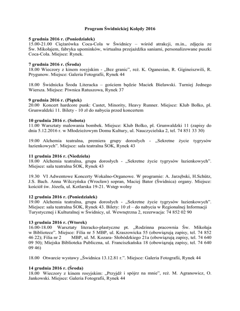 Program Świdnickiej Kolędy 2016 5 grudnia 2016 r. (Poniedziałek) 15.00-21.00 Ciężarówka Coca-Cola w Świdnicy – wśród atrakcji, m.in., zdjęcia ze Św. Mikołajem, fabryka upominków, wirtualna przejażdżka saniami, personalizowane puszki Coca-Cola. Miejsce: Rynek. 7 grudnia 2016 r. (Środa) 18.00 Wieczory z kinem rosyjskim - „Bez granic”, reż. K. Oganesian, R. Gigineiszwili, R. Prygunow. Miejsce: Galeria Fotografii, Rynek 44 18.00 Świdnicka Środa Literacka – gościem będzie Maciek Bielawski. Turniej Jednego Wiersza. Miejsce: Piwnica Ratuszowa, Rynek 37 9 grudnia 2016 r. (Piątek) 20.00 Koncert hardcore punk: Castet, Minority, Heavy Runner. Miejsce: Klub Bolko, pl. Grunwaldzki 11. Bilety - 10 zł do nabycia przed koncertem 10 grudnia 2016 r. (Sobota) 11.00 Warsztaty malowania bombek. Miejsce: Klub Bolko, pl. Grunwaldzki 11 (zapisy do dnia 5.12.2016 r. w Młodzieżowym Domu Kultury, ul. Nauczycielska 2, tel. 74 851 33 30) 19.00 Alchemia teatralna, premiera grupy dorosłych - „Sekretne życie tygrysów łazienkowych”. Miejsce: sala teatralna ŚOK, Rynek 43 11 grudnia 2016 r. (Niedziela) 18.00 Alchemia teatralna, grupa dorosłych - „Sekretne życie tygrysów łazienkowych”. Miejsce: sala teatralna ŚOK, Rynek 43 19.30 VI Adwentowe Koncerty Wokalno-Organowe. W programie: A. Jarzębski, H.Schütz, J.S. Bach. Anna Wilczyńska (Wrocław) sopran, Maciej Bator (Świdnica) organy. Miejsce: kościół św. Józefa, ul. Kotlarska 19-21. Wstęp wolny 12 grudnia 2016 r. (Poniedziałek) 19.00 Alchemia teatralna, grupa dorosłych - „Sekretne życie tygrysów łazienkowych”. Miejsce: sala teatralna ŚOK, Rynek 43. Bilety: 10 zł – do nabycia w Regionalnej Informacji Turystycznej i Kulturalnej w Świdnicy, ul. Wewnętrzna 2, rezerwacja: 74 852 02 90 13 grudnia 2016 r. (Wtorek) 16.00-18.00 Warsztaty literacko-plastyczne pt. „Rodzinna pracownia Św. Mikołaja w Bibliotece”. Miejsce: Filia nr 5 MBP, ul. Kraszowicka 55 (obowiązują zapisy, tel. 74 852 46 22); Filia nr 2 MBP, ul. M. Kozara- Słobódzkiego 21a (obowiązują zapisy, tel. 74 640 09 50); Miejska Biblioteka Publiczna, ul. Franciszkańska 18 (obowiązują zapisy, tel. 74 640 09 46) 18.00 Otwarcie wystawy „Świdnica 13.12.81 r.”. Miejsce: Galeria Fotografii, Rynek 44 14 grudnia 2016 r. (Środa) 18.00 Wieczory z kinem rosyjskim: „Przyjdź i spójrz na mnie”, reż. M. Agranowicz, O. Jankowski. Miejsce: Galeria Fotografii, Rynek 44 15 grudnia 2016 r. (Czwartek) 10.00-18.00 Jarmark Bożonarodzeniowy 16.00-19.00 Festiwal stołów i dekoracji świątecznych. Miejsce: Galeria Świdnicka, ul. Westerplatte 29. Organizator: Zespół Szkół Hotelarsko-Turystycznych 16 grudnia 2016 r. (Piątek) 10.00-19.00 Jarmark Bożonarodzeniowy 14.00-15.00 „Słodkie upominki od Region Fakty”. Miejsce: Rynek 14.00-17.00 Rynku Konik „Kometek” z Mikołajem w Rynku - darmowe przejażdżki dla dzieci po 17.00 Wigilia organizacji pozarządowych. Miejsce: Centrum Organizacji Pozarządowych, ul. Długa 33 17.00 VIII Międzyszkolny Konkurs Kolęd i Pastorałek dla dzieci w wieku przedszkolnym. W programie: kiermasz ozdób i stroików świątecznych, kącik rękodzieła, kawiarenka „Pod reniferem”, wspólne śpiewanie kolęd i pastorałek. Miejsce: sala teatralna ŚOK, Rynek 43. Organizator: Szkoła Podstawowa nr 315 17.30 Milan Lhotak – Trutnov - wernisaż wystawy fotograficznej. Miejsce: Wieża Ratuszowa 18.00 Wernisaż wystawy plastycznej „Świdnicka Szopka Bożonarodzeniowa”. Miejsce: Muzeum Dawnego Kupiectwa, Rynek 37 19.00 „Sportowa Kolęda” – ognisko z pieczeniem kiełbasek i barszczykiem. Miejsce: plac przed lodowiskiem, ul. Śląska 35 17 grudnia 2016 r. (Sobota) 10.00-19.00 Jarmark Bożonarodzeniowy 12.00-15.00 W blasku odblasków – konna Straż Miejska rozdaje dzieciom gadżety odblaskowe i łakocie. Miejsce: Rynek 12.00-16.00 Domek Świętego Mikołaja – atrakcje dla dzieci w towarzystwie prawdziwego Mikołaja i jego pomocnika Skrzata, przygotowane przez firmę Ale Heca 12.00-16.00 Maxi gry dla dzieci przygotowane przez firmę Ale Heca 15.00-16.30 Teatr Prawdziwy „Mikołajkowa parada”. Miejsce: Rynek 18.00 Alchemia teatralna, grupa dorosłych - „Sekretne życie tygrysów łazienkowych”. Miejsce: sala teatralna ŚOK, Rynek 43 18 grudnia 2016 r. (Niedziela) 10.00-19.00 Jarmark Bożonarodzeniowy 13.00-15.00 W blasku odblasków – konna Straż Miejska rozdaje dzieciom gadżety odblaskowe i łakocie. Miejsce: Rynek 13.00-16.00 Wizyta Mikołaja i krasnali - Mikołaj będzie wręczał dzieciom prezenty przygotowane przez rodziców. Miejsce: Rynek 14.00-17.00 Rynku. Konik „Kometek” z Mikołajem w Rynku - darmowe przejażdżki dla dzieci po 16.30 Żywa Szopka „Jego natchnienie” – inscenizacja teatralna według tekstu Magdaleny Szarwaryn. Miejsce: Rynek 17.00 Świdnica24.pl rozdaje sianko 17.00 „Wigilia wszystkich Świdniczan”: przekazanie Gospodarzom światła betlejemskiego przez harcerzy; życzenia od Gospodarzy oraz przedstawicieli wyznań religijnych Świdnicy dla zebranych gości, dzielenie się opłatkiem i gorący barszczyk; - wspólne kolędowanie ze Świdnicką Scholą Cantorum Exultet. 19.30 VI Adwentowe Koncerty Wokalno-Organowe. W programie: A. Jarzębski, H.Schütz, J.S. Bach. Marcjanna Myrlak (Wrocław/Warszawa) mezzosopran, Dagmara Barna (Warszawa) sopran, Zuzanna Bator (Świdnica) organy. Miejsce: kościół św. Józefa, ul. Kotlarska 19-21. Wstęp wolny 19 grudnia 2016 r. (Poniedziałek) 10.00-19.00 Jarmark Bożonarodzeniowy 16.00-17.00 Spotkanie dla przyjaciół „Akademii Przedszkolaka”. Miejsce: sala teatralna ŚOK, Rynek 43 20 grudnia 2016 r. (Wtorek) 10.00-19.00 Jarmark Bożonarodzeniowy 17.00 Koncert Kolęd Młodzieżowego Domu Kultury. Miejsce: Klub Bolko, pl. Grunwaldzki 11 21 grudnia 2016 r. (Środa) 10.00-19.00 Jarmark Bożonarodzeniowy 16.00-18.00 Wieczornica Wigilijna. Miejsce: Klub Bolko, pl. Grunwaldzki 11 18.00 Koncert wigilijny chóru Pryma Voce. 