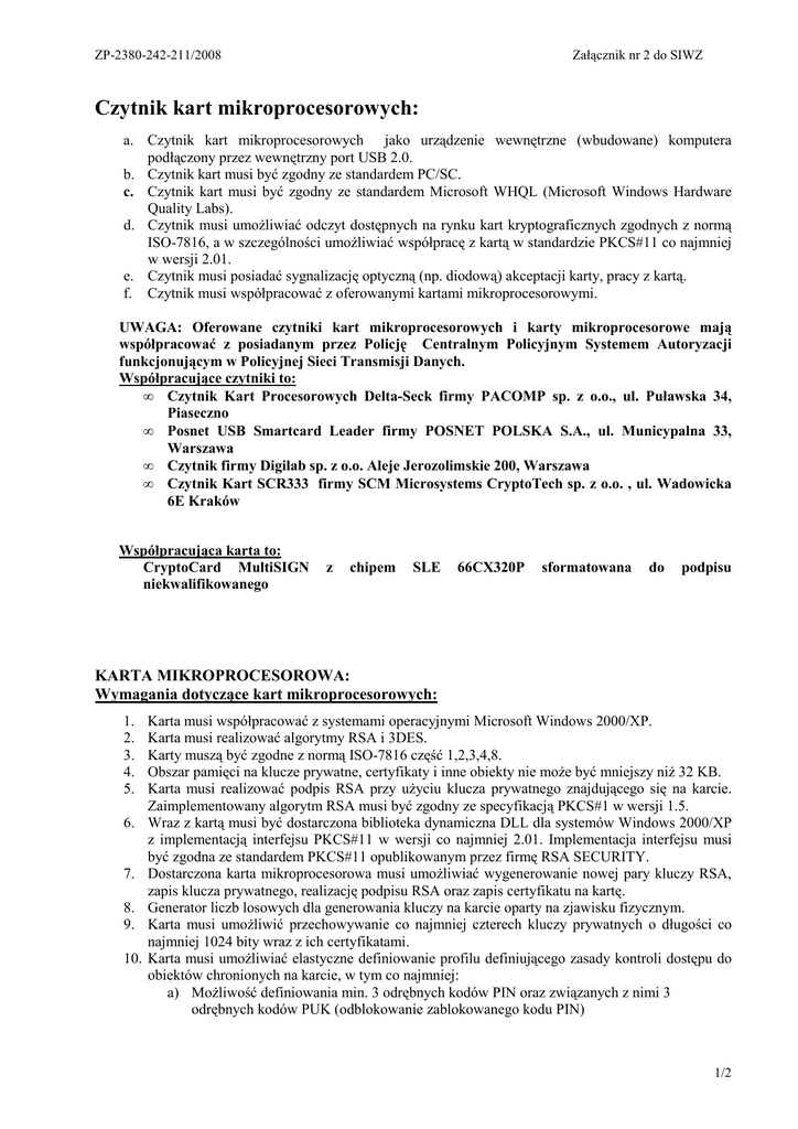 Załącznik nr 2 do siwz - opis czytnika i kart mikroprocesorowych
