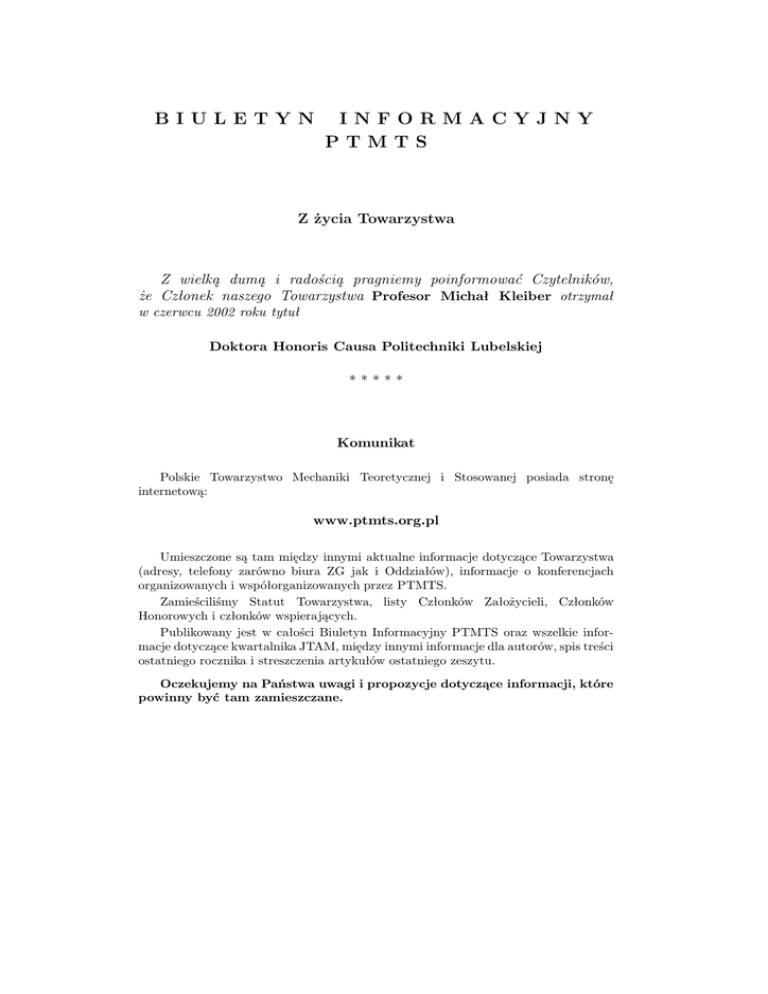 BIULETYN INFORMACYJNY PTMTS Z życia Towarzystwa Z wielką dumą i radością pragniemy poinformować Czytelników, że Członek naszego Towarzystwa Profesor Michał Kleiber otrzymał w czerwcu 2002 roku tytuł Doktora Honoris Causa Politechniki Lubelskiej ***** Komunikat Polskie Towarzystwo Mechaniki Teoretycznej i Stosowanej posiada stronę internetową: www.ptmts.org.pl Umieszczone są tam między innymi aktualne informacje dotyczące Towarzystwa (adresy, telefony zarówno biura ZG jak i Oddziałów), informacje o konferencjach organizowanych i współorganizowanych przez PTMTS. Zamieściliśmy Statut Towarzystwa, listy Członków Założycieli, Członków Honorowych i członków wspierających. Publikowany jest w całości Biuletyn Informacyjny PTMTS oraz wszelkie informacje dotyczące kwartalnika JTAM, między innymi informacje dla autorów, spis treści ostatniego rocznika i streszczenia artykułów ostatniego zeszytu. Oczekujemy na Państwa uwagi i propozycje dotyczące informacji, które powinny być tam zamieszczane. Jubileusz 35-lecia pracy naukowej oraz 60-lecia urodzin Profesora Andrzeja Tylikowskiego 16 maja 2002 r. na Wydziale Samochodów i Maszyn Roboczych Politechniki Warszawskiej odbyło się seminarium wydziałowe z okazji 35-lecia pracy naukowej oraz 60-lecia urodzin profesora Andrzeja Tylikowskiego. W seminarium wzięło udział wielu wybitnych przedstawicieli nauki, między innymi profesorowie: Wojciech Szczepiński (Wydział Nauk Technicznych PAN, Komitet Mechaniki), Bogdan Skalmierski (Komitet Mechaniki PAN), Janusz Kowal (Prorektor AGH), Zbigniew Engiel, Wojciech Batko i Tadeusz Uhl (Wydziału Inżynierii Mechanicznej i Robotyki AGH), Lech Dietrich (Instytut Podstaw Problemów Technicznych PAN), Witold Gutkowski (Wydział Nauk Technicznych PAN, Komitet Mechaniki), Jan Awrejcewicz (Katedra Automatyki i Biomechaniki Politechniki Łódzkiej), Tadeusz Kapitaniak (Katedra Dynamiki Maszyn Politechniki Łódzkiej), Józef Nizioł (Instytut Mechaniki i Podstaw Konstrukcji Maszyn Politechniki Krakowskiej), Eugeniusz Świtoński (przewodniczący Polskiego Towarzystwa Mechaniki Teoretycznej i Stosowanej, Katedra Mechaniki Stosowanej Politechniki Śląskiej). Obrady otworzył Dziekan Wydziału SiMR prof. Jan Szlagowski. Następnie bliscy współpracownicy Jubilata prof. Włodzimierz Kurnik i dr hab. Stanisław Radkowski przedstawili sylwetkę Profesora, Jego wybitne osiągnięcia i dokonania. Badania naukowe Jubilata dotyczą głównie problemów zastosowania teorii drgań, mechaniki stosowanej, teorii procesów stochastycznych w budowie maszyn i stanowią egzemplifikację Jego głębokiego przekonania, że postęp w budowie maszyn jest niemożliwy bez głębokiej analizy naukowej. W ramach problematyki teorii drgań szczególne znaczenie – według Profesora – ma badanie tłumienia drgań mechanicznych. Zainteresowanie tą tematyką wynika zarówno ze względów poznawczych, jak i aplikacyjnych. Tłumienie drgań następuje w wyniku działania zjawisk niedających się łatwo opisać matematycznie. Nieliniowe człony w równaniach powodują, że w ruchu układów nimi opisywanych pojawiają się nowe, nieznane poprzednio zjawiska. Ich wykrywanie i opis jest elementem rozwoju wiedzy w tym zakresie. Jednocześnie tłumienie drgań, zachodzące w układach mechanicznych, ma kapitalne znaczenie w ich eksploatacji. Brak tłumienia lub małe tłumienie powoduje występowanie niebezpiecznych zjawisk, takich jak rezonanse od sił zewnętrznych, zjawisko przeskoku, rezonanse parametryczne, drgania sub- i ultraharmoniczne. Często klasyczne tłumienie drgań jest niewystarczające i do układu należy wprowadzić aktywne tłumienie. Jest ono szczególnie cenne w układach zintegrowanych, gdzie elementy pomiarowe, wykonawcze twarzą kompozyt aktywny – konstrukcję inteligentną. W monografii Stochastyczna stateczność układów ciągłych wydanej w roku 1991, Jubilat przedstawił metody badania i problemy stochastycznej stateczności układów ciągłych. Koncentruje się w niej na omówieniu różnych wariantów metody bezpośredniej Lapunowa i metod konstrukcji funkcjonałów Lapunowa-Movchana. Metody dostosowano do dwóch szerokich klas zaburzeń stochastycznych: procesów o realizowalnych fizykalnie realizacjach i procesów typu białego szumu. Monografia jest podsumowaniem tematyki stateczności drgań typowych konstrukcji inżynierskich: belek, wałów, płyt kołowych i prostokątnych, powłok walcowych. Metody zastosowano również do nieklasycznych zagadnień stateczności wirujących wałów, przesuwających się taśm, elementów sprężystych z uwzględnieniem bezwładności rotacyjnej i ścinania. Warto zwrócić uwagę na serię prac Jubilata, w których przedstawia zagadnienia impulsowego obciążenia układów dyskretnych i ciągłych prowadzącego zarówno do drgań wymuszonych, jak i parametrycznych niezależnych i zależnych od stanu kinematycznego układu. To drugie zagadnienie umotywowane jest zainteresowaniem problematyką zjawisk udarowych, zachodzących między innymi w maszynach kruszących, kiedy to parametry zderzenia, takie jak prędkość cząstki, jego masa oraz przedział czasu między kolejnymi uderzeniami są losowe. Uwzględnienie tych zjawisk prowadzi do stochastycznych równań Itô-Gichmana, których stateczność jest zbadana. Podobne rozwiązanie zagadnienia drgań układów nieliniowych poddanych ciągowi impulsów sprowadzono do niedyfuzyjnych równań różniczkowo-całkowych względem gęstości prawdopodobieństwa przemieszczeń. Zagadnienia linearyzacji stochastycznej nieliniowych układów impulsowych opublikowano po raz pierwszy w International Journal of Nonlinear Mechanics. W naturalny sposób, podejmując zagadnienie dynamiki nieliniowych konstrukcji kompozytowych, Profesor skupia się nad problematyką wyznaczania obszarów stochastycznej stateczności laminowanych płyt i powłok z uwzględnieniem nieliniowości geometrycznych i