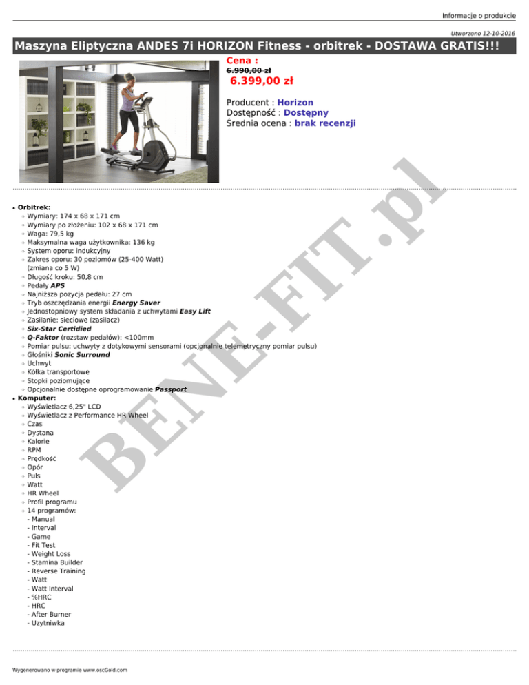Informacje o produkcie Utworzono 12-10-2016 Maszyna Eliptyczna ANDES 7i HORIZON Fitness - orbitrek - DOSTAWA GRATIS!!! Cena : 6.990,00 zł 6.399,00 zł ● .p l Producent : Horizon Dostępność : Dostępny Średnia ocena : brak recenzji Orbitrek: Wymiary: 174 x 68 x 171 cm Wymiary po złożeniu: 102 x 68 x 171 cm Waga: 79,5 kg Maksymalna waga użytkownika: 136 kg System oporu: indukcyjny Zakres oporu: 30 poziomów (25-400 Watt) (zmiana co 5 W) Długość kroku: 50,8 cm Pedały APS Najniższa pozycja pedału: 27 cm Tryb oszczędzania energii Energy Saver Jednostopniowy system składania z uchwytami Easy Lift Zasilanie: sieciowe (zasilacz) Six-Star Certidied Q-Faktor (rozstaw pedałów): <100mm Pomiar pulsu: uchwyty z dotykowymi sensorami (opcjonalnie telemetryczny pomiar pulsu) Głośniki Sonic Surround Uchwyt Kółka transportowe Stopki poziomujące Opcjonalnie dostępne oprogramowanie Passport Komputer: Wyświetlacz 6,25" LCD Wyświetlacz z Performance HR Wheel Czas Dystana Kalorie RPM Prędkość Opór Puls Watt HR Wheel Profil programu 14 programów: - Manual - Interval - Game - Fit Test - Weight Loss - Stamina Builder - Reverse Training - Watt - Watt Interval - %HRC - HRC - After Burner - Uzytniwka ❍ ❍ ❍ ❍ FI T ❍ ❍ ❍ ❍ ❍ ❍ ❍ ❍ ❍ ❍ ❍ ❍ ❍ ❍ ❍ ● ❍ ❍ ❍ ❍ ❍ ❍ ❍ ❍ ❍ ❍ ❍ B EN E- ❍ ❍ ❍ Wygenerowano w programie www.oscGold.com